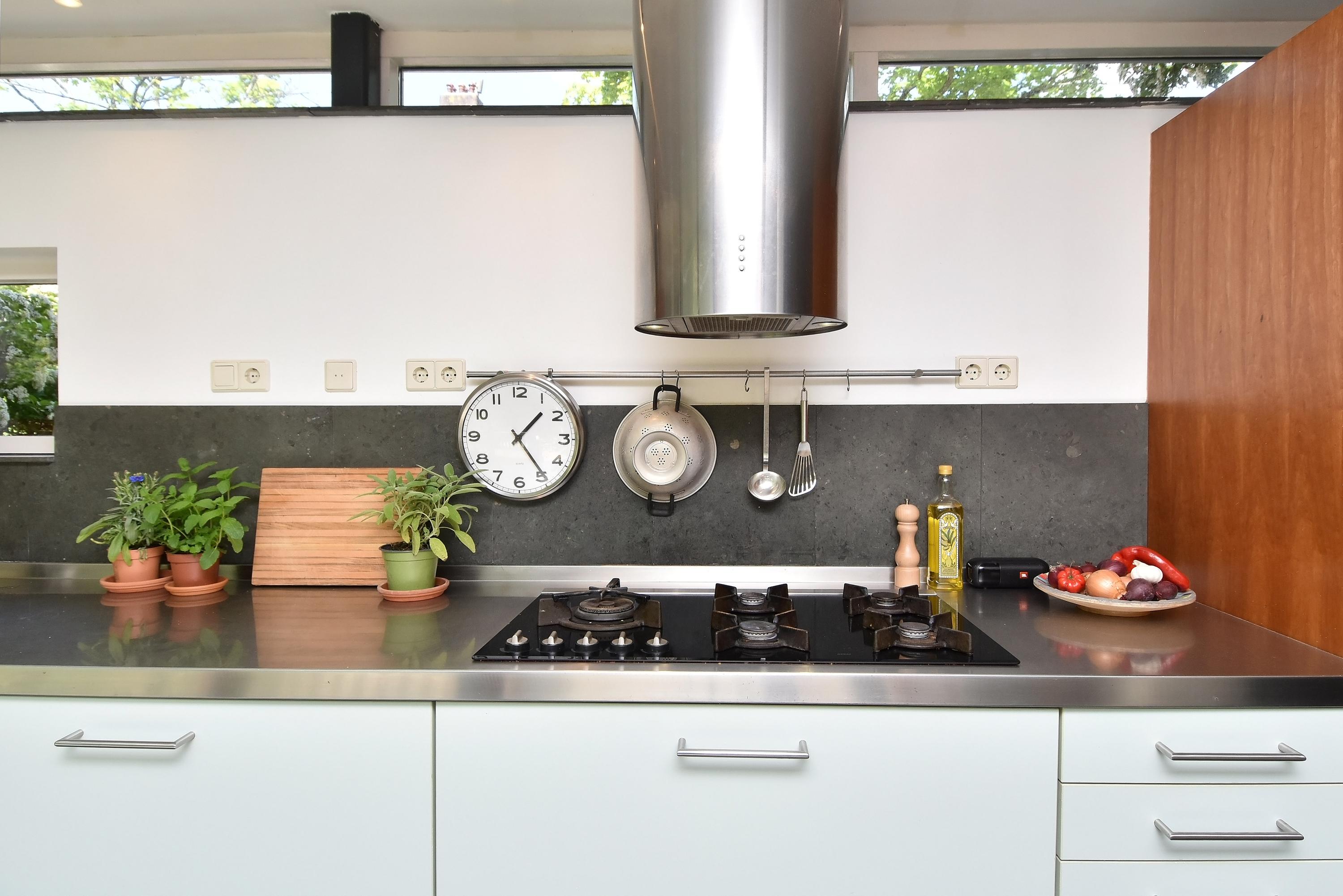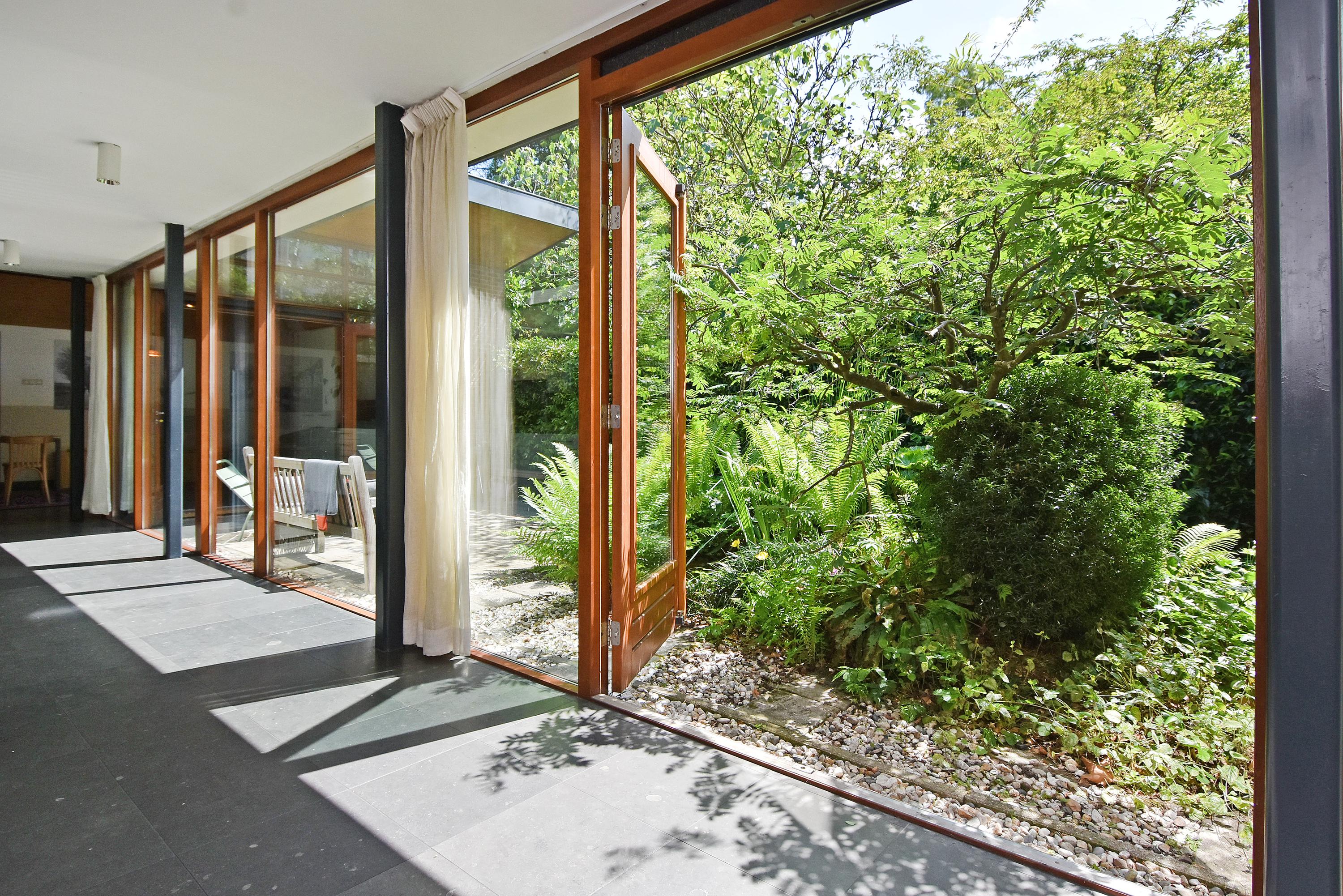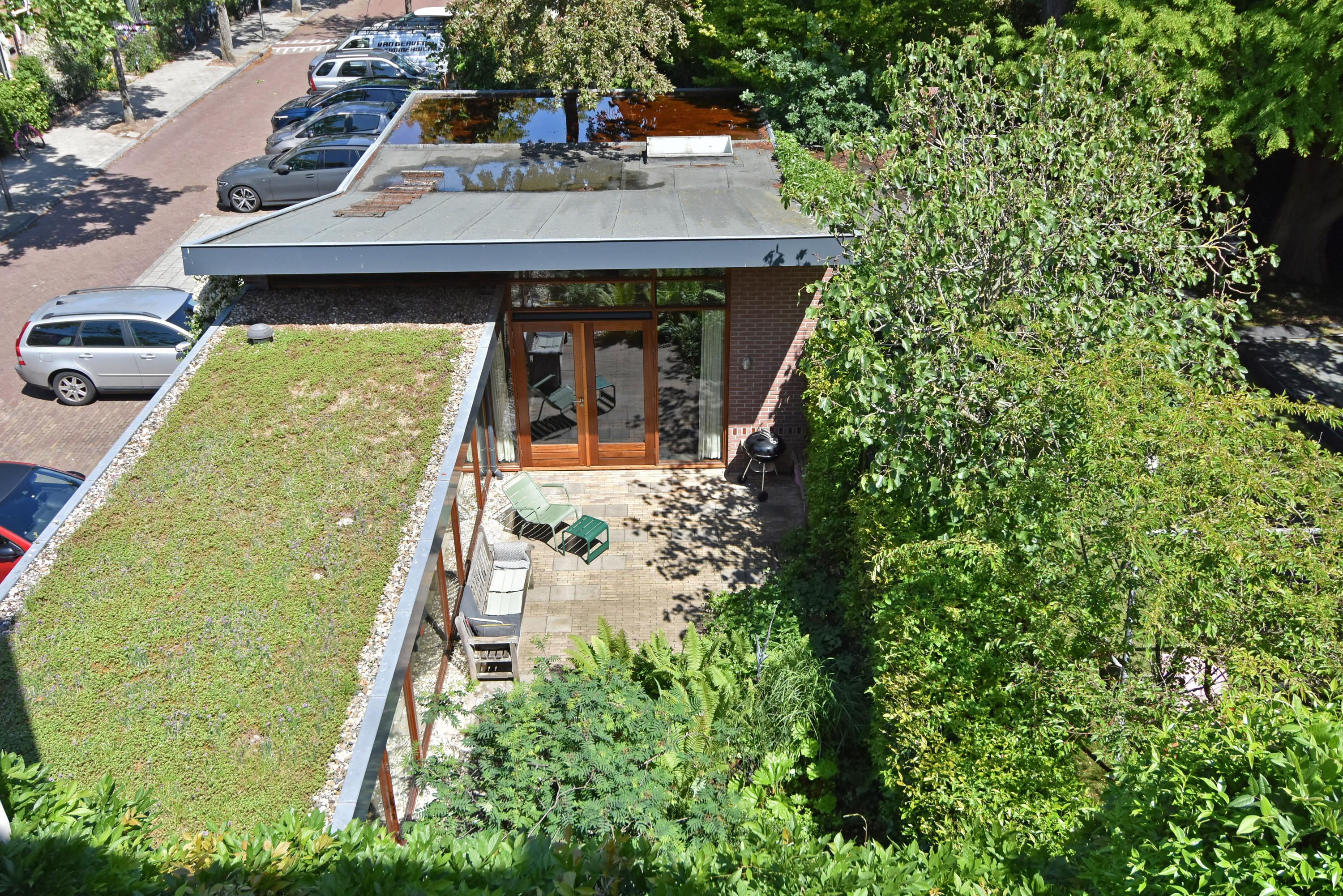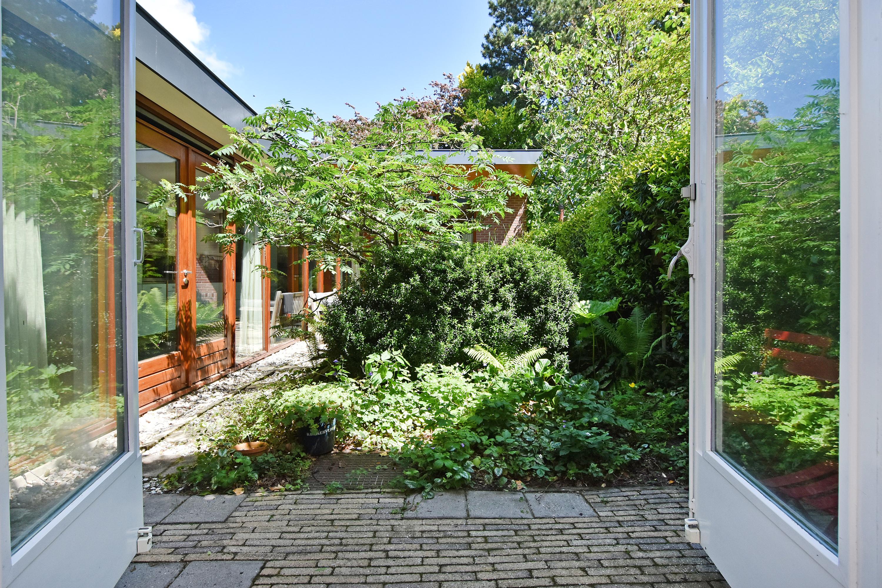 A modern extension forms a remarkable combination with the historic house. Here you will find a fully equipped and spacious kitchen, featuring a large block with stainless steel countertop, drawer units, excellent workspace, and many (designer) built-in appliances. Large windows provide unique views of the beautifully landscaped, lush, and sunny garden. Adjoining is a generous dining and music room, which also opens onto the back garden via French doors. This dining room also connects to the large garage at the rear, which benefits from daylight and can also be accessed via the side street.