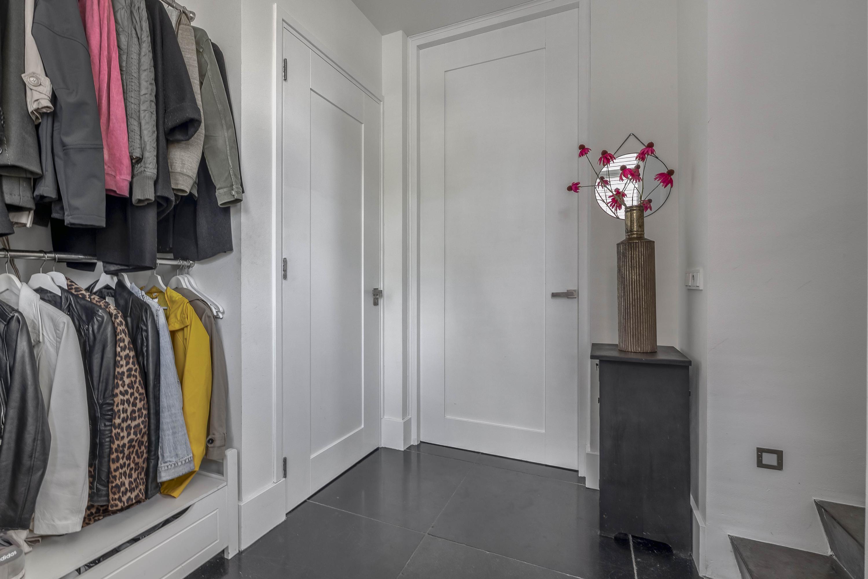 Through the spacious entrance with beautiful tiled floor, modern toilet and extensive meter cupboard, you enter the kitchen at the front of the house. This stylish and complete kitchen is the heart of the house and features a kitchen island, luxury appliances and plenty of workspace. Thanks to the raised floor level, you have a beautiful view of the street.