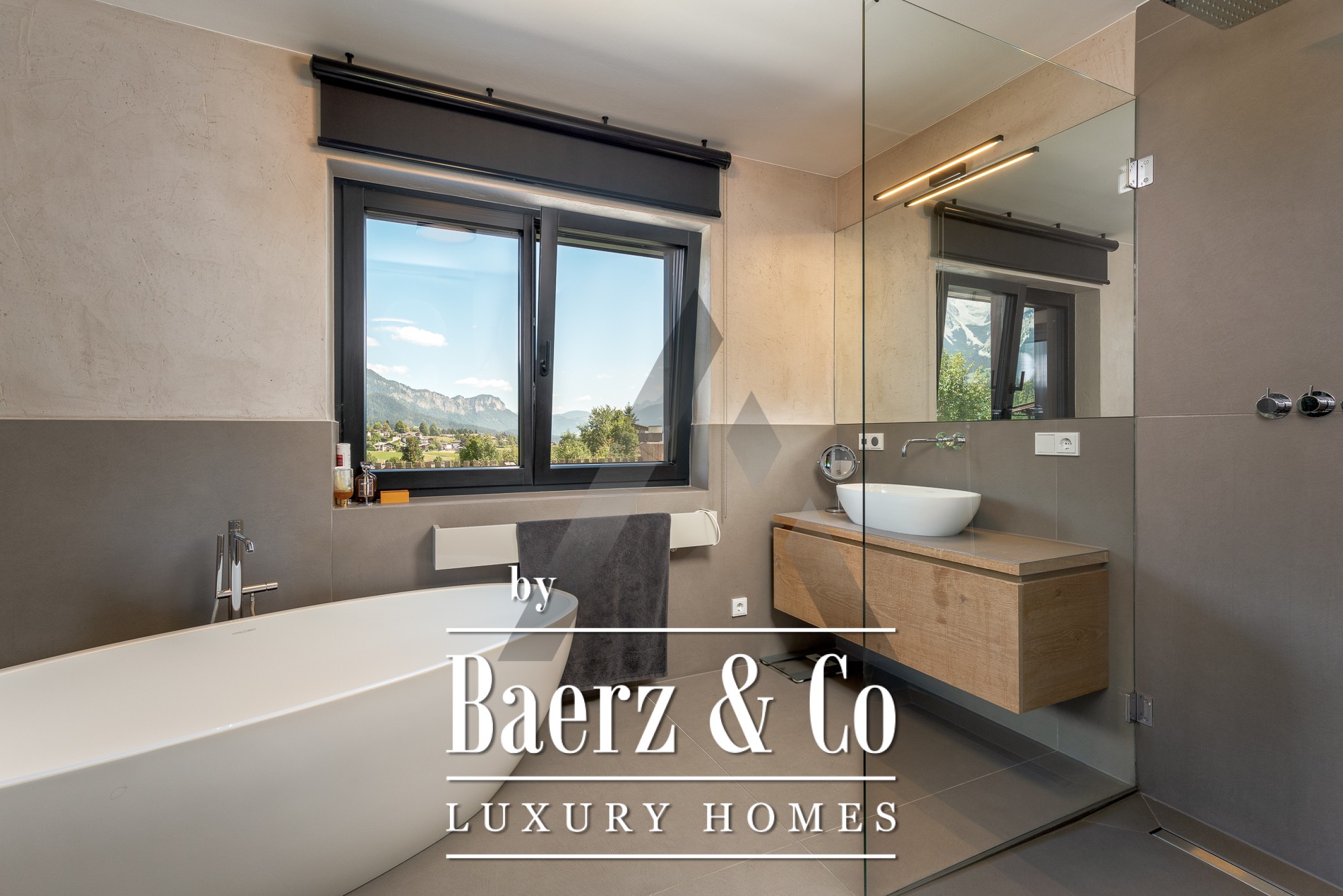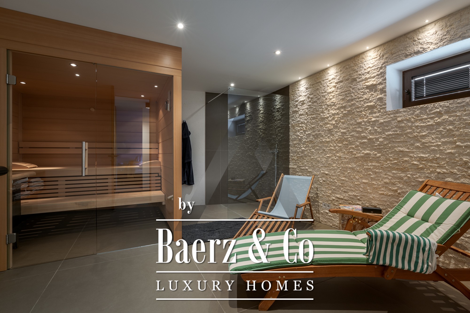 Three en-suite bedrooms offer privacy and comfort, including a suite in the basement opening to a beautifully lit well. Amenities include a Finnish sauna, gym, hobby room, and dedicated ski storage. Materials such as reclaimed wood and stone, along with elegant wood floors, reinforce a timeless alpine atmosphere. Secure parking is provided by an underground garage for two cars and additional carport spaces.