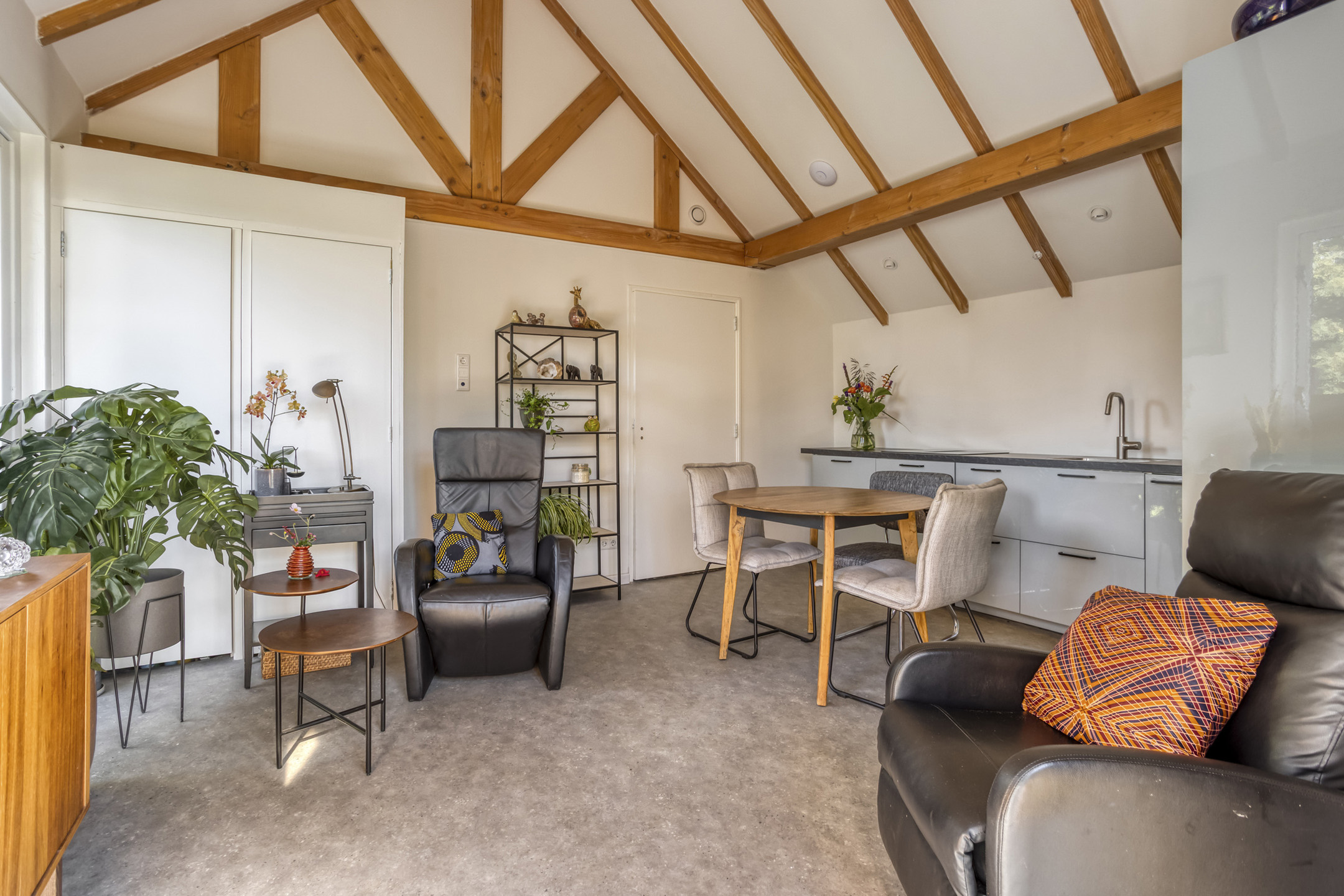 Bright and inviting, with French doors leading to the garden and a cozy wood-burning stove for winter nights. High ceilings and original exposed beams complete the picture. Part of the garage has been integrated into the living area, creating even more space! Planning an extension? The foundation is already in place.