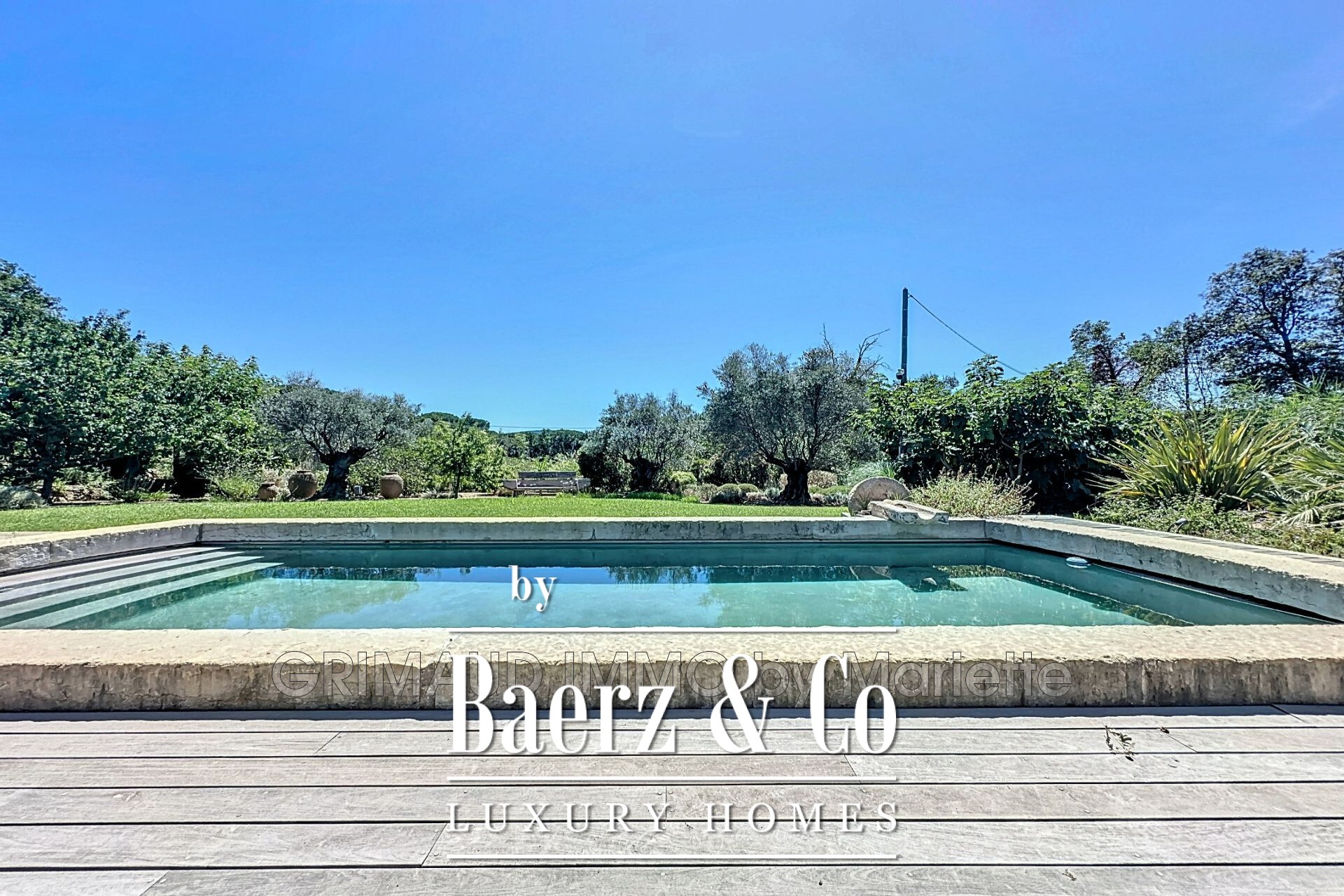 Single-story villa on 2,900m² of fenced garden with heated pool, overlooking the vineyards and within walking distance of the village of Grimaud, two detached garages and two garages attached to the house, a large carport comprising: entrance, guest toilet, a spacious living room with exposed beams and a large fireplace,