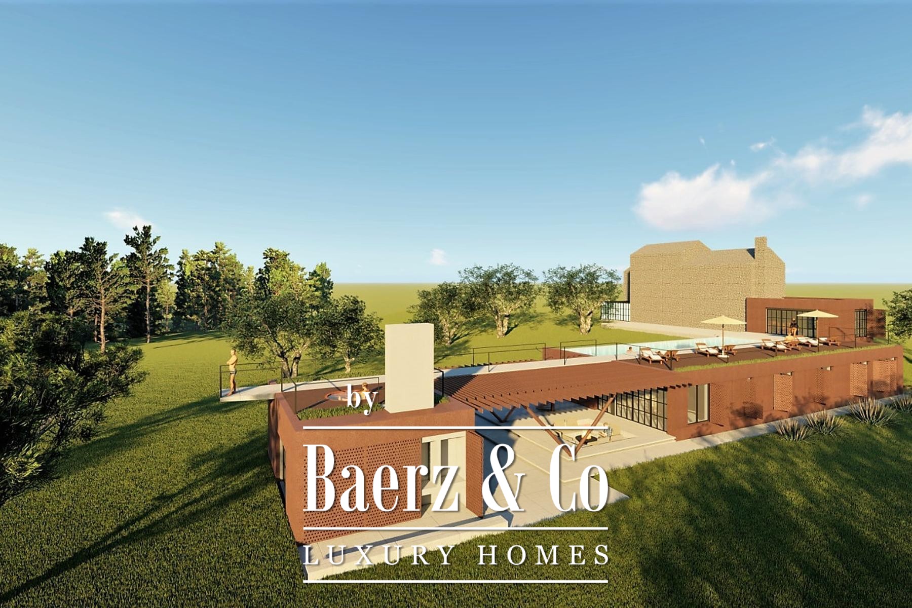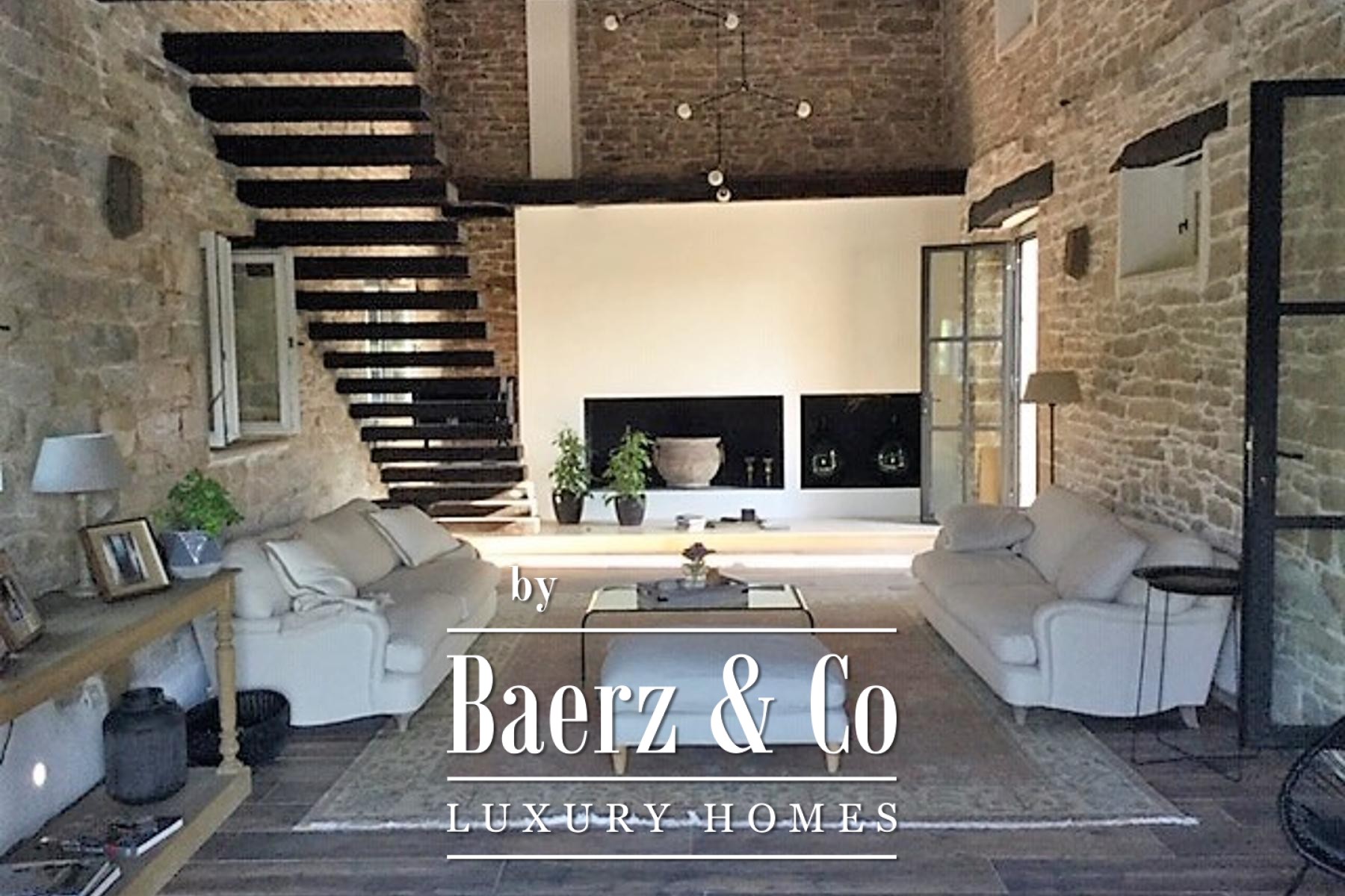 The modern building introduces elevated leisure, including a wellness area, media room, lounge space, and an 18-meter swimming pool with adjoining sunbathing terrace. There is provision for an additional poolside structure with a summer kitchen and wine cellar, offering a rare opportunity for personal customization, as the contemporary section remains under reconstruction.