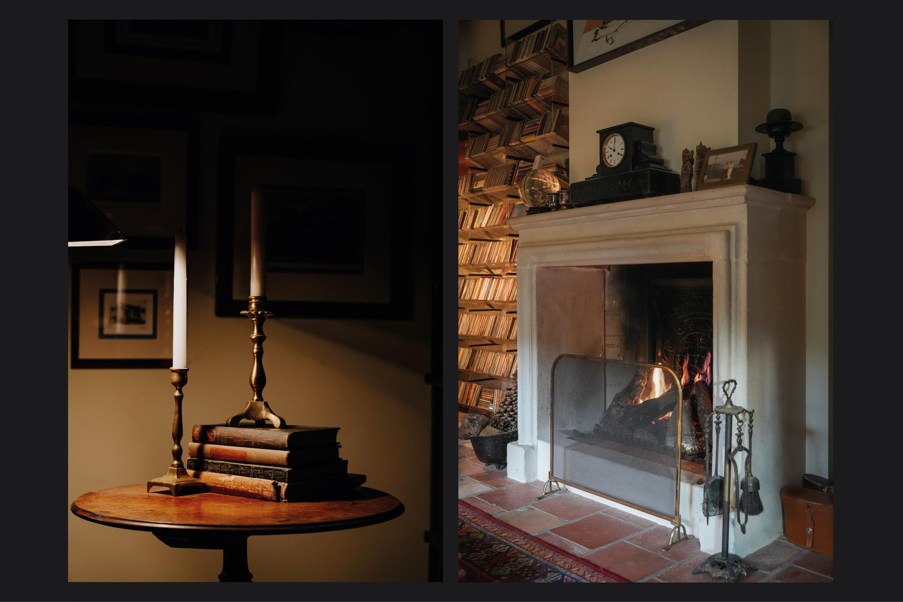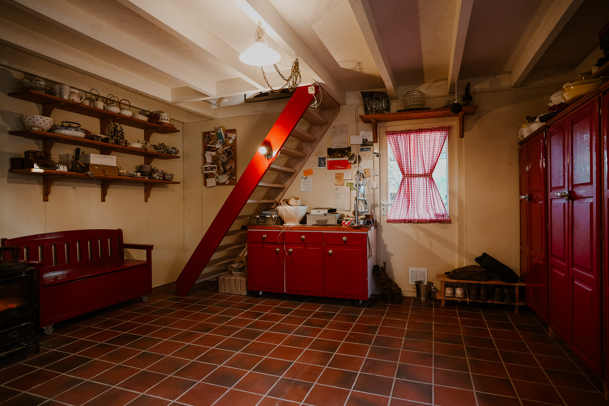 The kitchen includes several hand-crafted built-in bookcases, one of which conceals the entrance to the wine cellar.