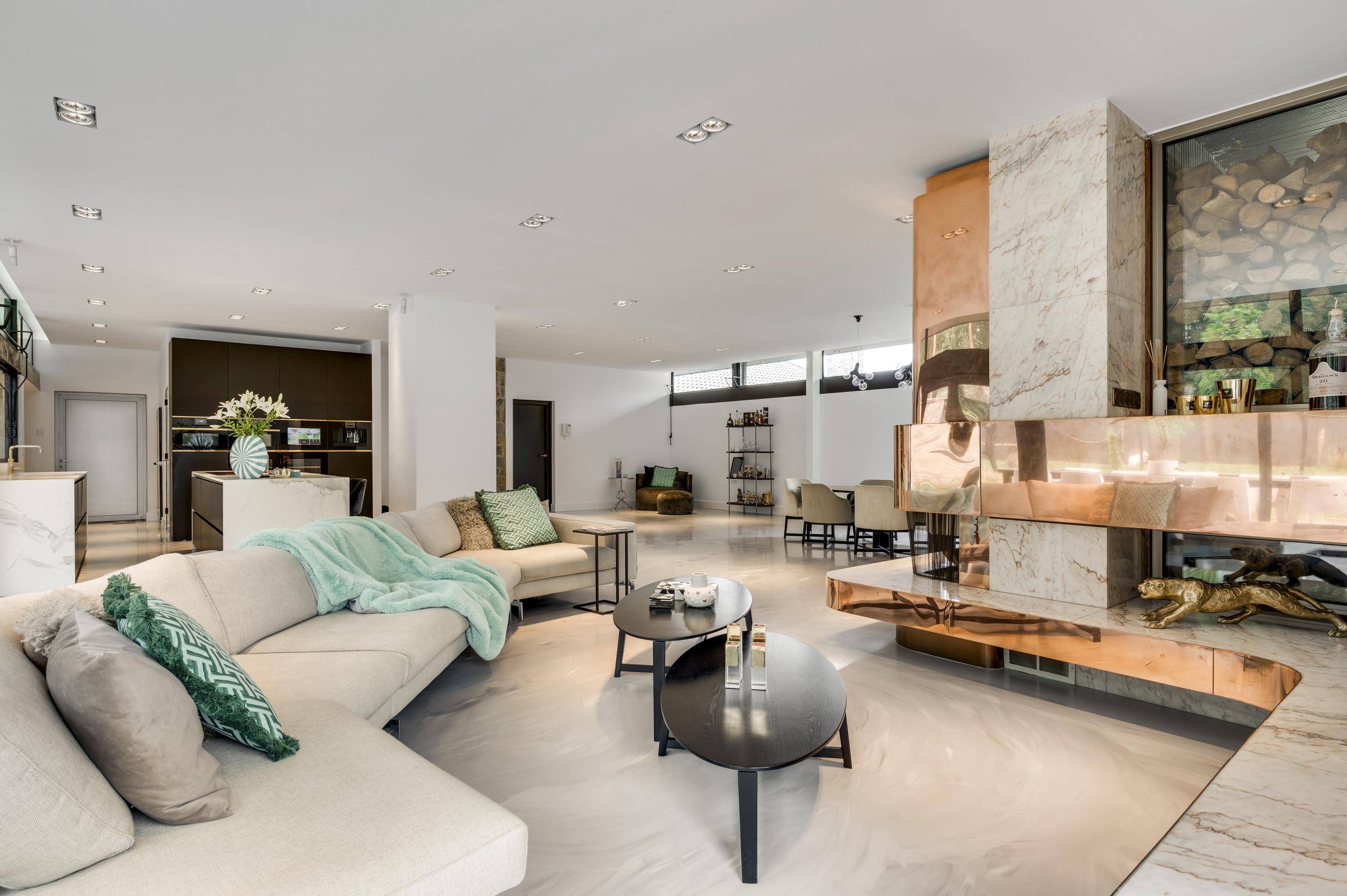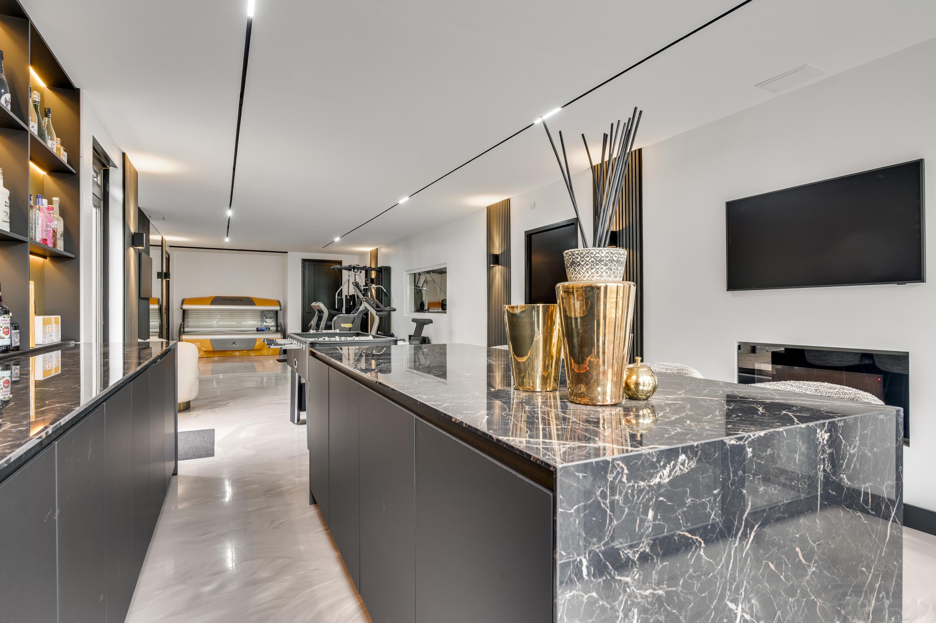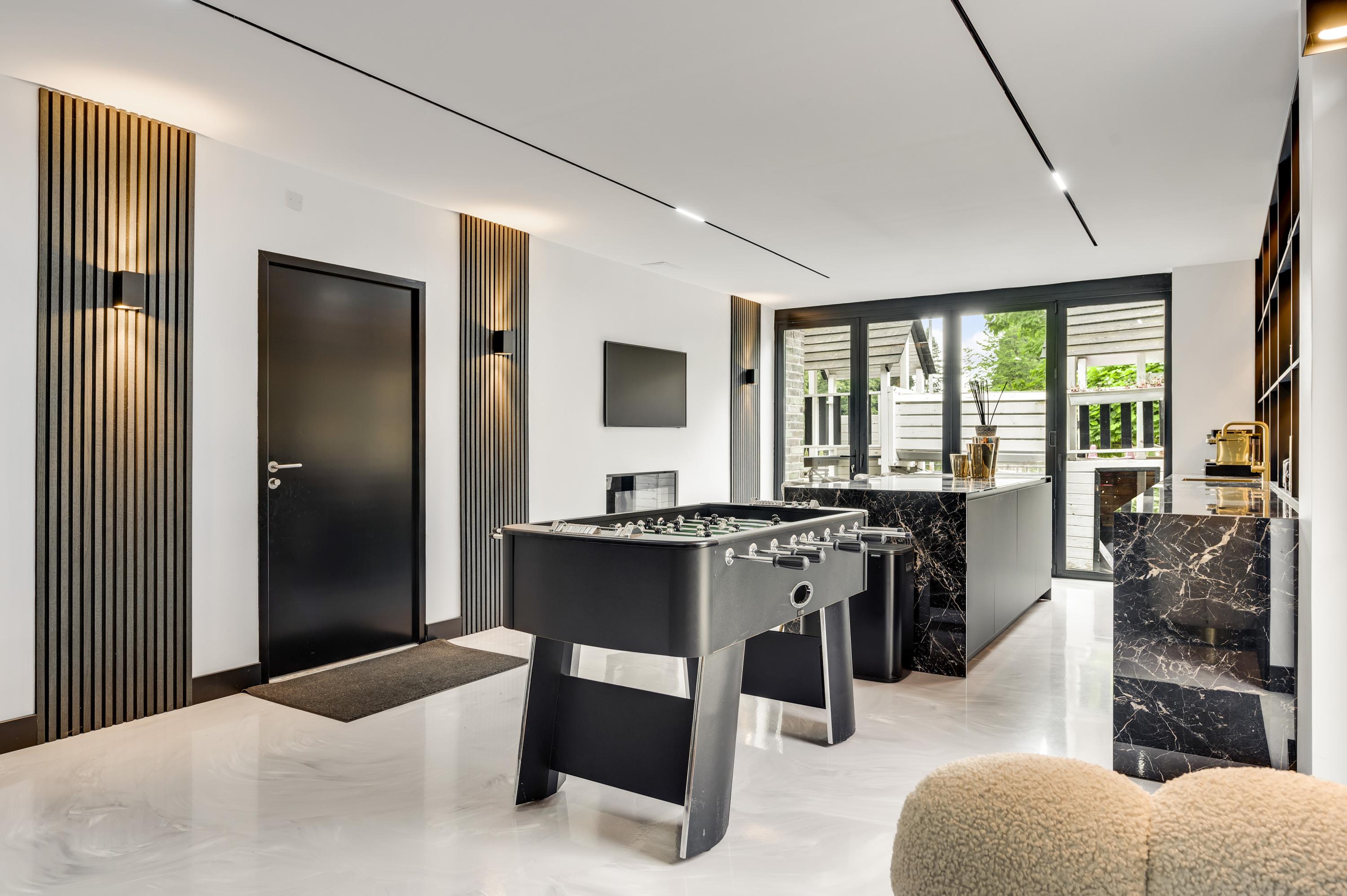 The south wing of the villa boasts a spacious living area with large windows and a cozy open fireplace. The modern open-plan kitchen (2020) forms the heart of this wing and is equipped with high-end built-in appliances. Adjacent to the kitchen is a versatile room, ideal as a home office, library, or playroom.