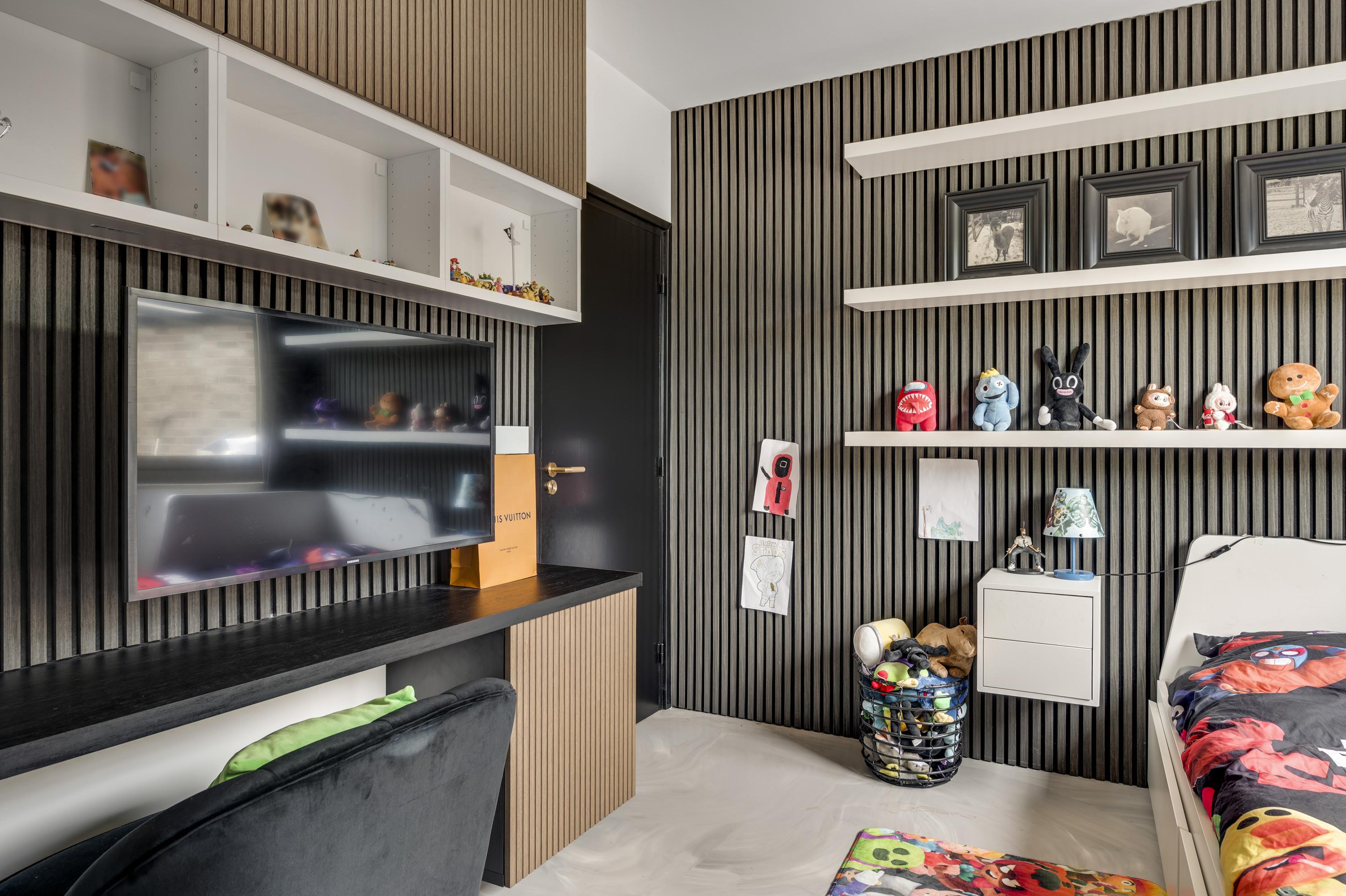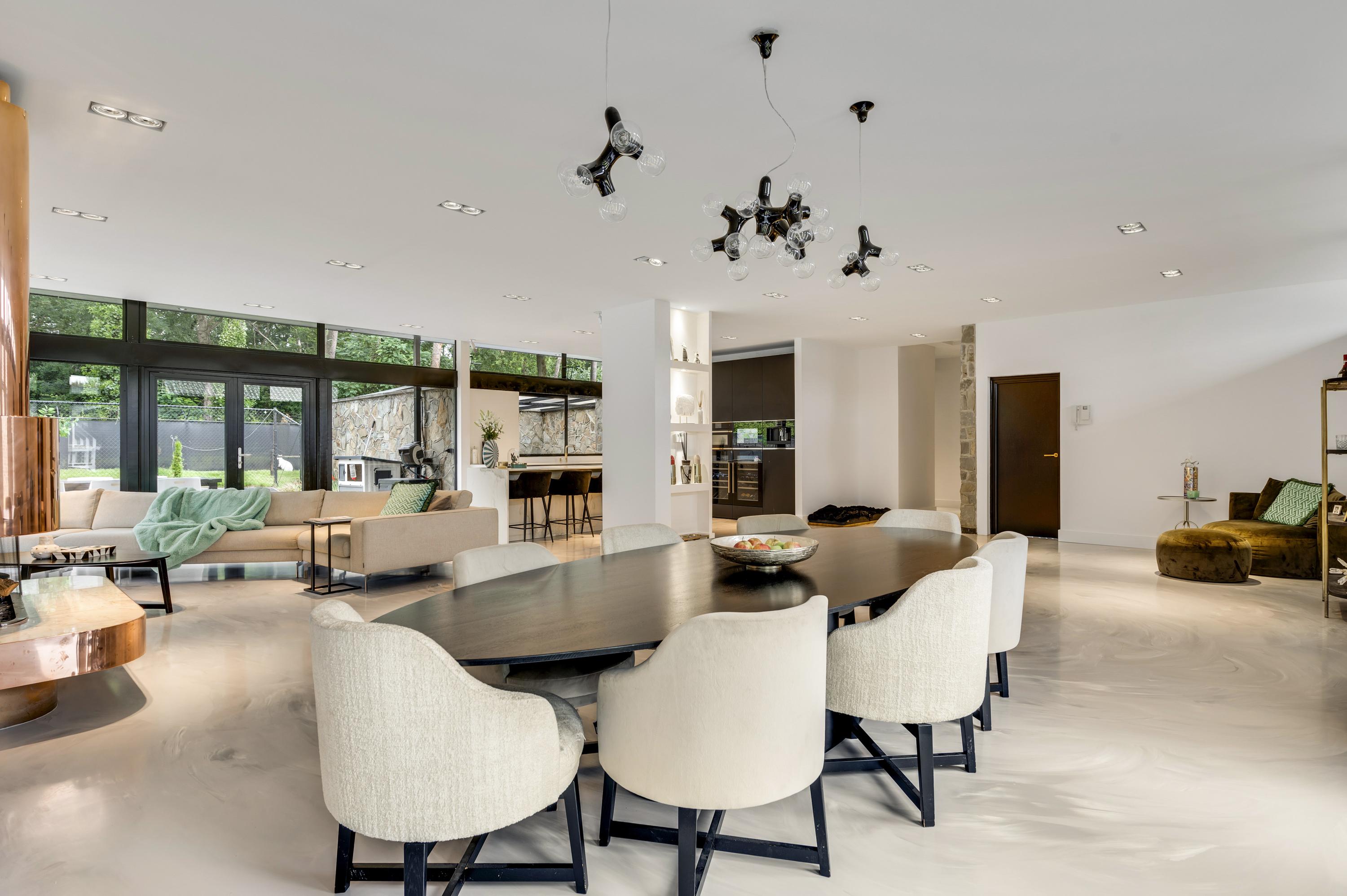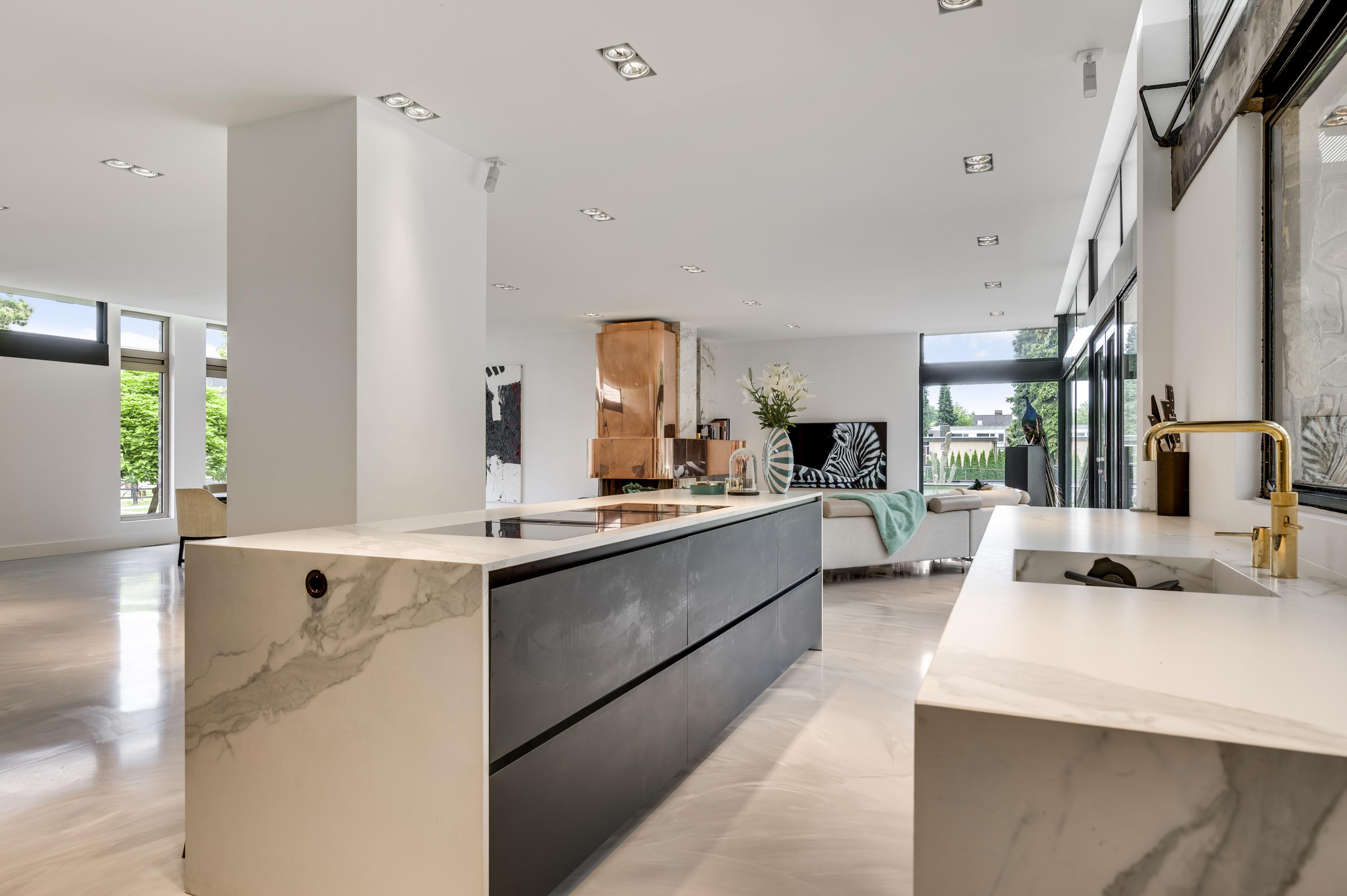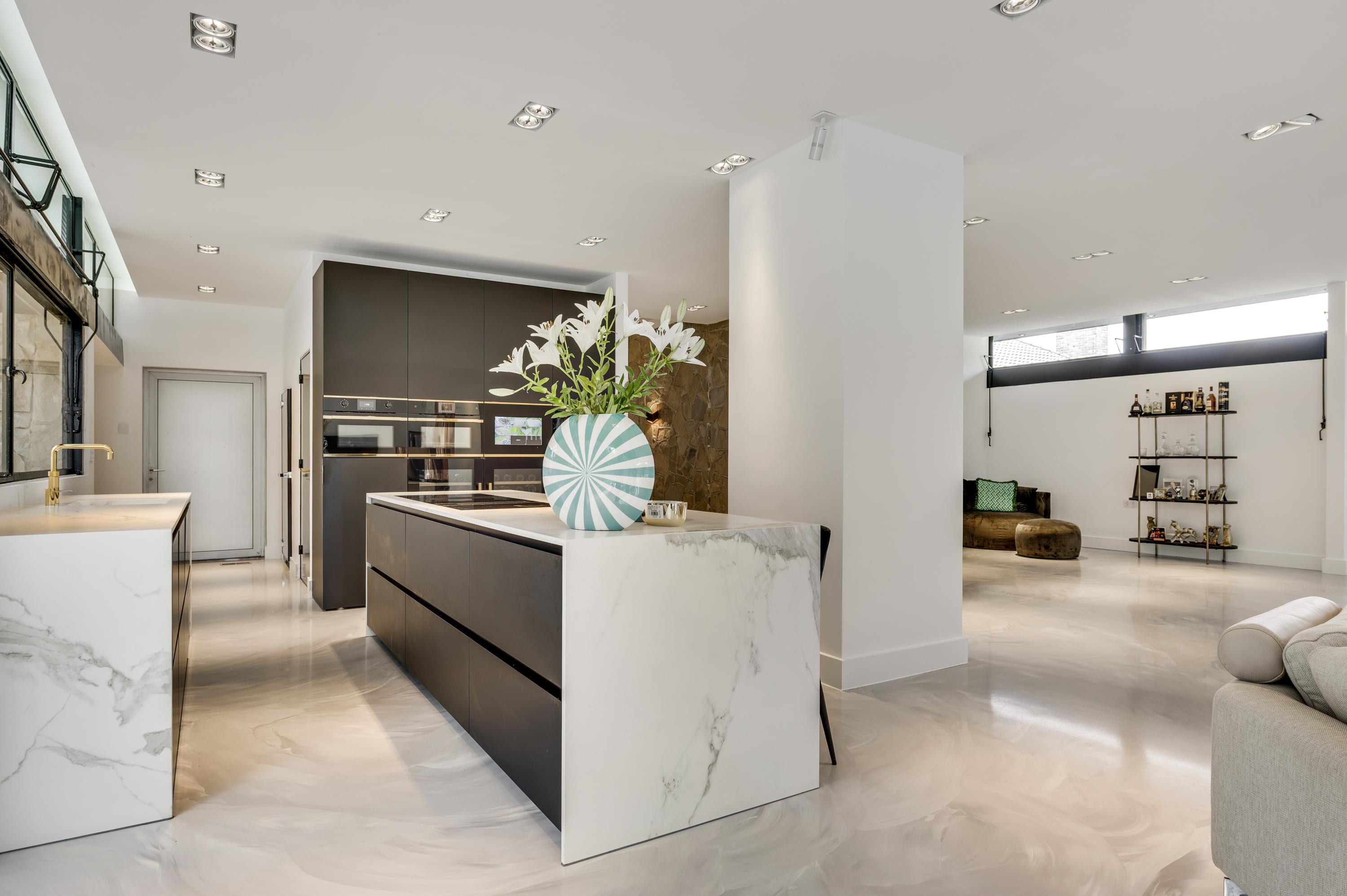 The south wing of the villa boasts a spacious living area with large windows and a cozy open fireplace. The modern open-plan kitchen (2020) forms the heart of this wing and is equipped with high-end built-in appliances. Adjacent to the kitchen is a versatile room, ideal as a home office, library, or playroom.