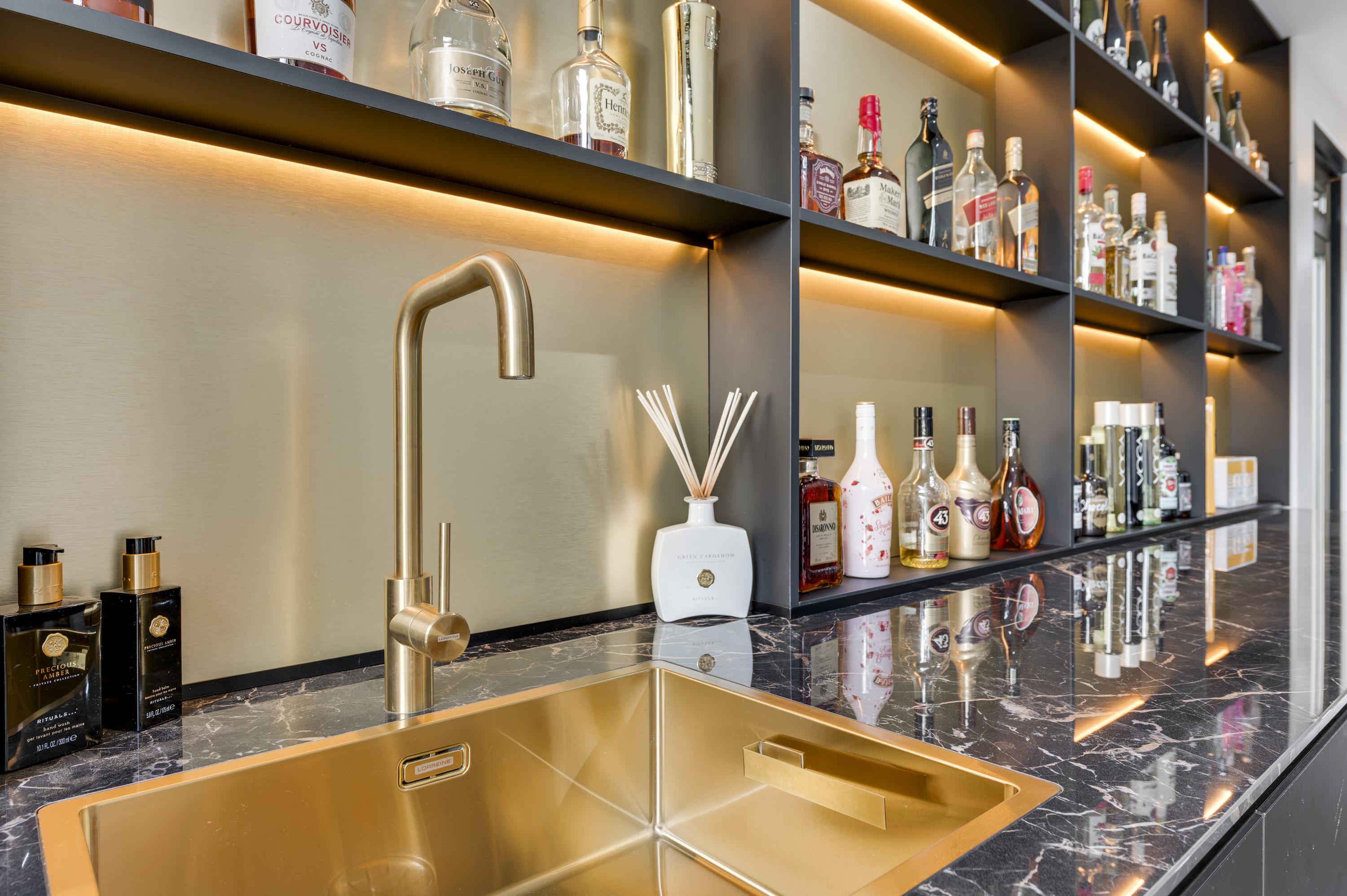 One of the home’s standout features is the lounge bar with fitness area, which opens onto the garden and the stables. For those not involved with horses, this space can easily be transformed into a wellness area, indoor pool, or creative studio.