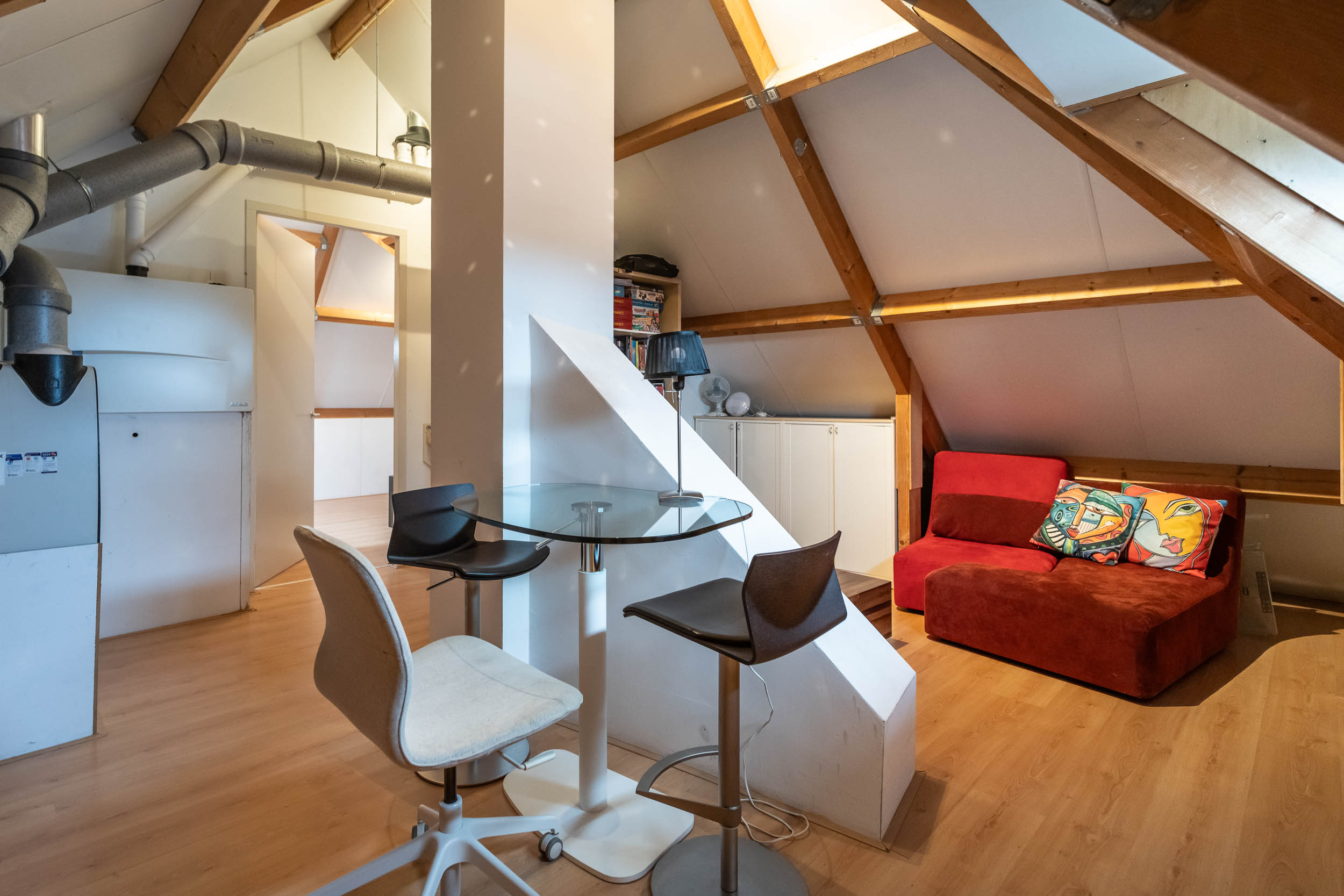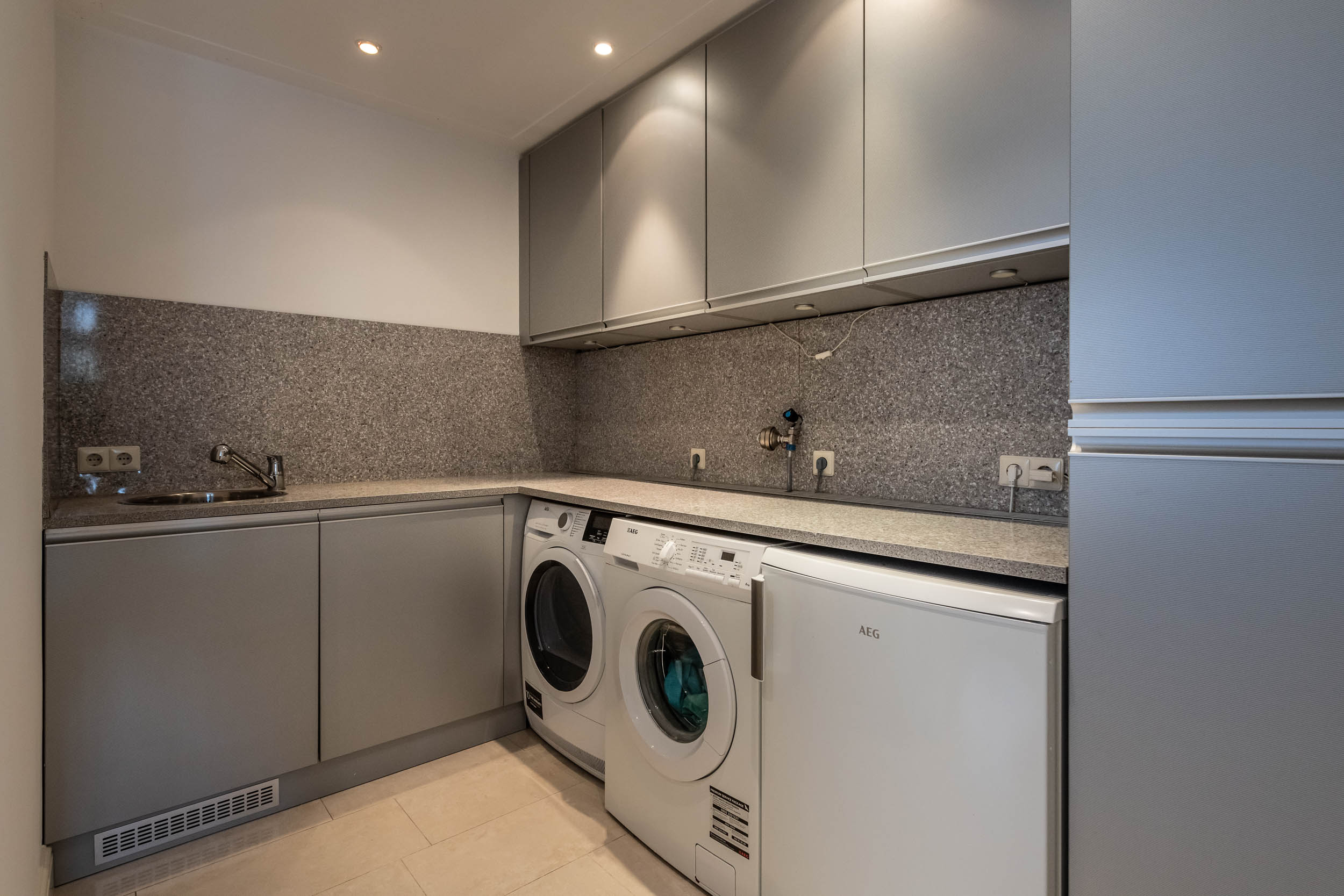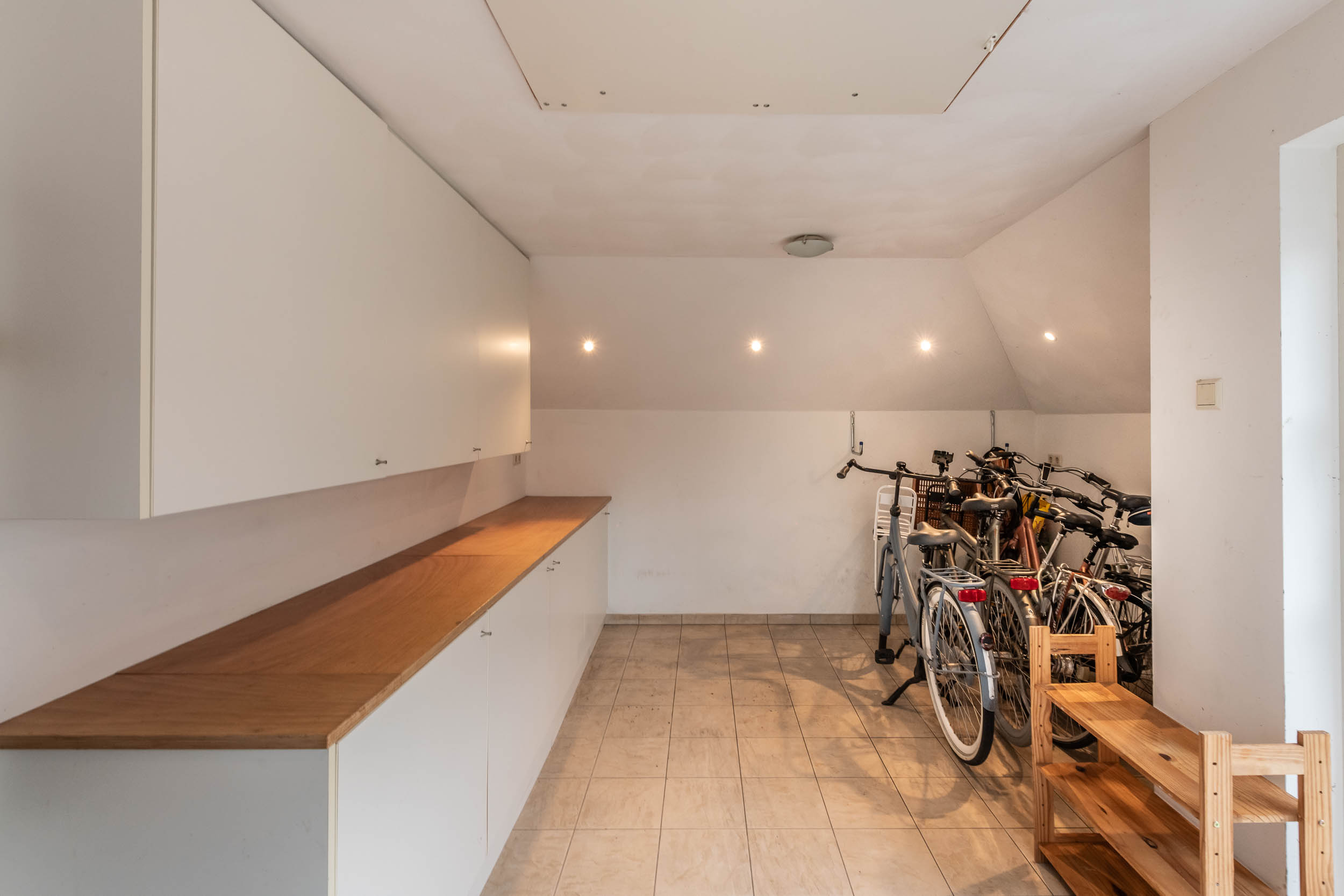 Inside, rooms are generously scaled, filled with light through large windows, and appointed for functional elegance: a SieMatic kitchen with cooking island, a living room warmed by a gas fireplace and built-in storage, and a utility room accessible from both kitchen and garage. The first floor includes four bright bedrooms, access to a roof terrace, and two sophisticated bathrooms—one with a sauna, the other with contemporary amenities. The attic provides versatile additional space and a private bedroom. Multiple international and English-language schools are nearby, and everyday needs are attended to with an installed alarm system, charging station for electric cars, and modern central heating.