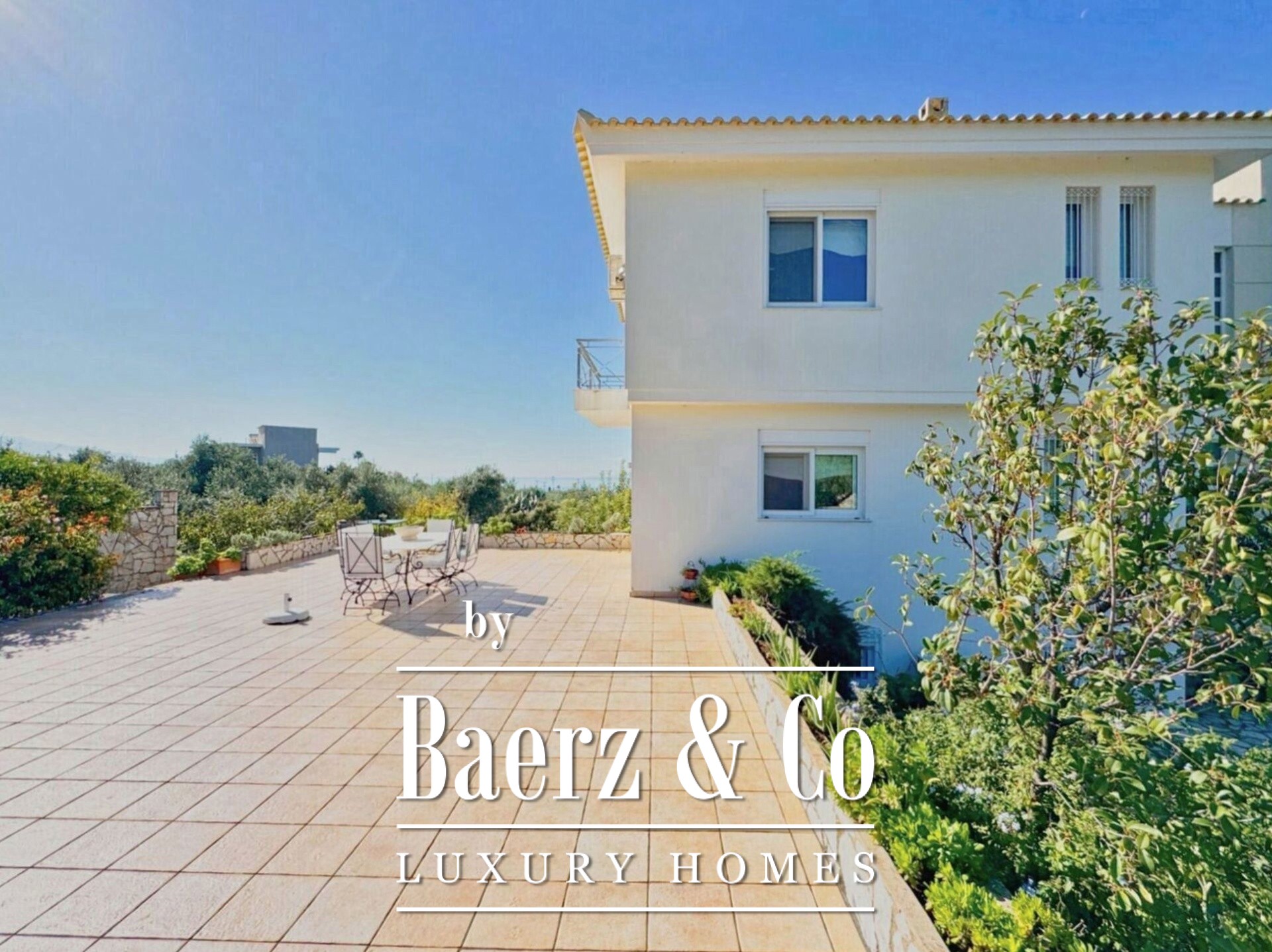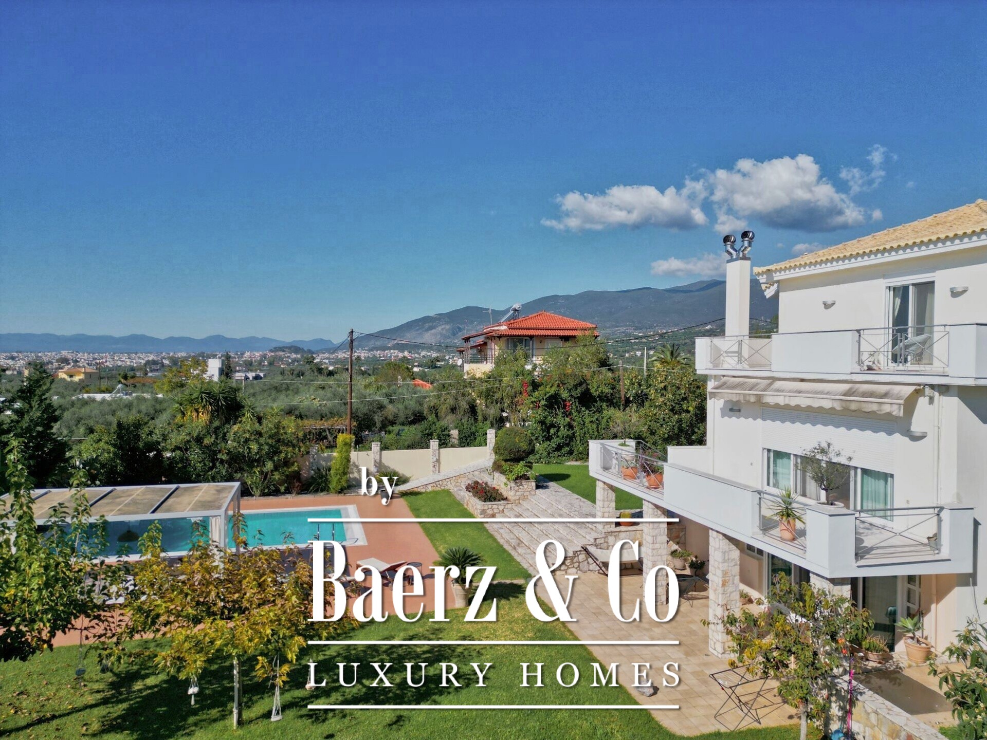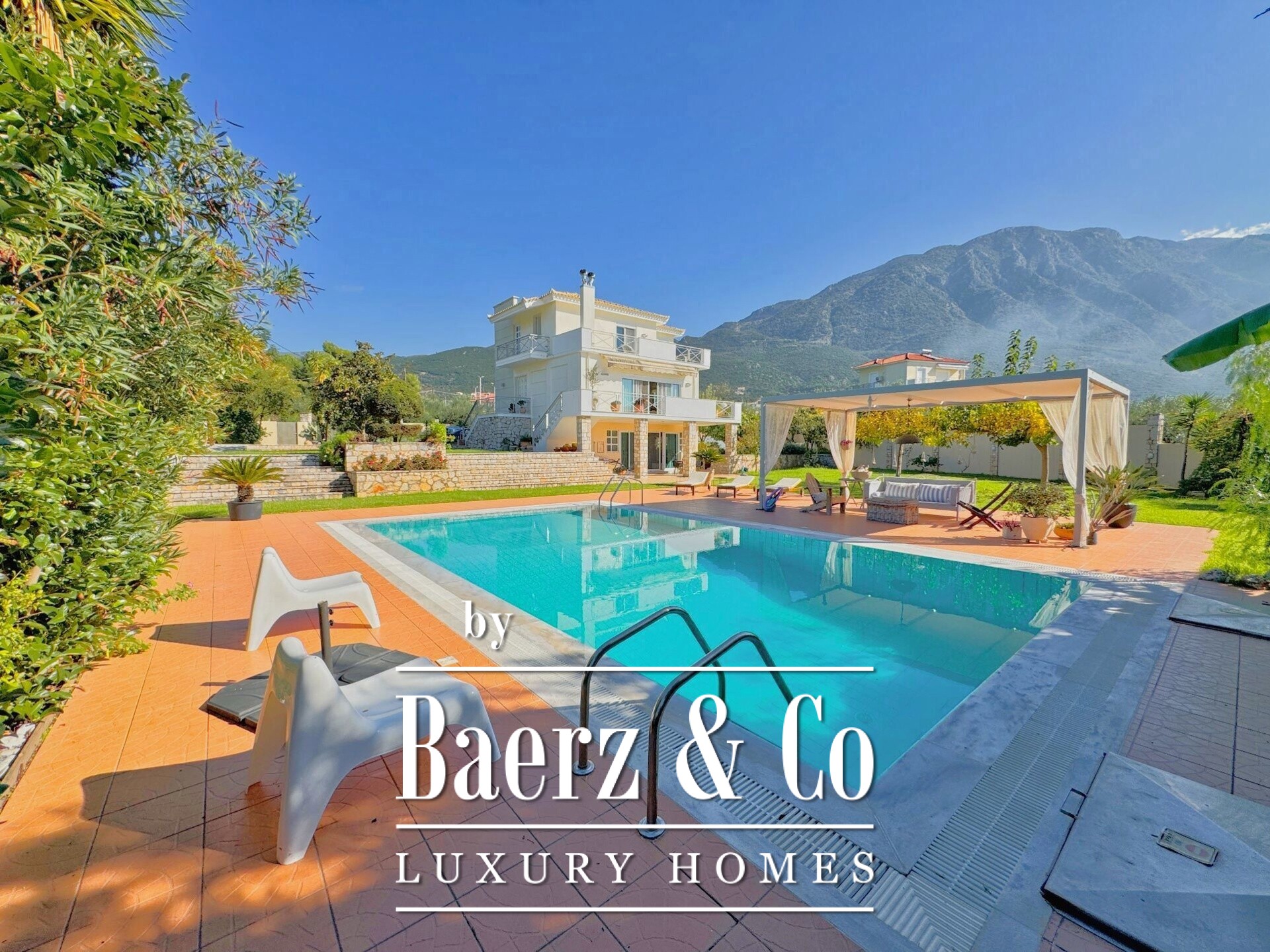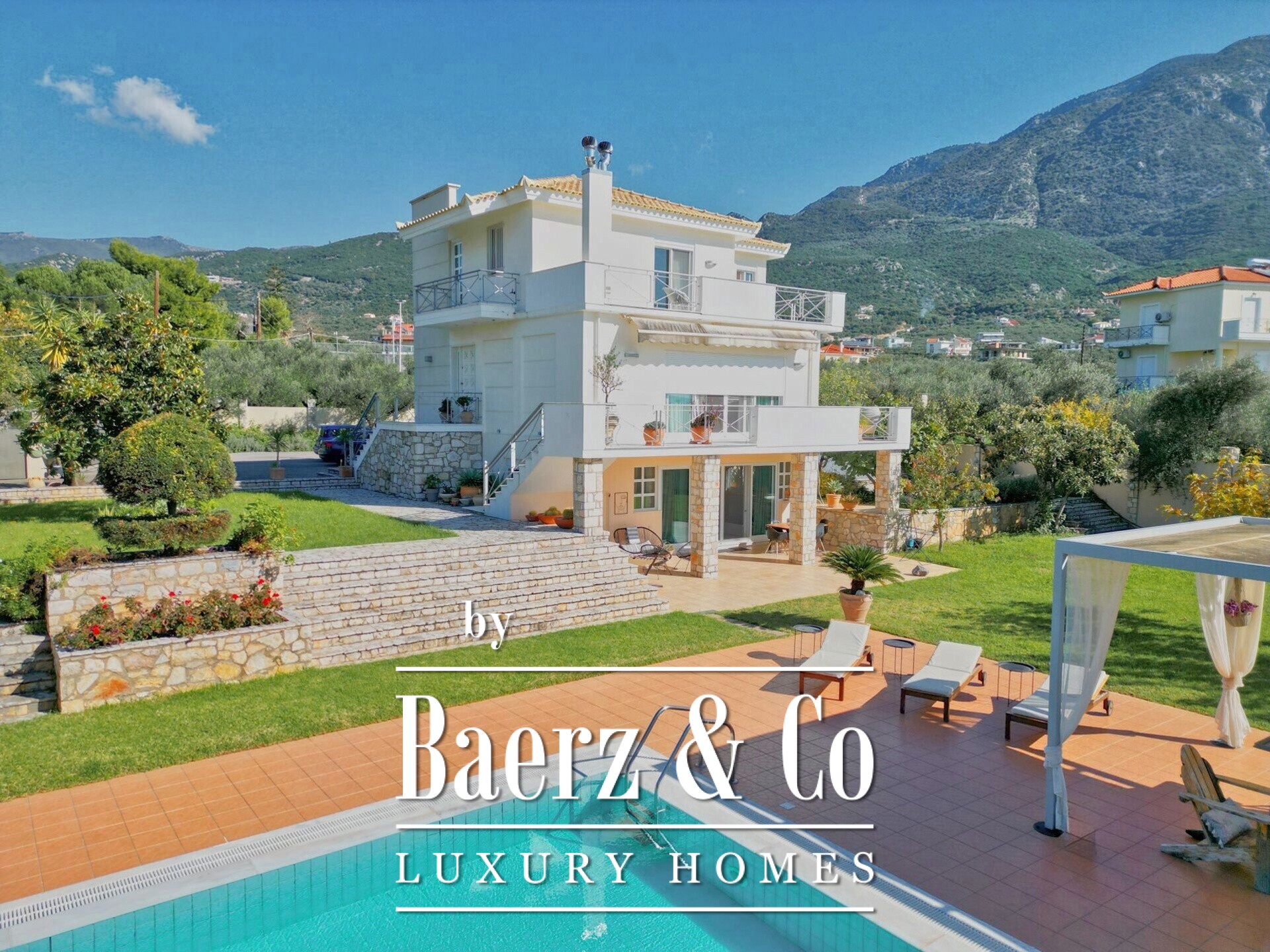 Detached house Kalamata offers an impressive sense of space and privacy across 370 m² and four levels. Set on a generous 2,000 m² plot, this home balances refined comfort with striking panoramic sea and mountain views. Outdoors, a pool, pergola, and well-equipped BBQ area invite restful afternoons or vibrant gatherings, enveloped by lush gardens and mature trees. There is ample parking and a closed garage, ensuring ease and security.