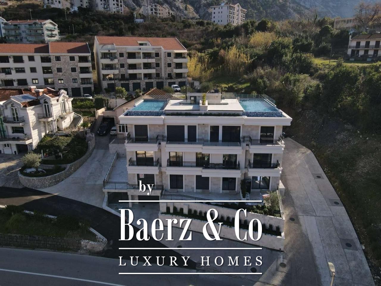 Apartment Kotor is situated just 2 kilometres from the city centre, where the Adriatic light meets the enduring heritage of Montenegro. This newly built residence occupies the third floor of a three-storey building, with a private rooftop pool and a green terrace that open onto panoramic sea and mountain views. Within 80 metres, the coast and beach are yours, while local restaurants and markets are close at hand, anchoring daily life to both tranquillity and ease.