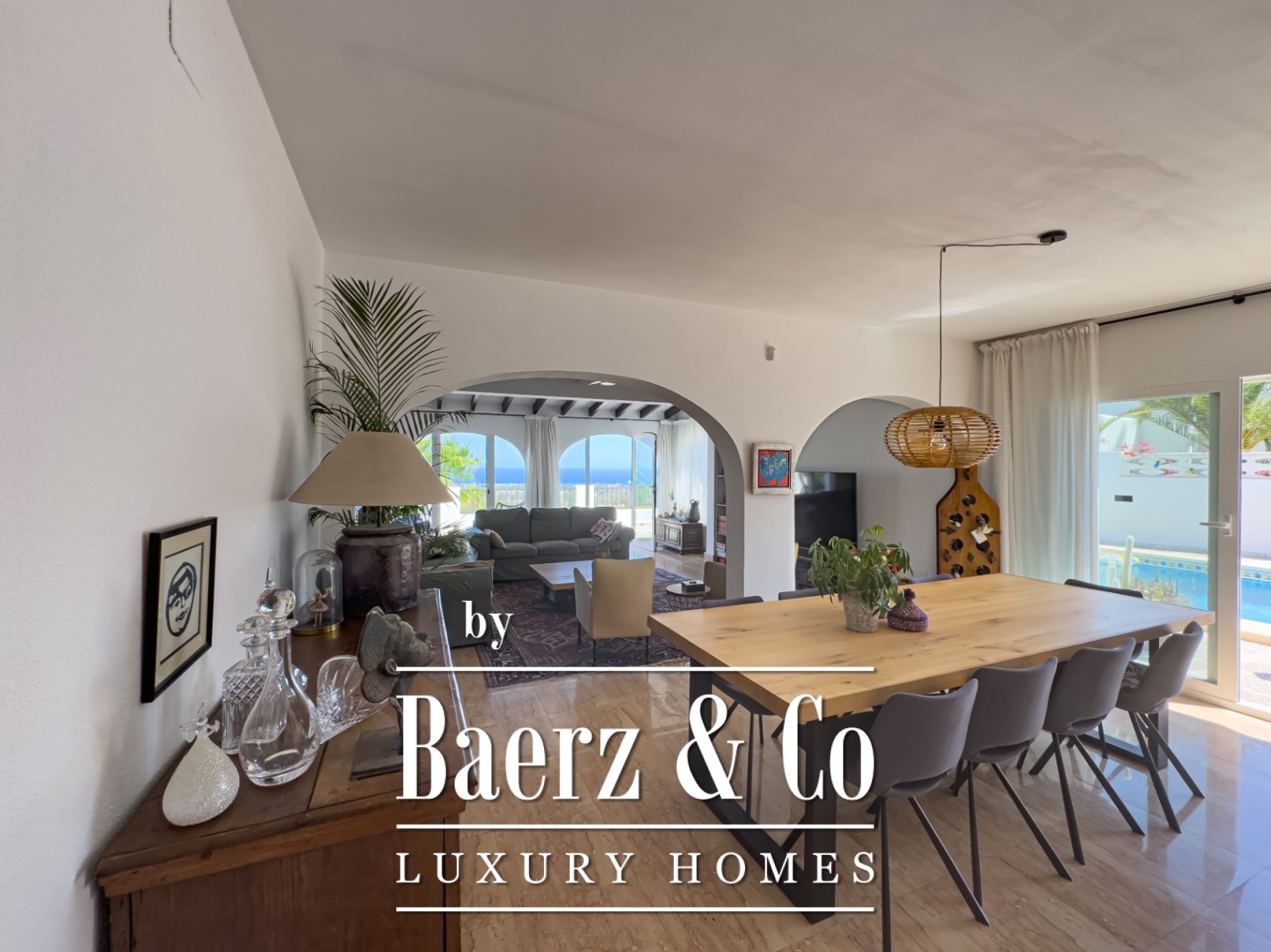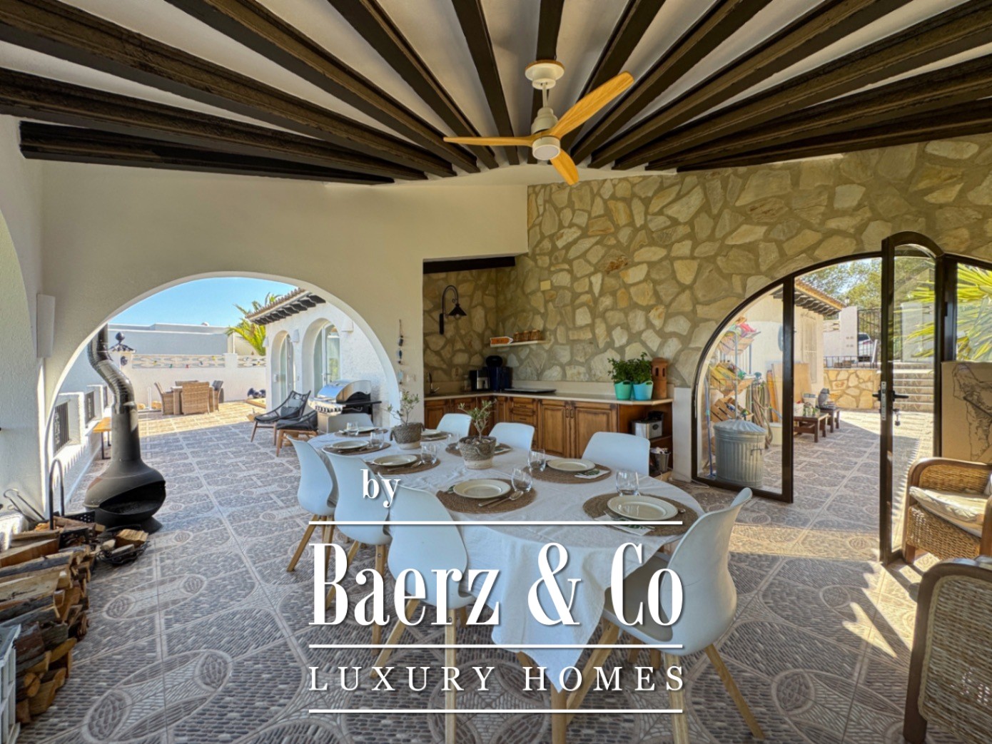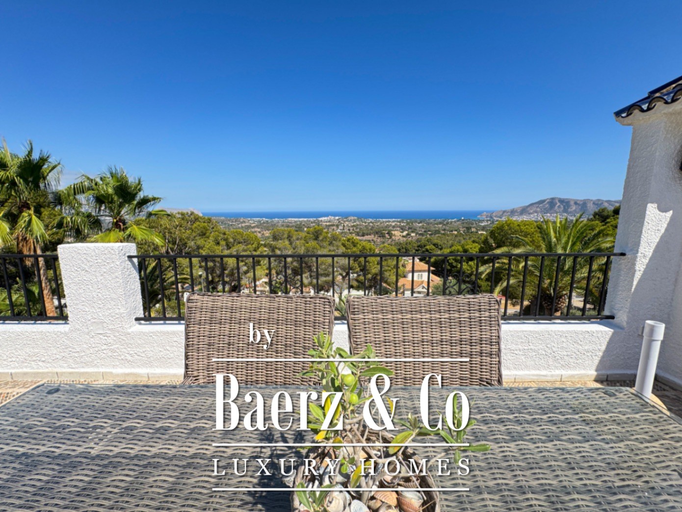 Villa La Nucía with panoramic sea and mountain views invites a measured appreciation of Mediterranean living. Set across 225 m² within a meticulously landscaped 1265 m² garden, this villa harmonizes privacy and spatial generosity, offering subtle luxury for those attuned to detail. The main residence presents a luminous living room and a fully equipped kitchen with uninterrupted vistas, alongside one bedroom with en-suite bathroom and a guest toilet. Designed for both comfort and function, the home’s flow opens seamlessly onto a generous terrace, where open and covered spaces invite morning light and tranquil evenings alike.