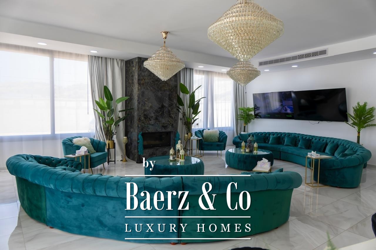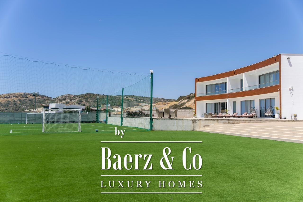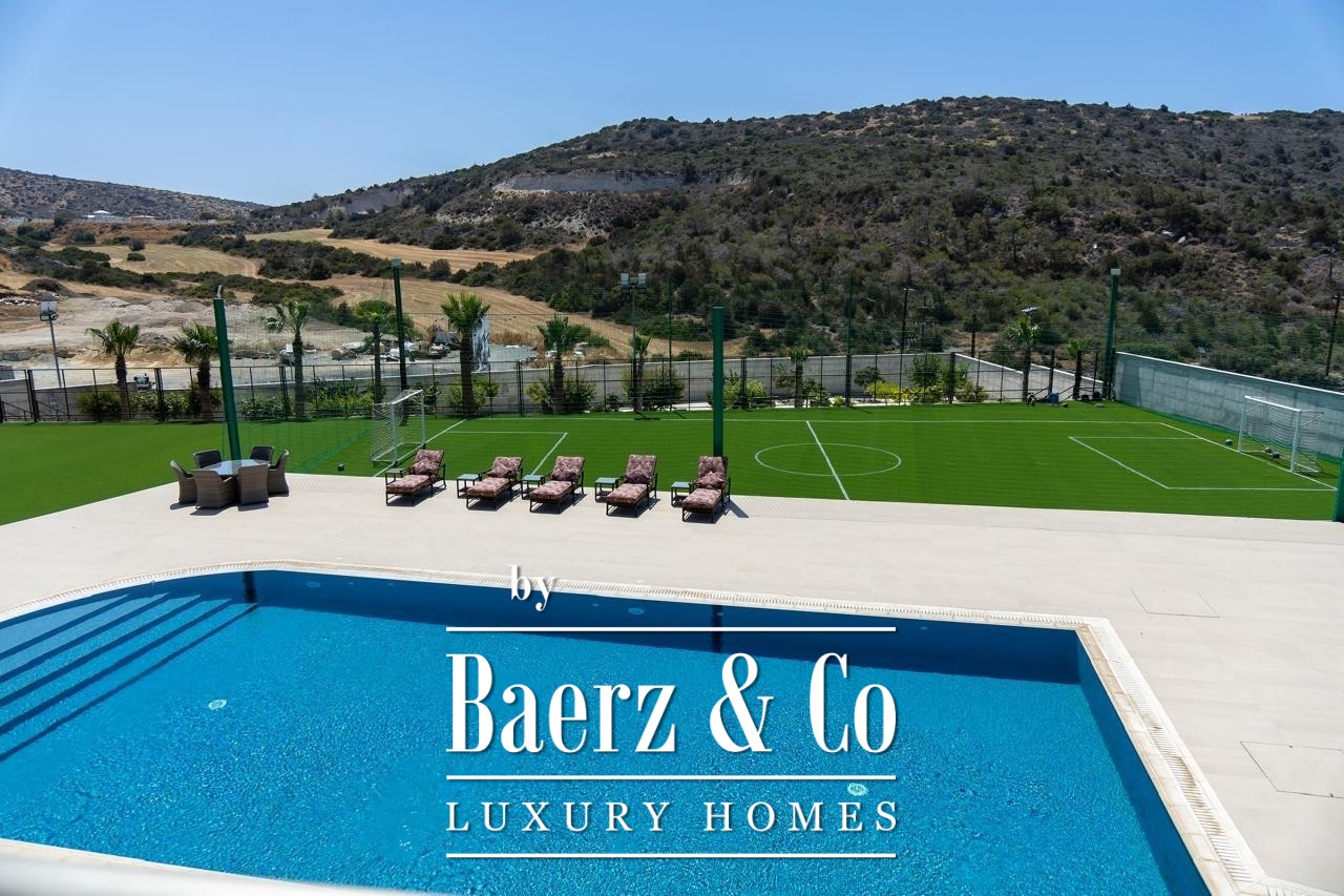 The designer kitchen, equipped with two ovens, both electric and gas stoves, a barbecue grill and advanced appliances, flows towards an outdoor covered kiosk and secondary kitchen, ideal for entertaining. Outdoors, the villa transitions into a private resort, anchored by a 53-meter saltwater pool with integrated jacuzzi and surrounded by landscaped gardens, mature fruit trees and a private mini football pitch.