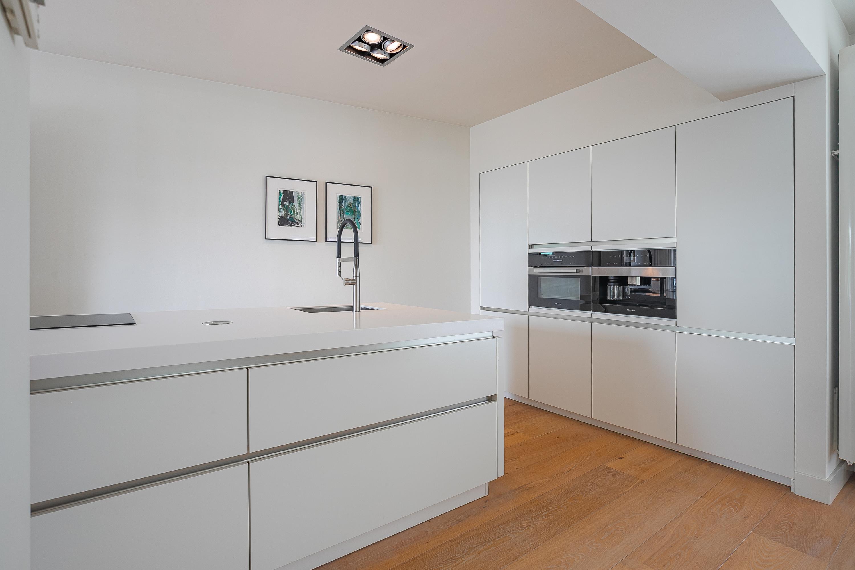 The open kitchen with large cooking island has a luxurious, handle-free design and is equipped with high-quality built-in appliances: a 5-zone induction hob, ceiling extractor, dishwasher, fully automatic coffee machine, convection oven, refrigerator and sink.