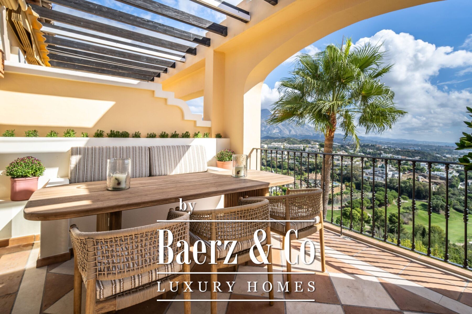 This penthouse Marbella La Quinta crowns the landscape with uninterrupted views over the sea, mountains, and emerald golf greens. Terraces invite year-round living, their orientation capturing both sunrise tranquility and the evening's gentle light, ideal for private dining or quiet retreat.