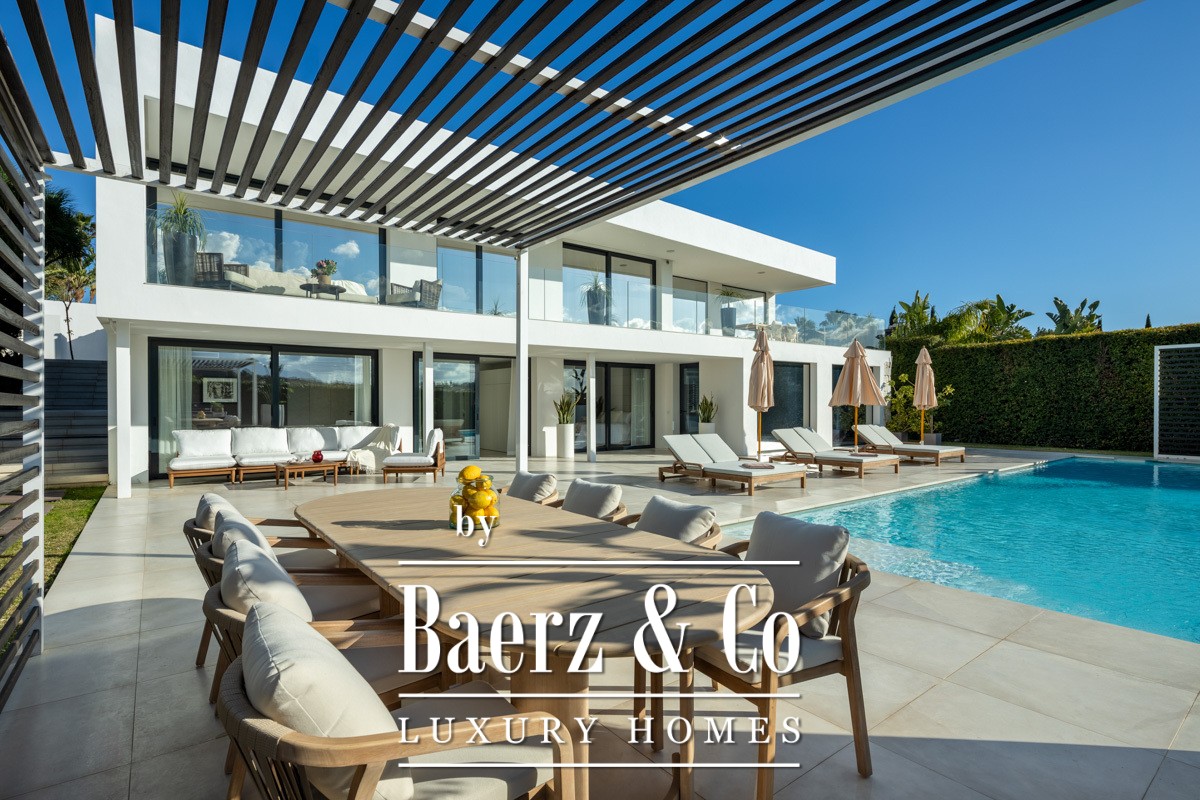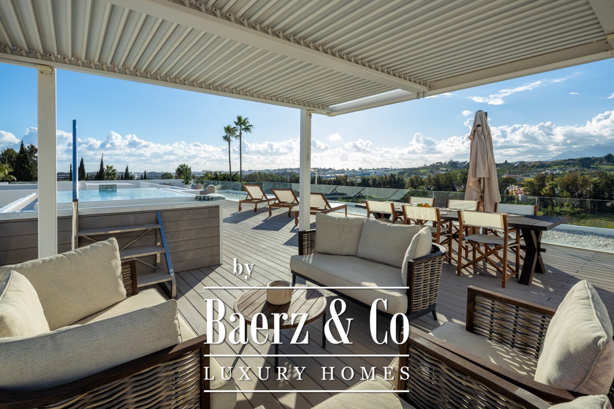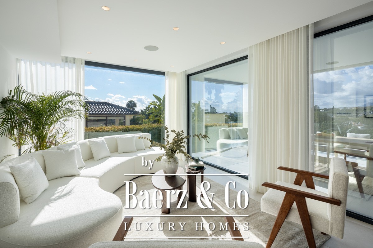 Welcome to a modern frontline golf villa located in the heart of Nueva Andalucía. This stunning property seamlessly combines contemporary design with luxurious comfort, offering an unparalleled living experience. The villa features expansive terraces, thoughtfully designed for entertaining, and a private outdoor pool that invites relaxation under the Mediterranean sun. With a private driveway adding convenience, this villa is perfectly positioned to enjoy breath-taking golf and mountain views from every angle.