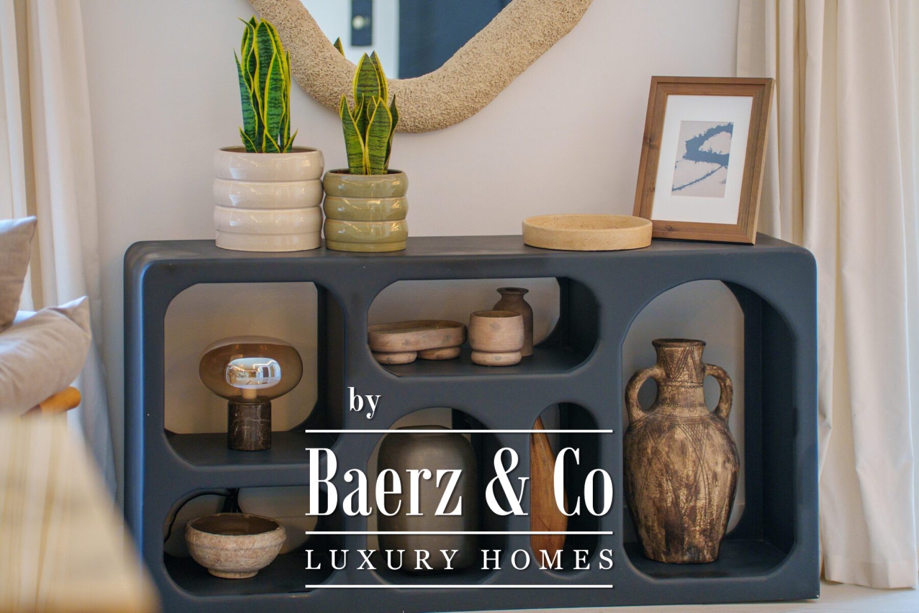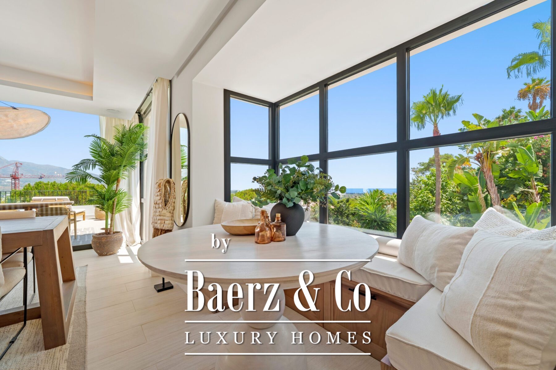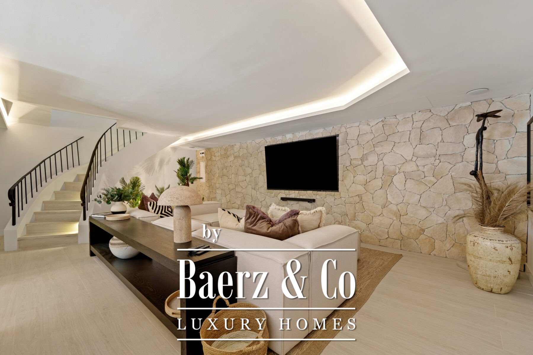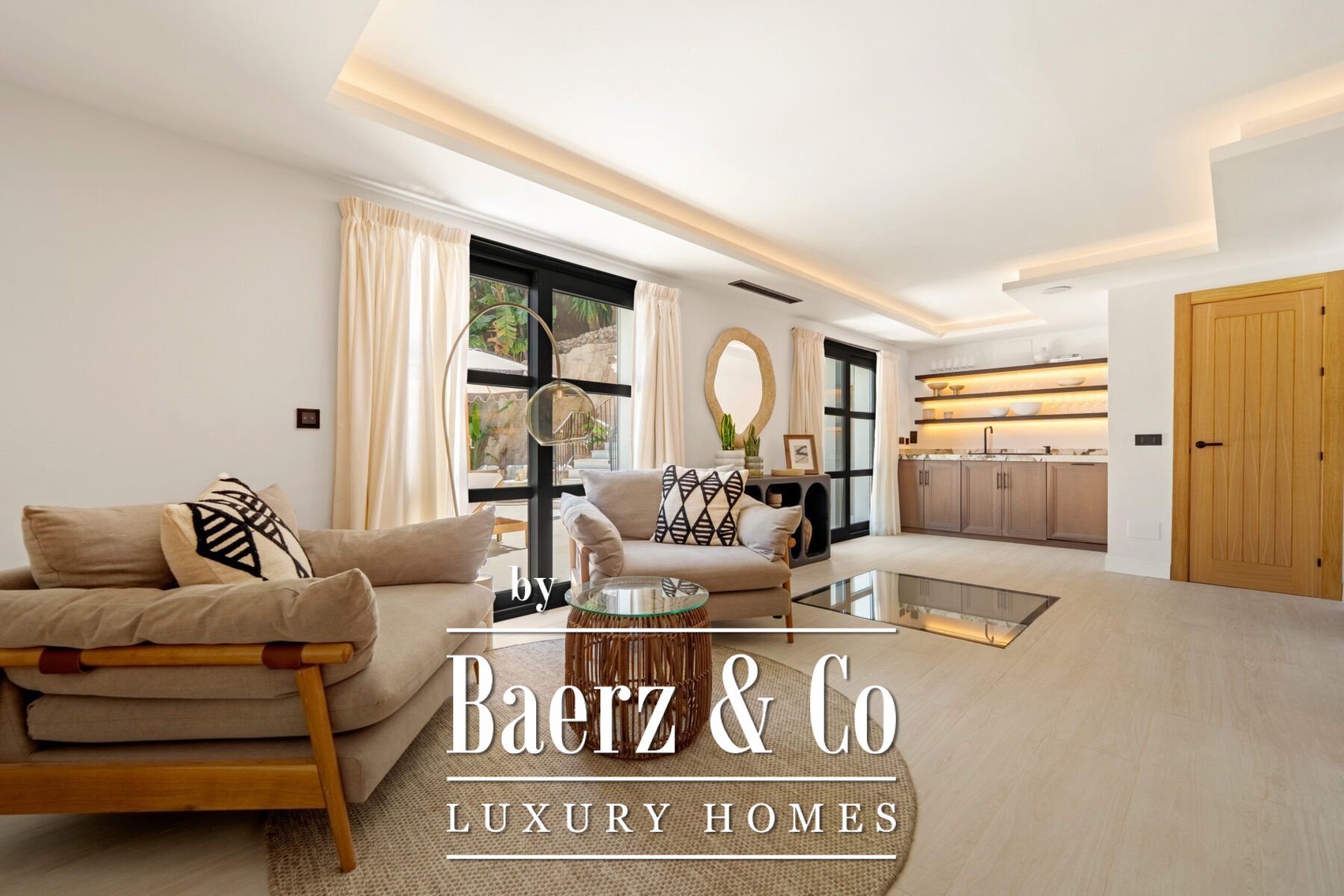 The interior design is a harmonious fusion of sophistication and warmth, combining neutral tones, natural textures, and bespoke furnishings to create a serene yet luxurious atmosphere. Handpicked décor pieces, artisanal lighting, and thoughtfully integrated shelving add character and charm, while large windows frame the captivating views and invite abundant daylight into every space. The result is a home that feels both contemporary and timeless, with a refined aesthetic that enhances its architectural beauty.