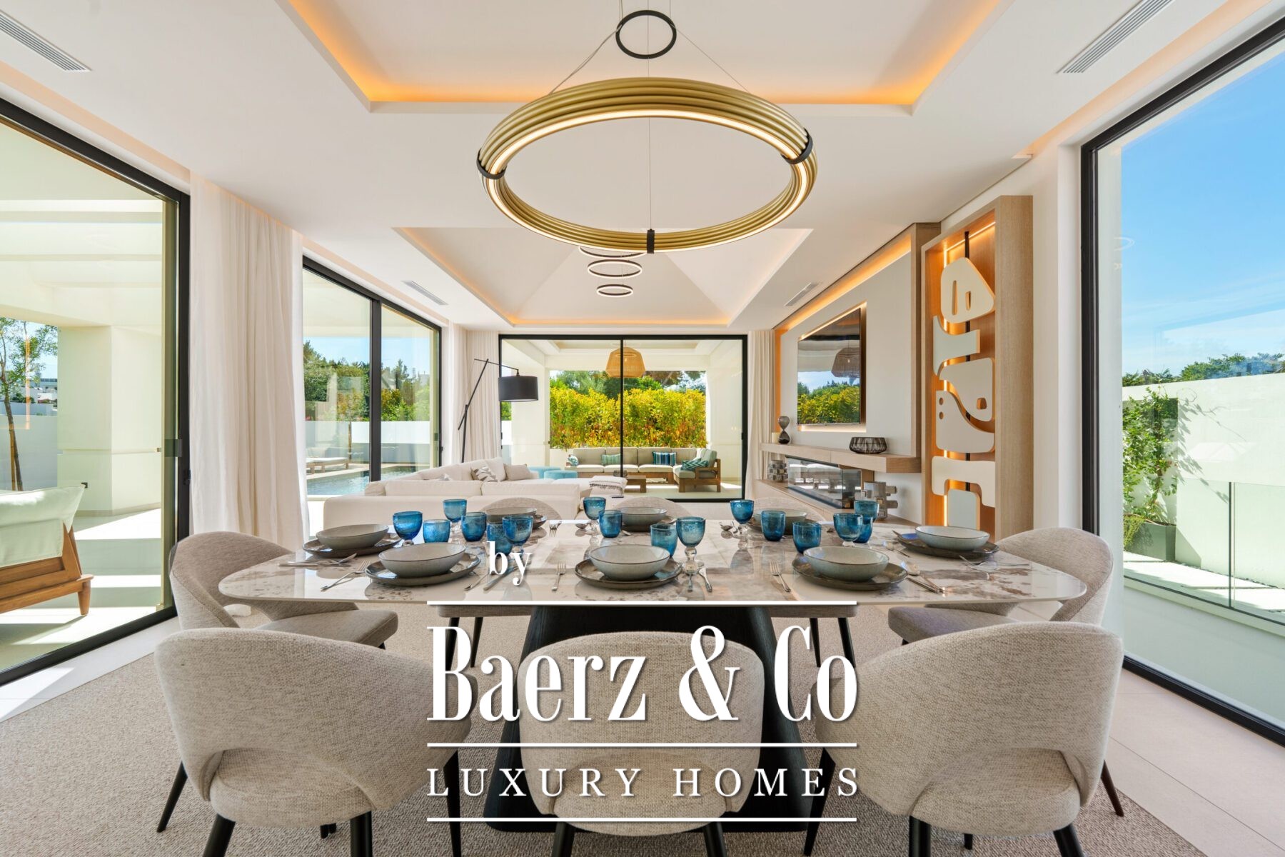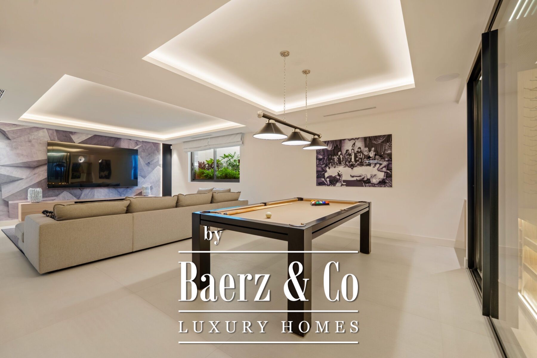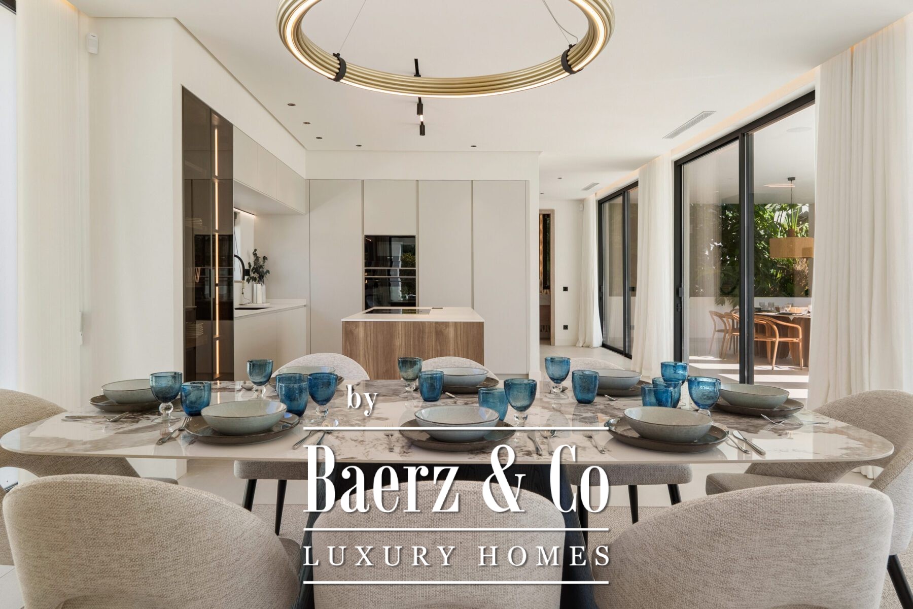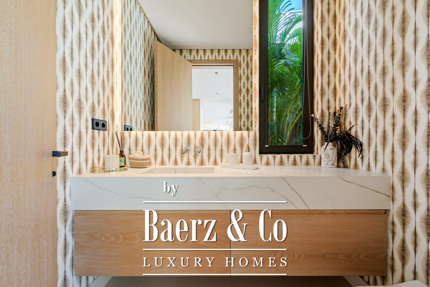 This contemporary villa in the sought-after neighborhood of San Pedro de Alcántara combines sleek architecture with luxurious amenities. Set behind clean white walls and landscaped greenery, the property offers a private oasis with a sparkling pool bordered by a stylish wooden deck and an expansive covered terrace for dining and lounging. Generous outdoor spaces, including a rooftop solarium, create the perfect setting for relaxation and entertaining.