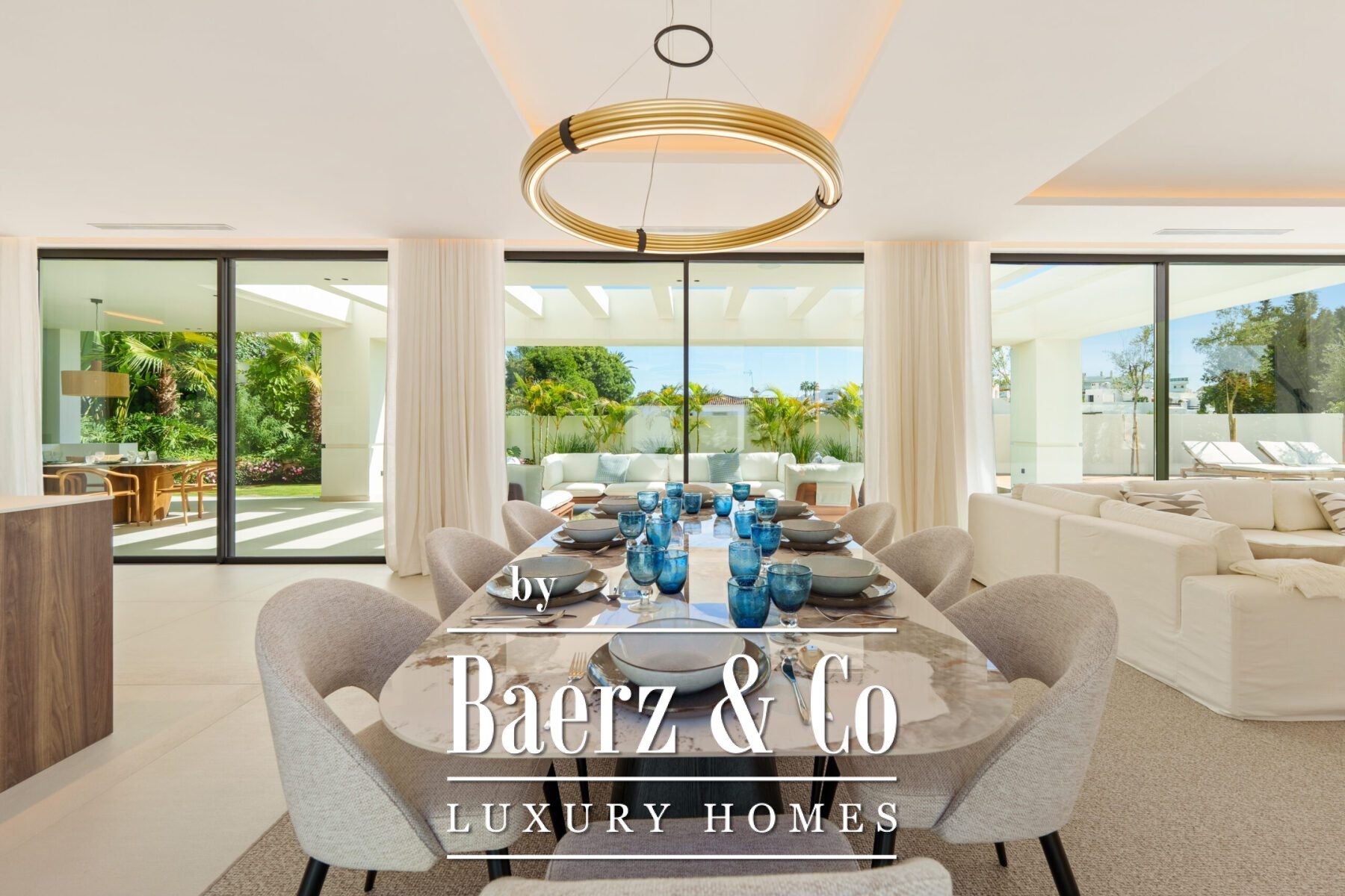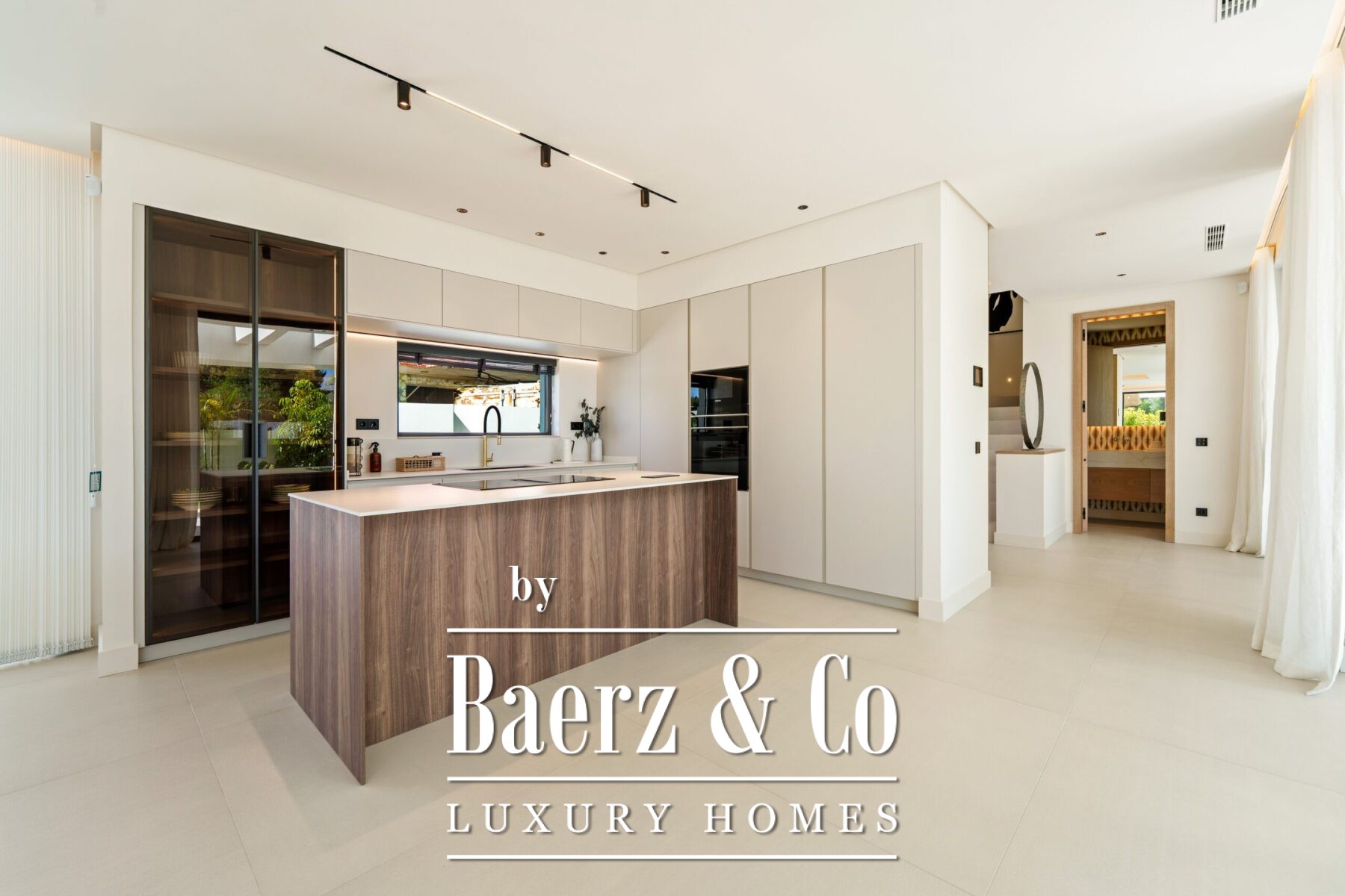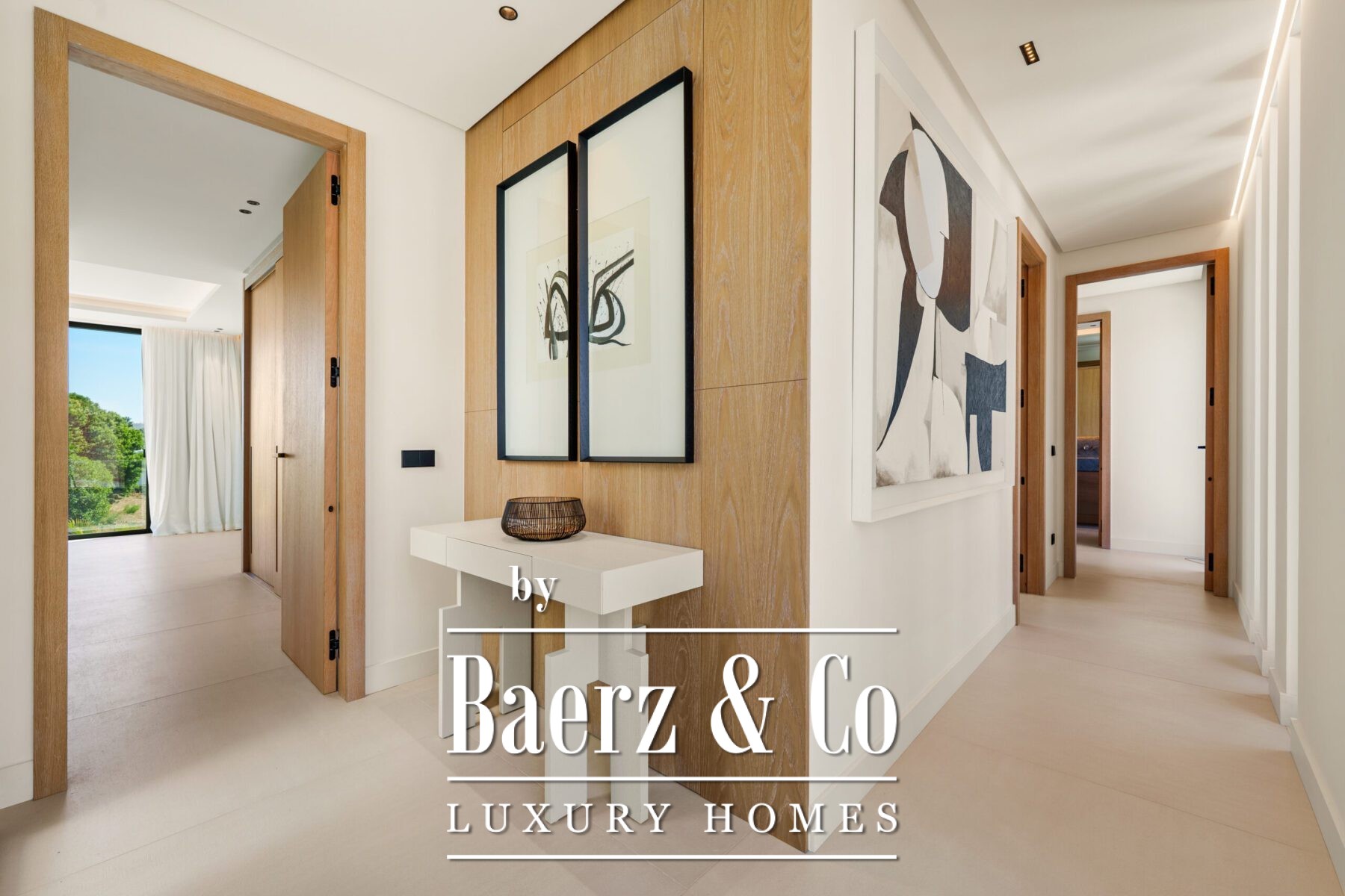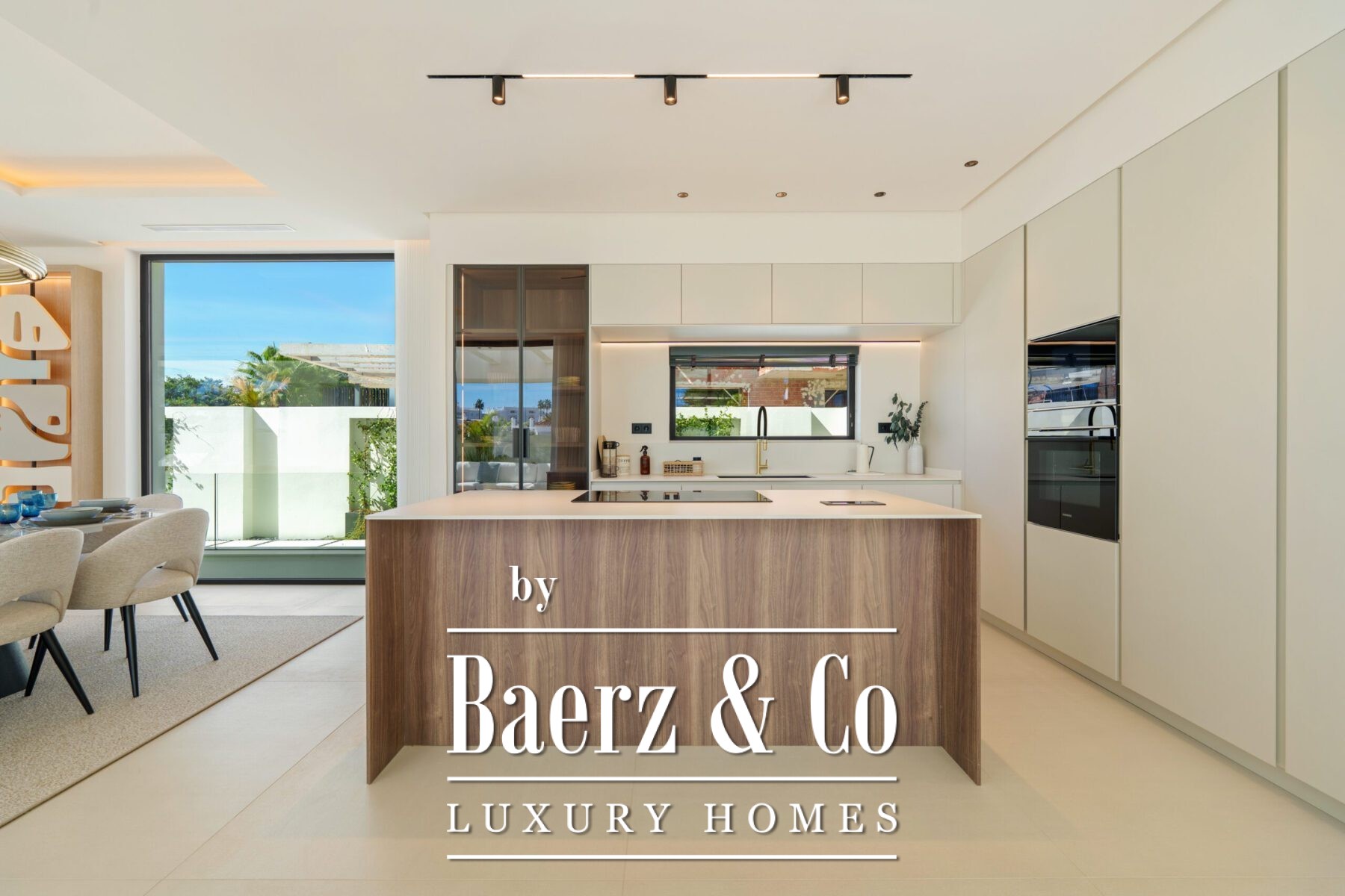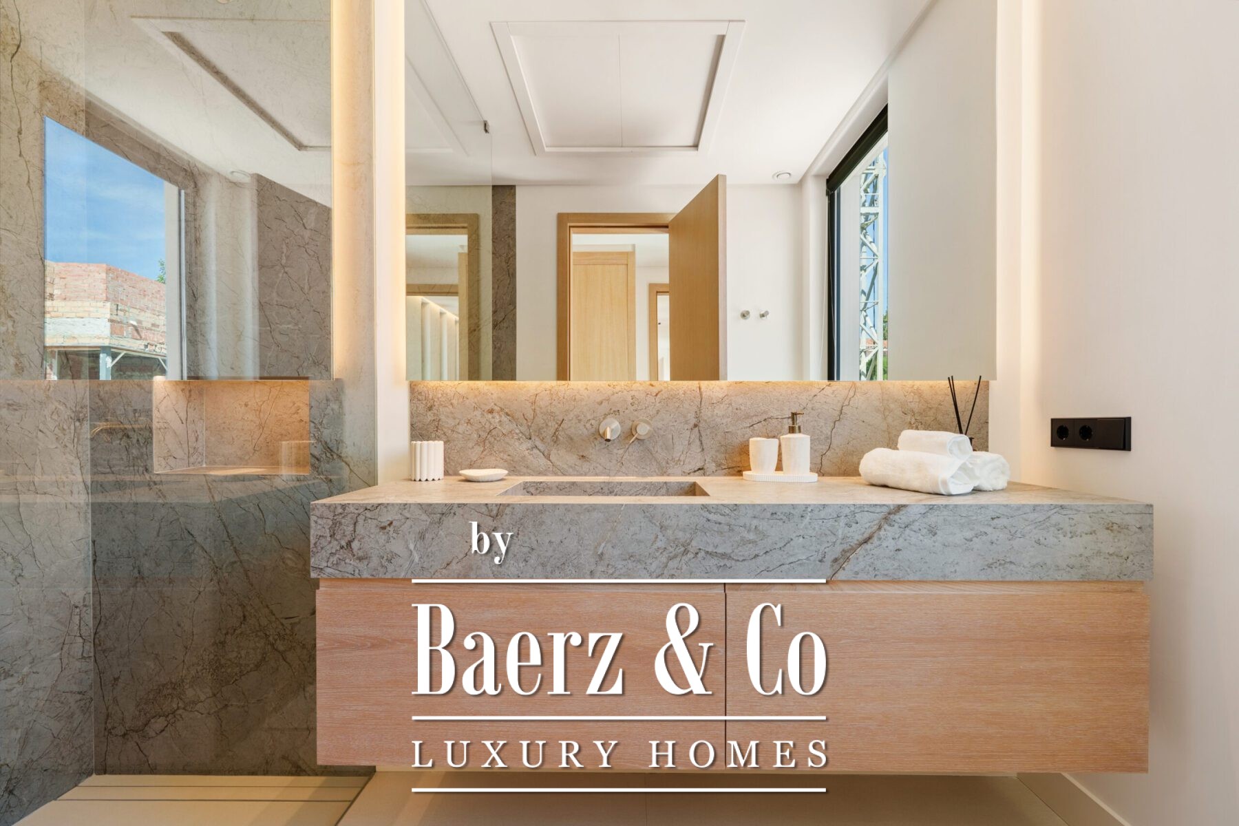 This contemporary villa in the sought-after neighborhood of San Pedro de Alcántara combines sleek architecture with luxurious amenities. Set behind clean white walls and landscaped greenery, the property offers a private oasis with a sparkling pool bordered by a stylish wooden deck and an expansive covered terrace for dining and lounging. Generous outdoor spaces, including a rooftop solarium, create the perfect setting for relaxation and entertaining.