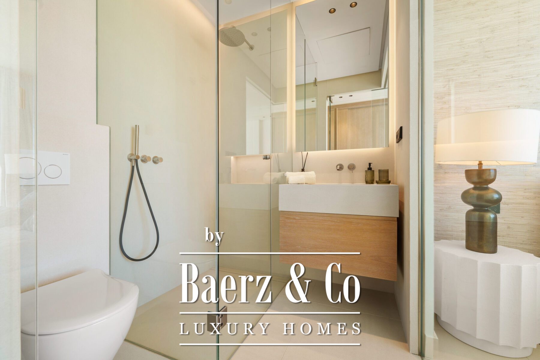 The villa’s private quarters continue the sophisticated aesthetic. Bedrooms are serene and airy, with floor-to-ceiling glass doors that open to terraces, and en-suite bathrooms that exude spa-like elegance with floating vanities, marble finishes, and freestanding tubs. The primary suite impresses with its luxurious proportions and direct access to a sunlit terrace, creating an intimate retreat within the home.