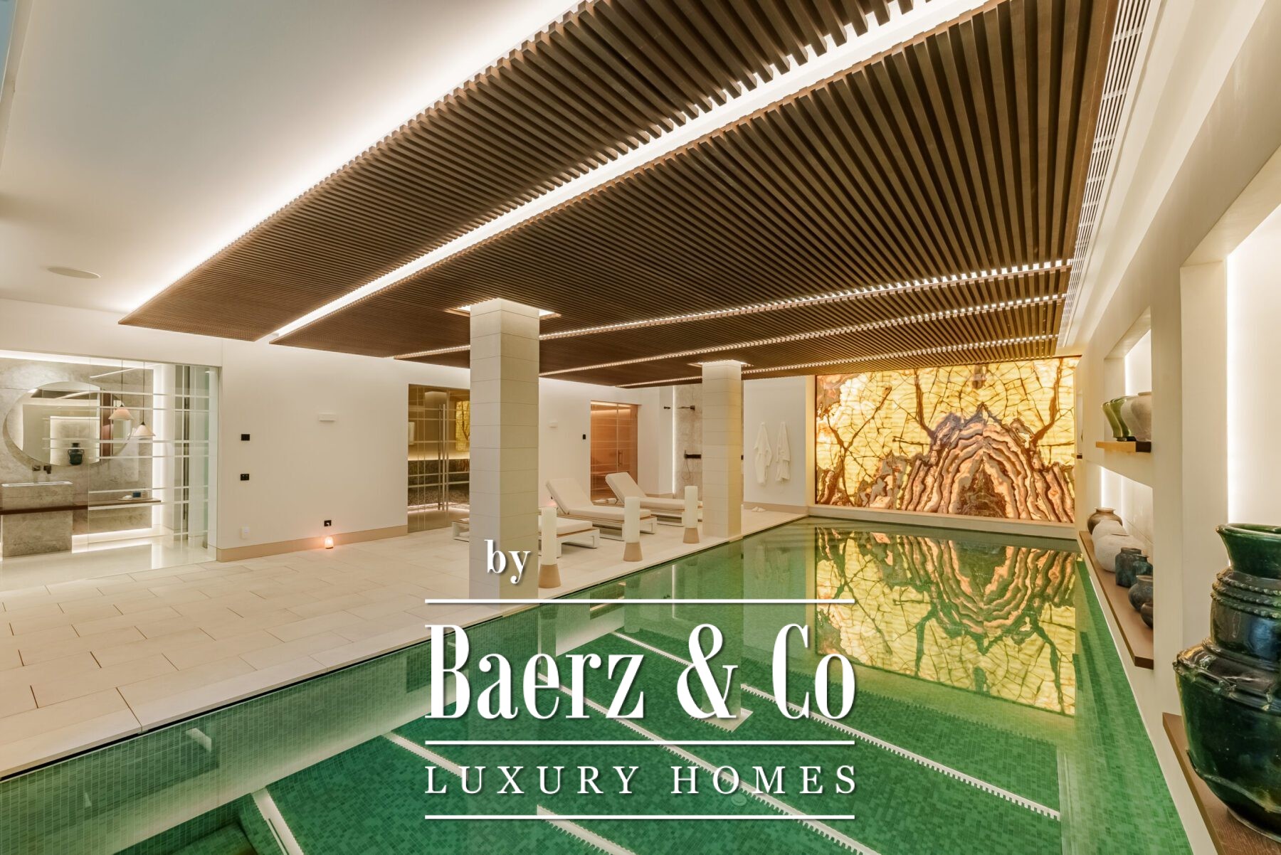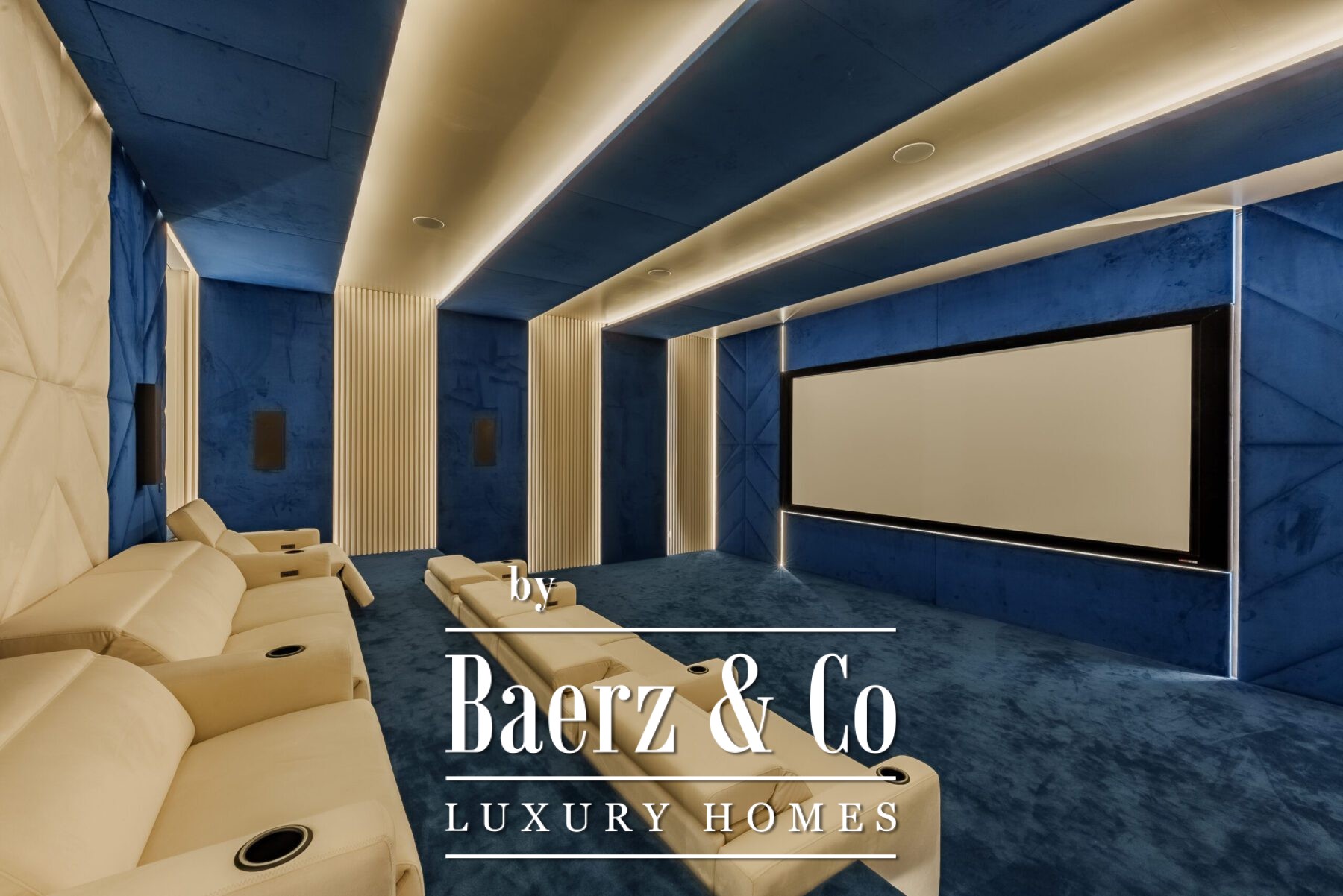 The principal living area is defined by soaring ceilings and full-height glass doors that dissolve into the walls, inviting in natural light and linking the interior with expansive terraces, a landscaped garden, and infinity pool. The open layout invites both intimate moments and vibrant gatherings, reflecting a sophisticated rhythm of daily life.