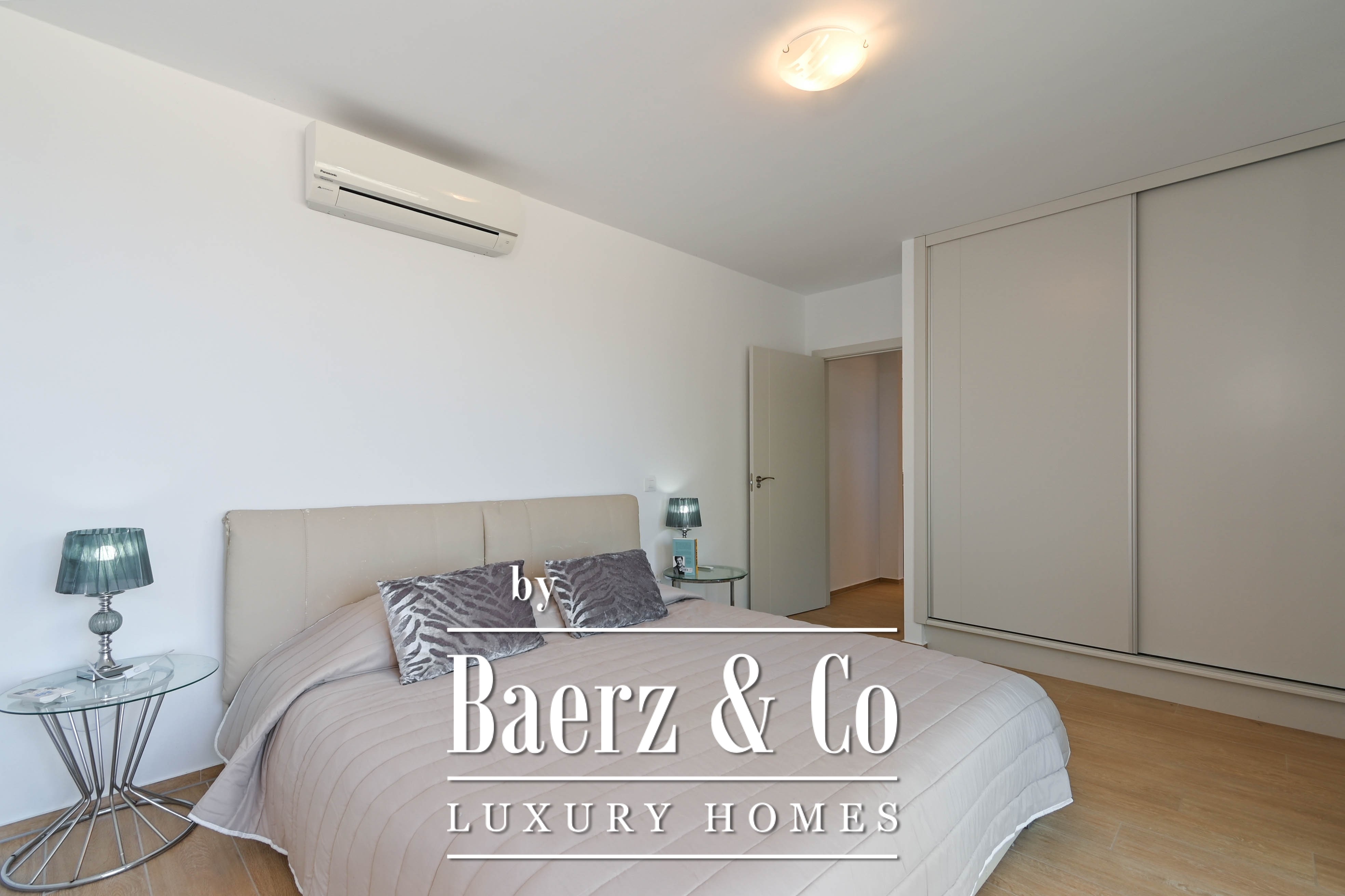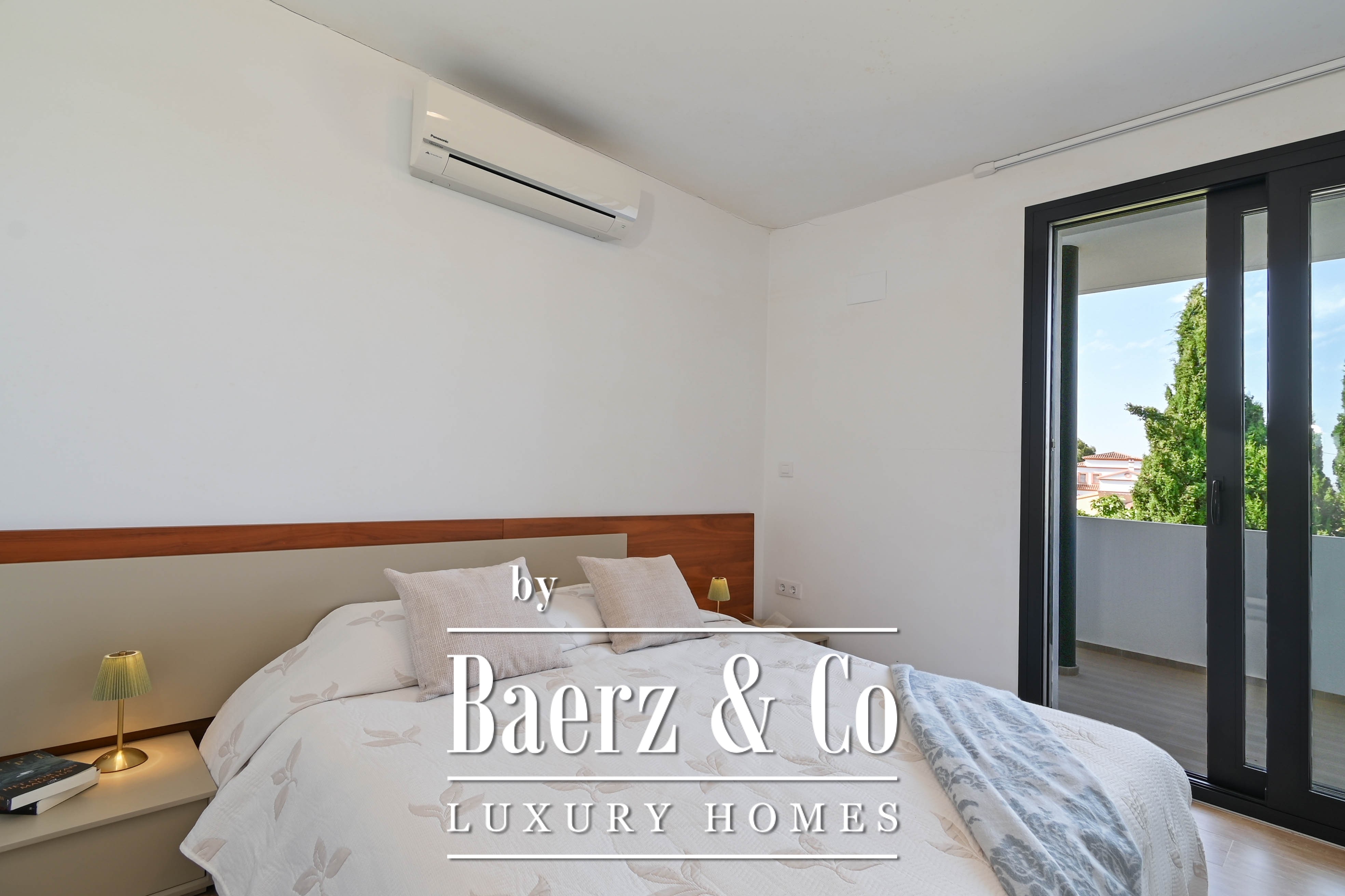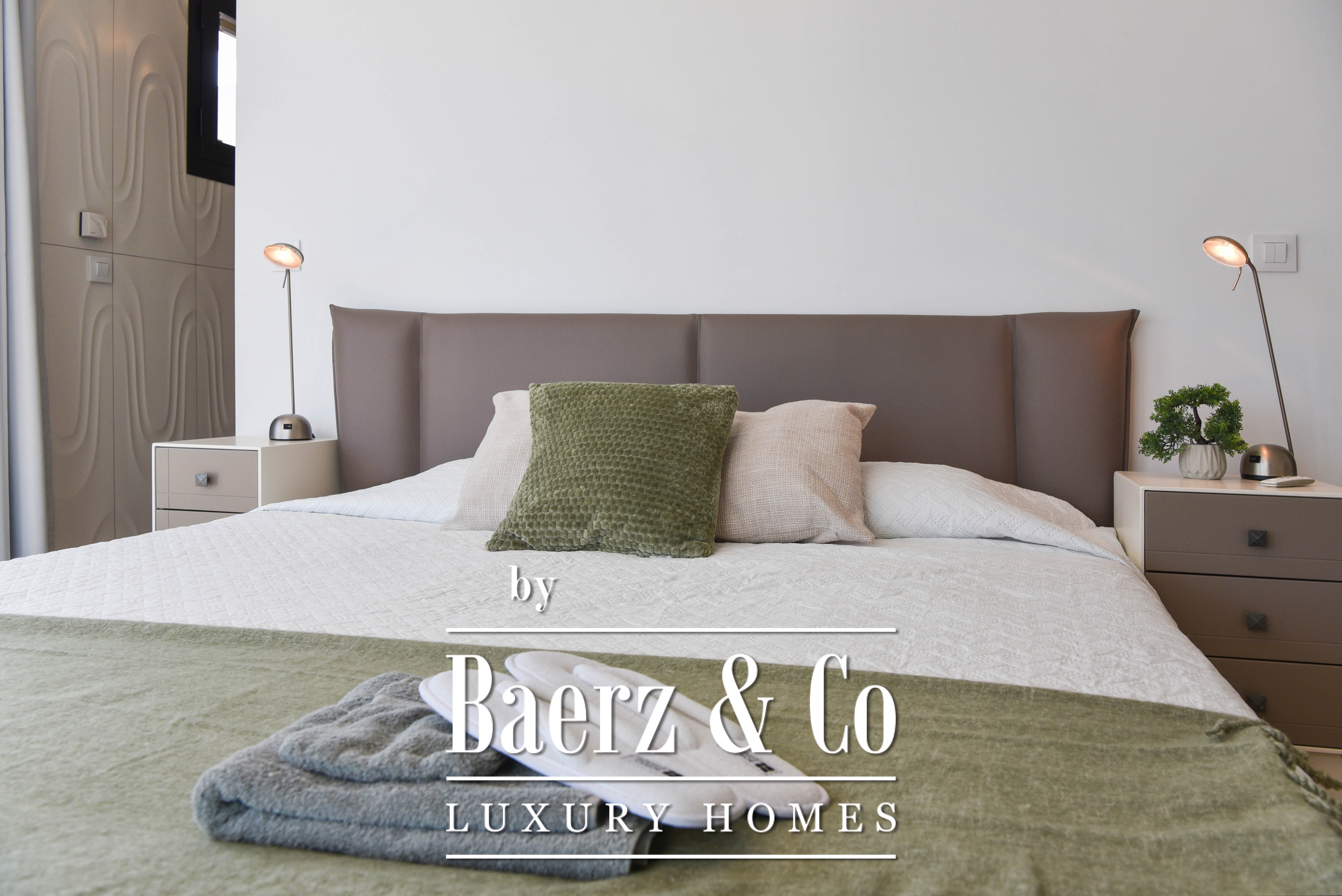 The villa features an open kitchen that flows seamlessly into the bright living area. Large windows create a natural connection between indoors and outdoors, allowing the Mediterranean light to flood in generously.