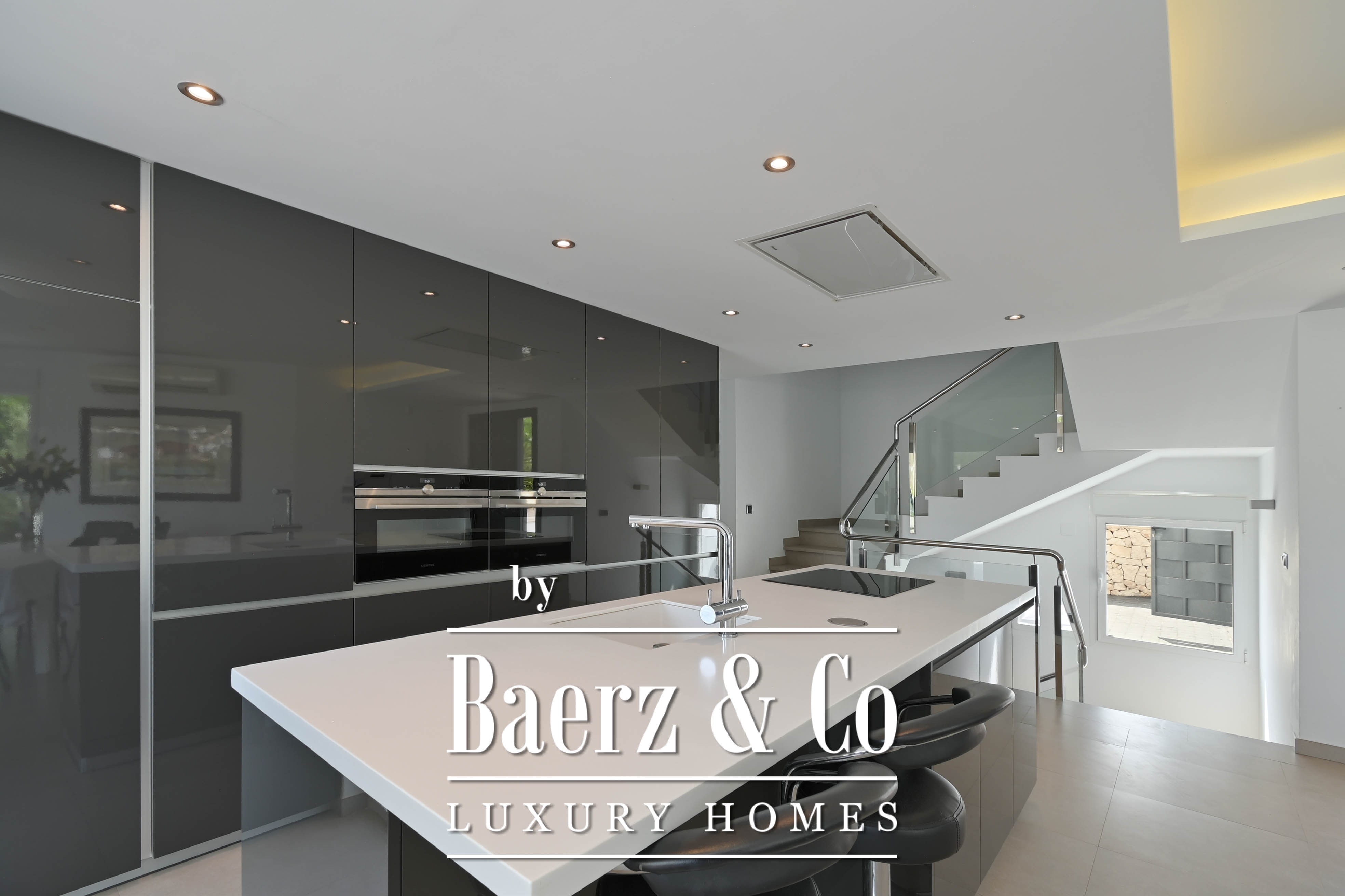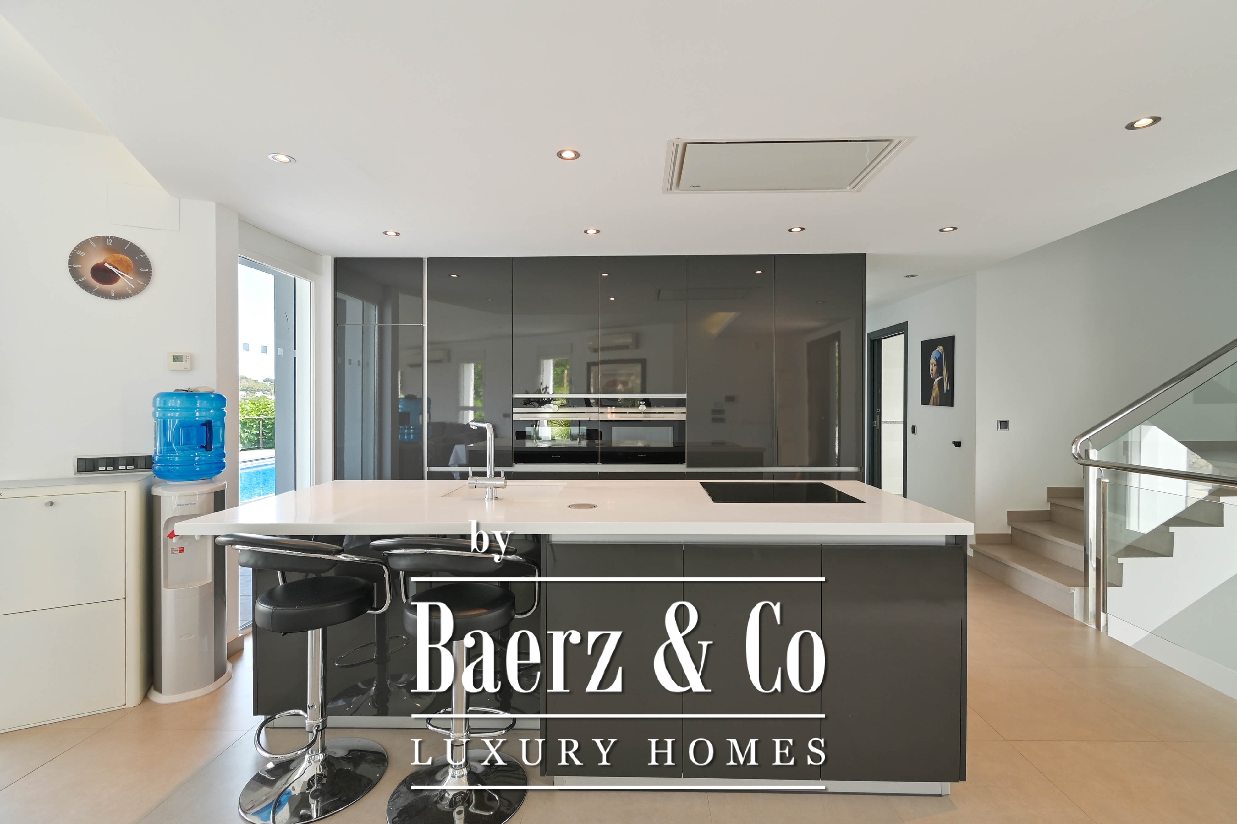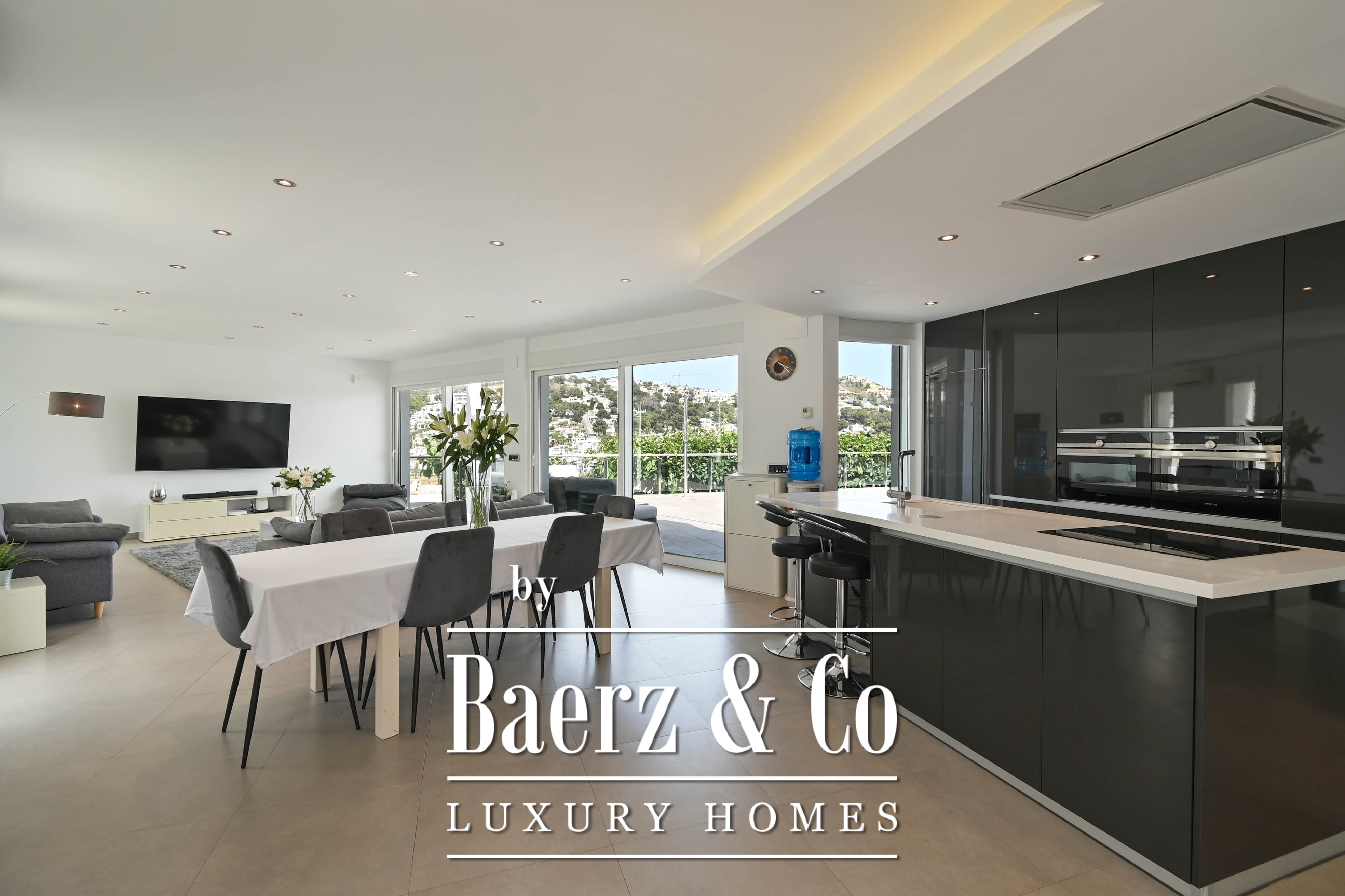 The open kitchen with central island is fully integrated into the living area and forms the heart of the home. Thanks to the large windows, the entire living space enjoys natural light and direct access to the terrace, the pool, and the pleasant outdoor areas – perfect for those who love Mediterranean outdoor living.