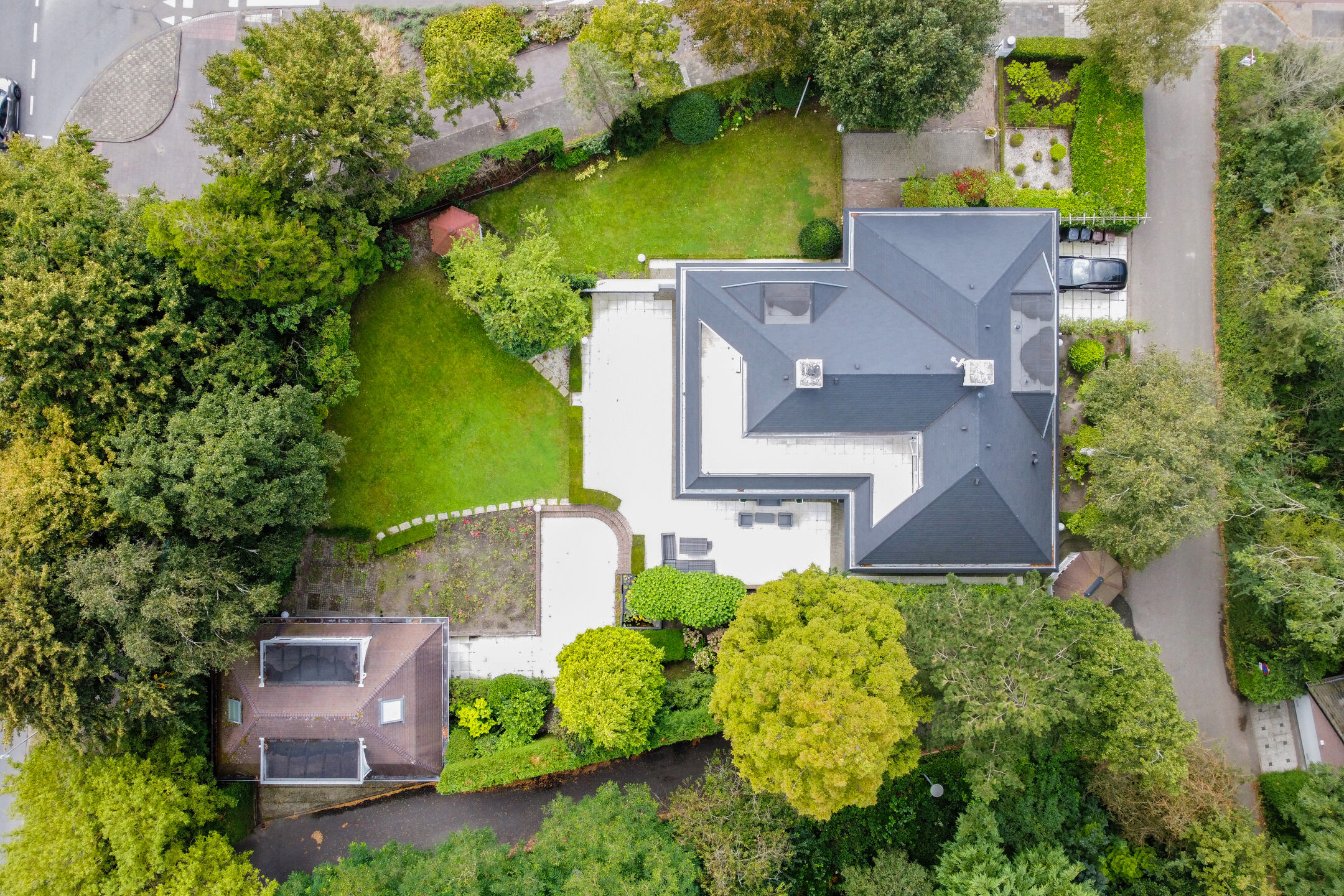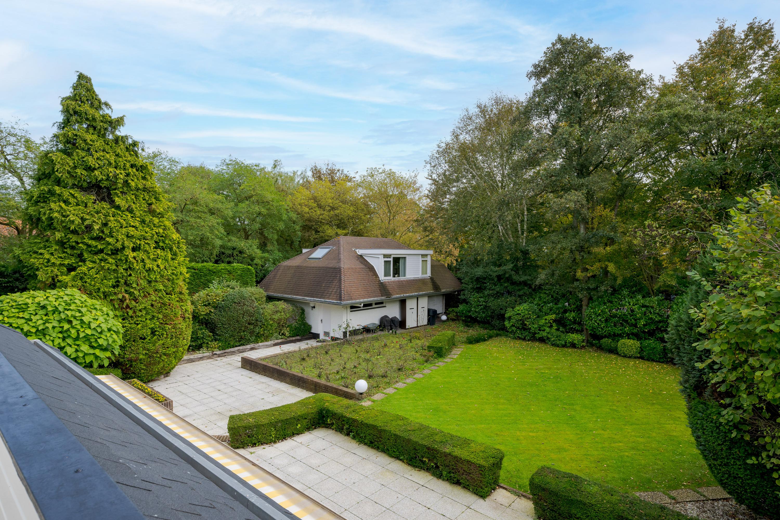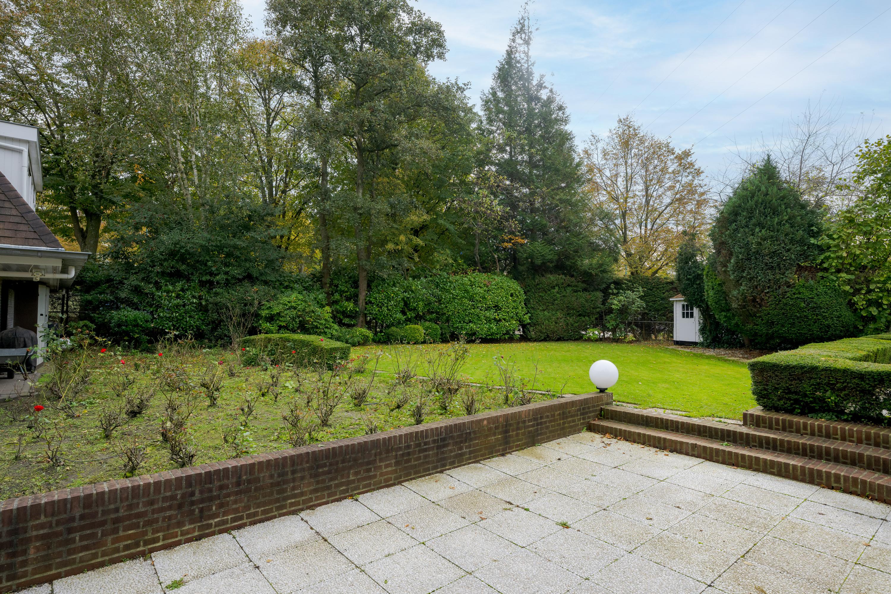 The outbuilding has its own address: Mariahoevelaan 1. One part consists of a spacious garage with fitted wardrobes and the setup for central heating, washing machine, and dryer. The other part has its own entrance on the ground floor, with a living area, kitchen, and a bathroom with toilet, shower, and washbasin. On the first floor, you will find a spacious and bright living room and a bedroom.