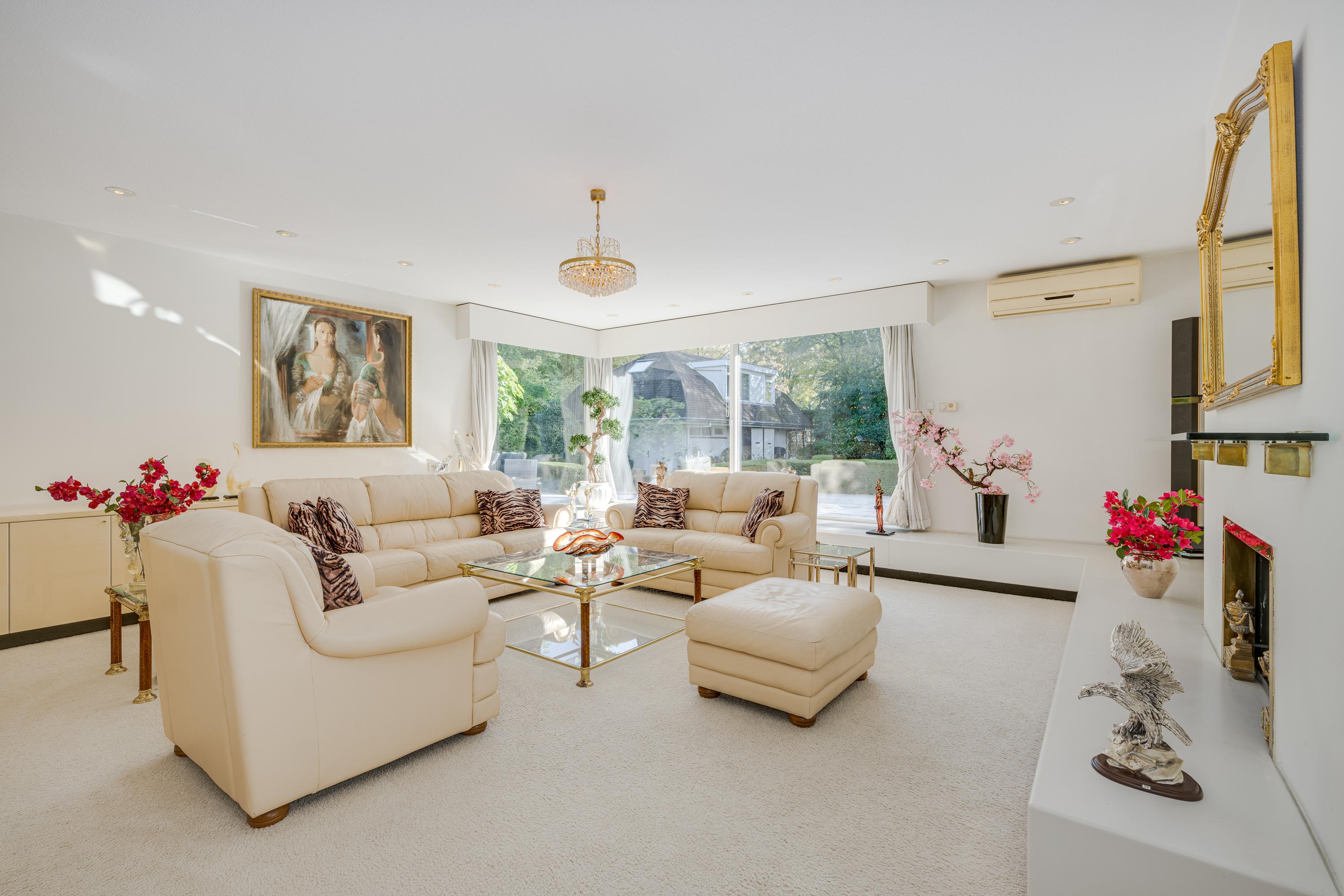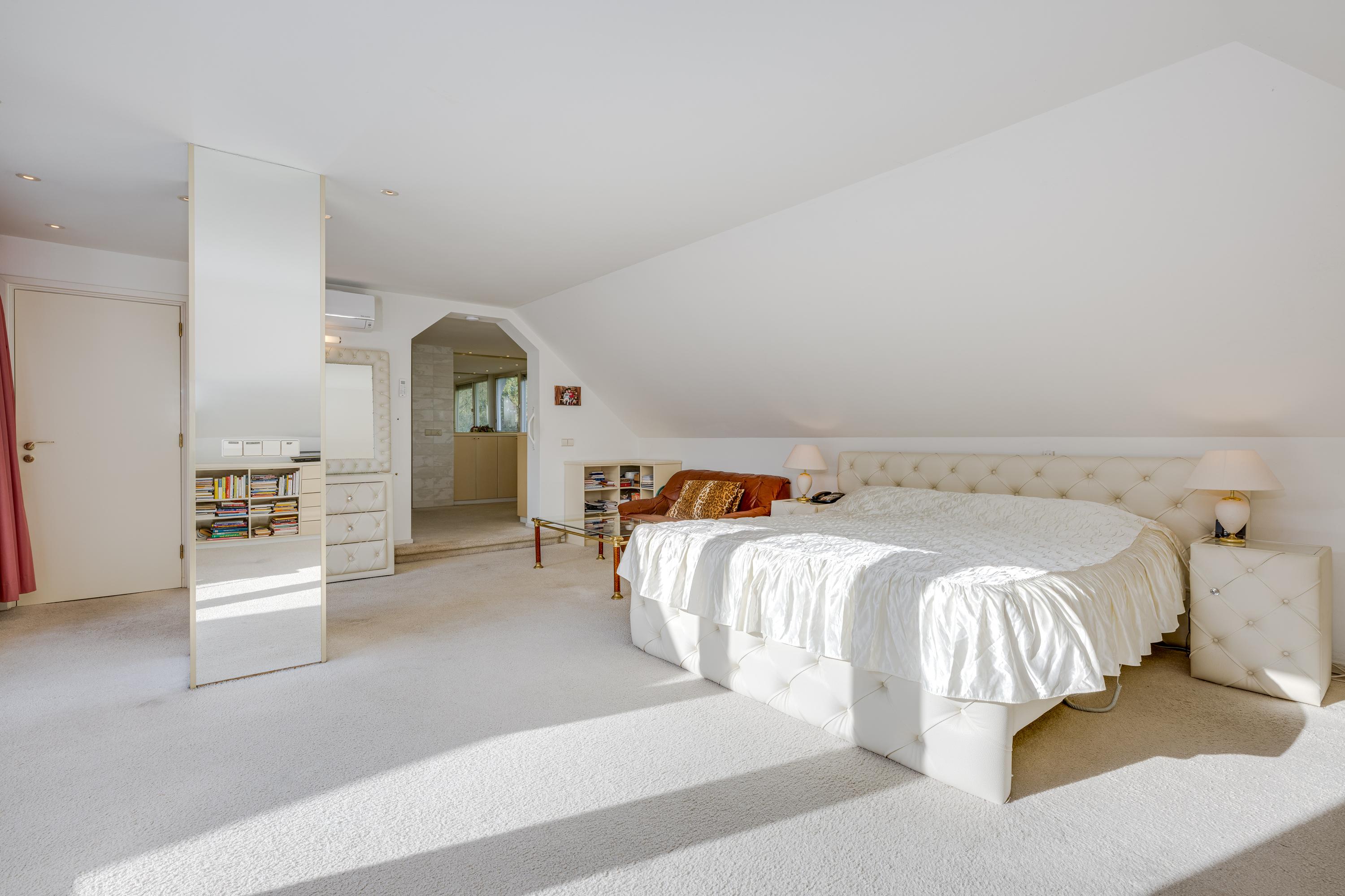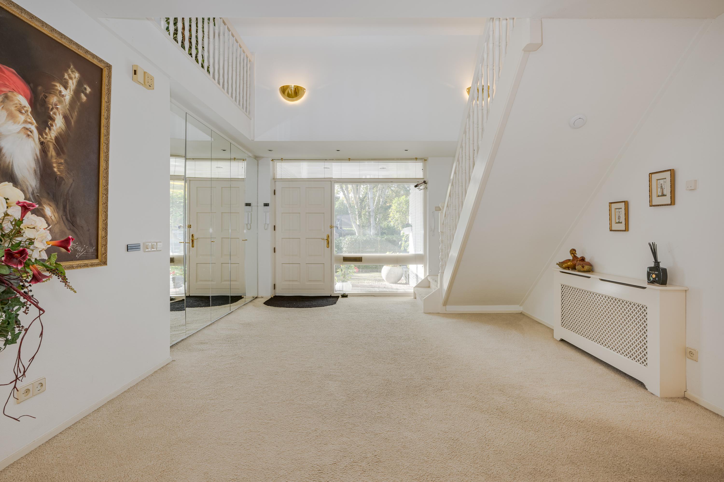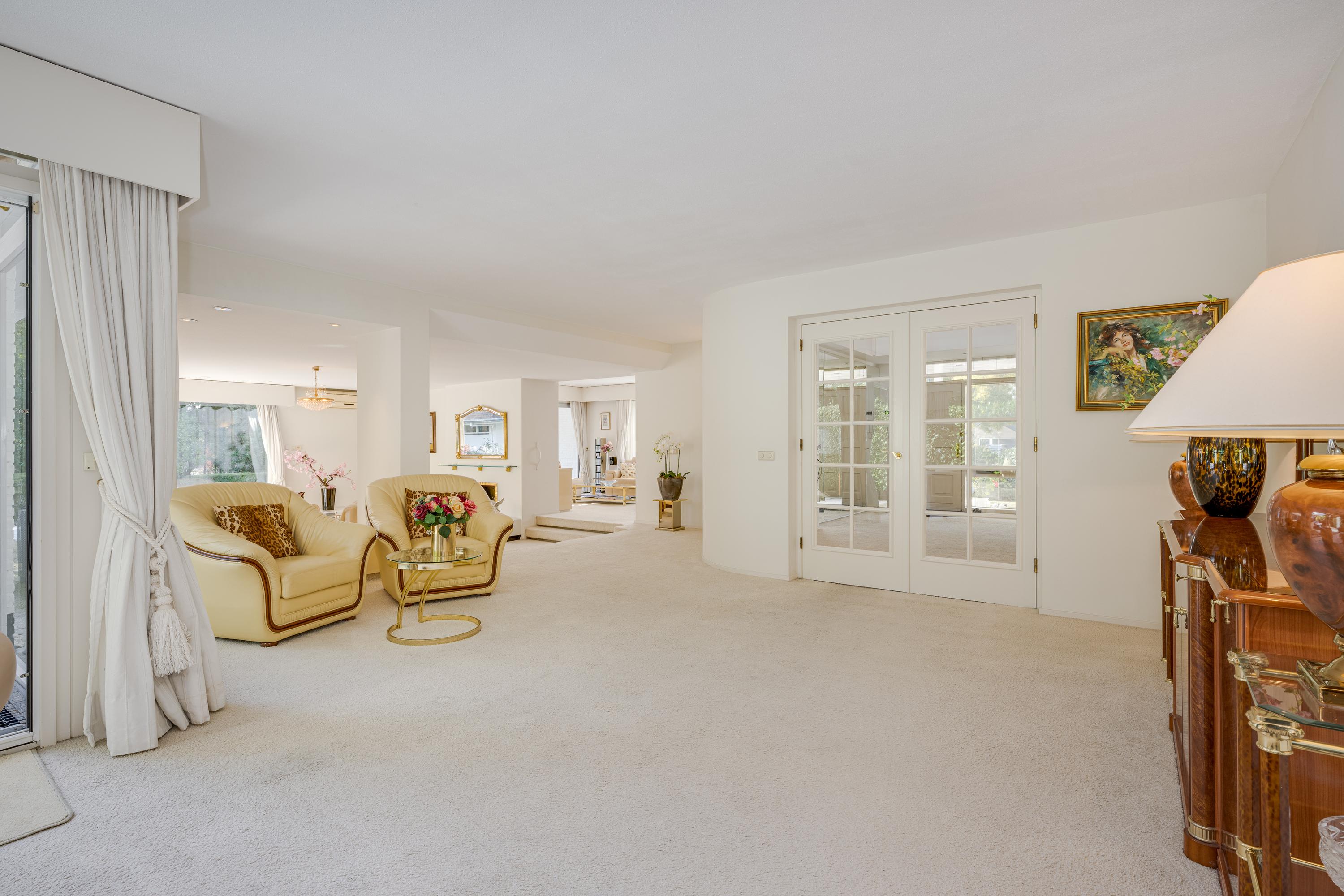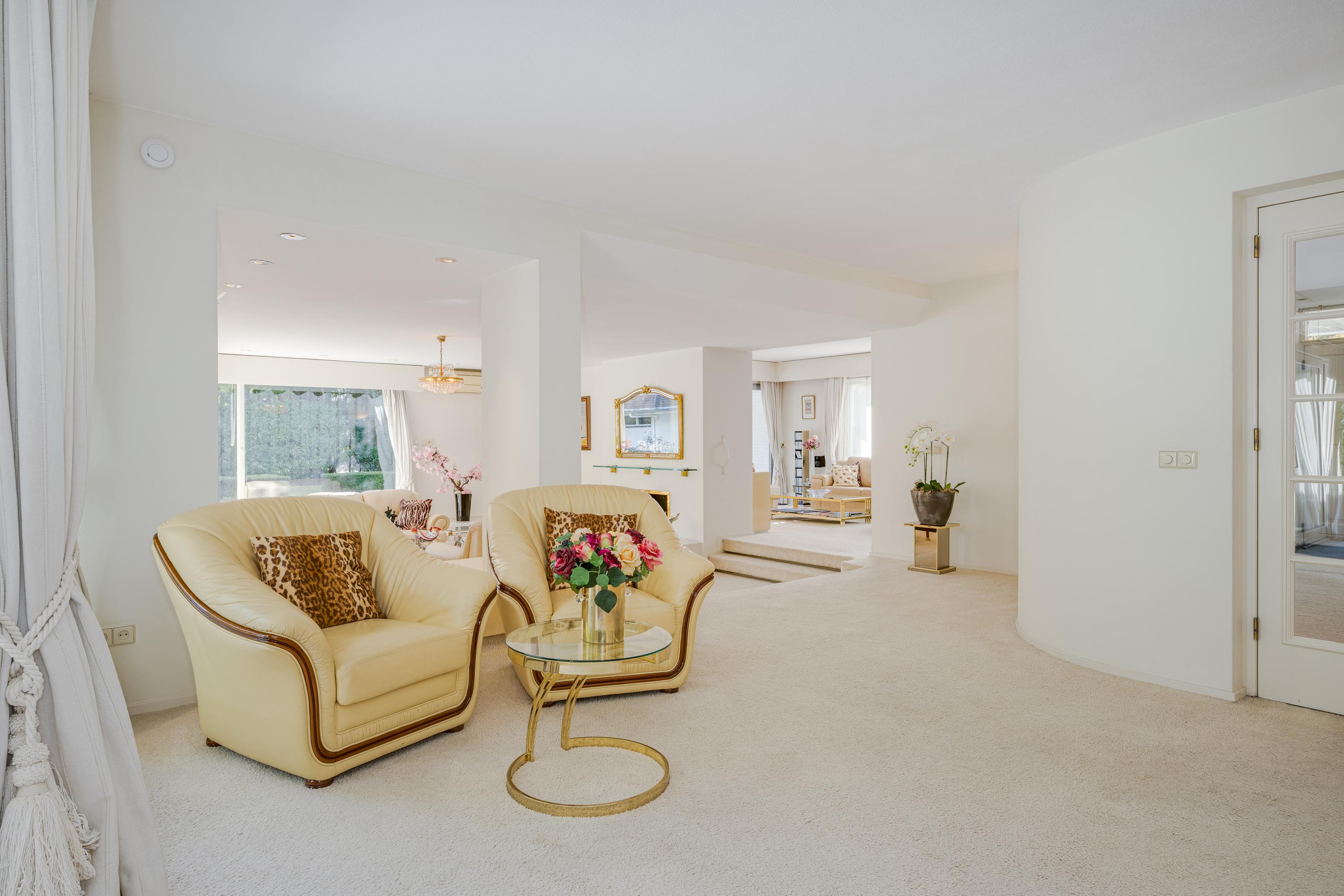 Layout: As you enter the villa, you are welcomed by a bright and spacious entrance hall with a double-height ceiling, highlighted by a grand staircase, where a luxurious high-pile carpet leads you into the living area. There is ample closet space available in the hallway. Walking straight ahead, you enter the living area consisting of a dining room, a living room, and a family room/TV room. The living room features a cosy fireplace. Together, these spaces cover more than 100 m2! Thanks to the large windows and good ceiling height, the rooms feel light and spacious. The house is surrounded by greenery, visible from the large windows in every room.