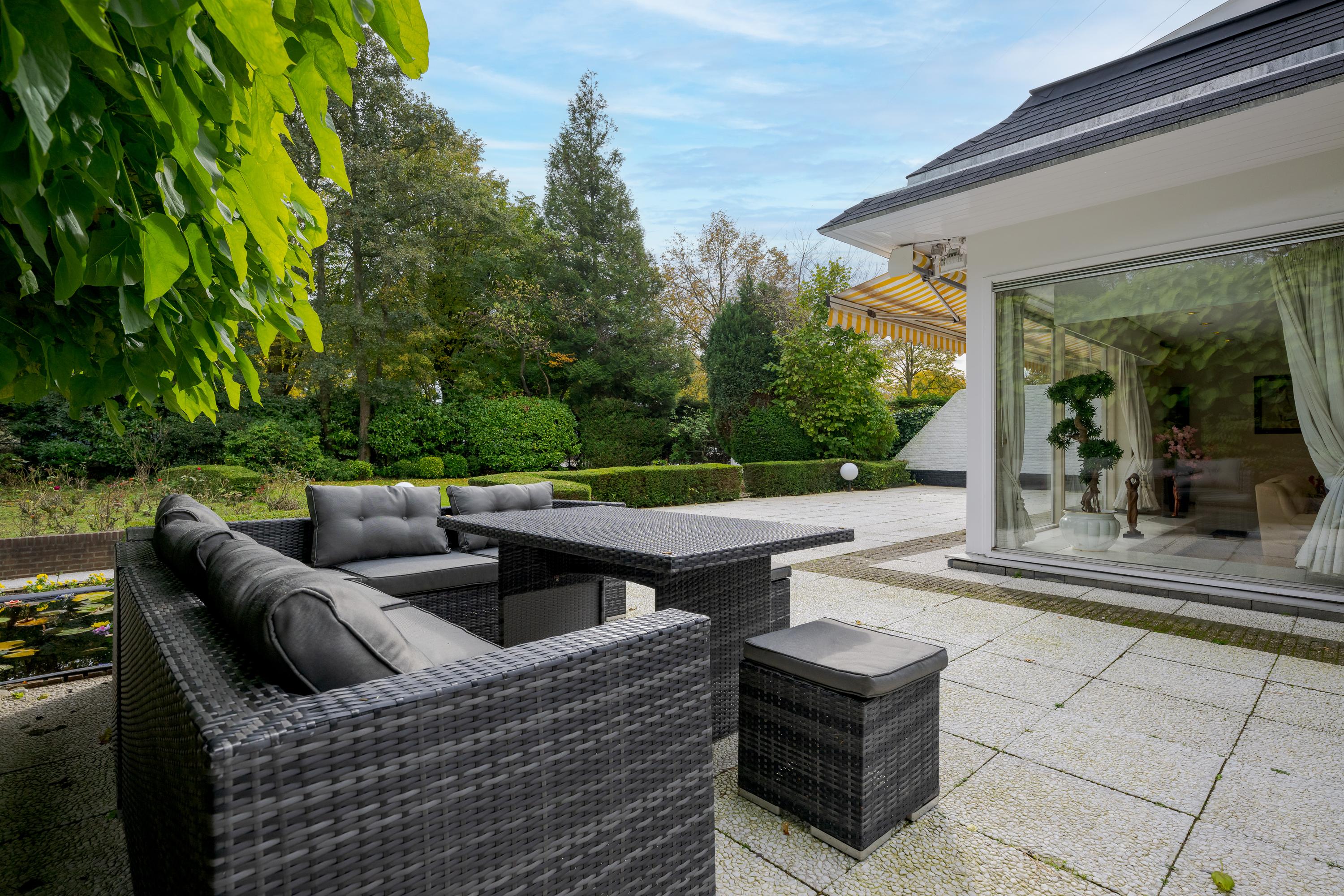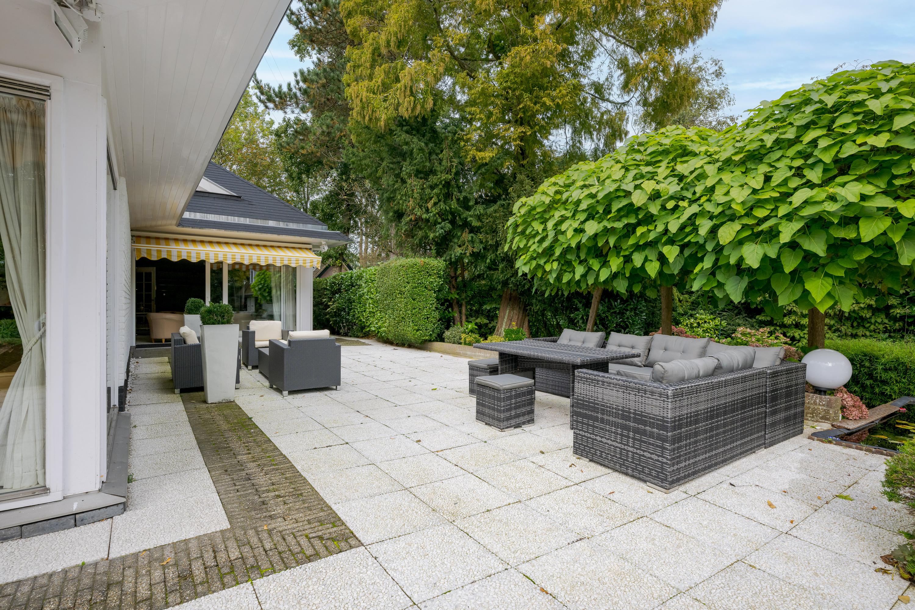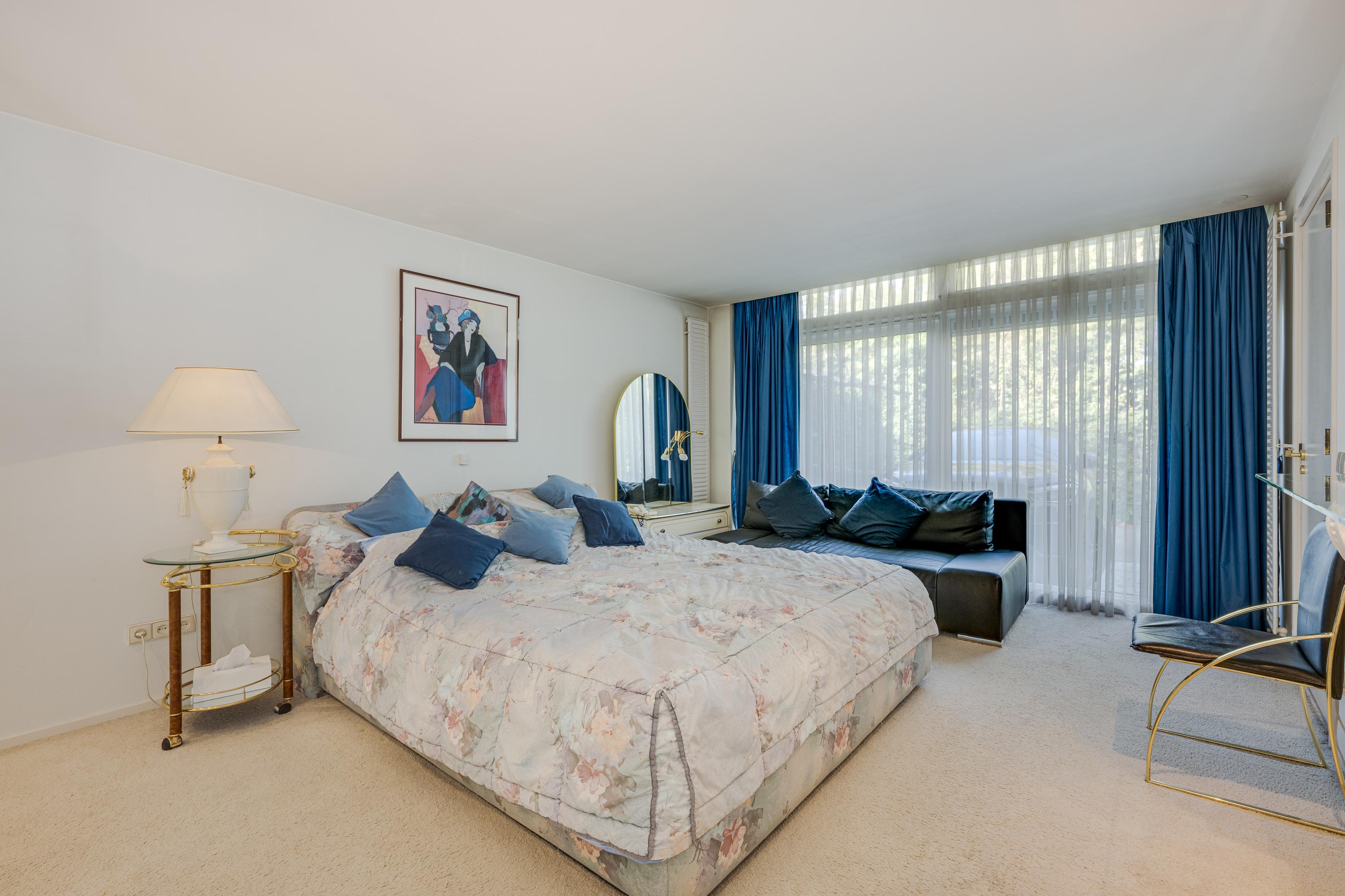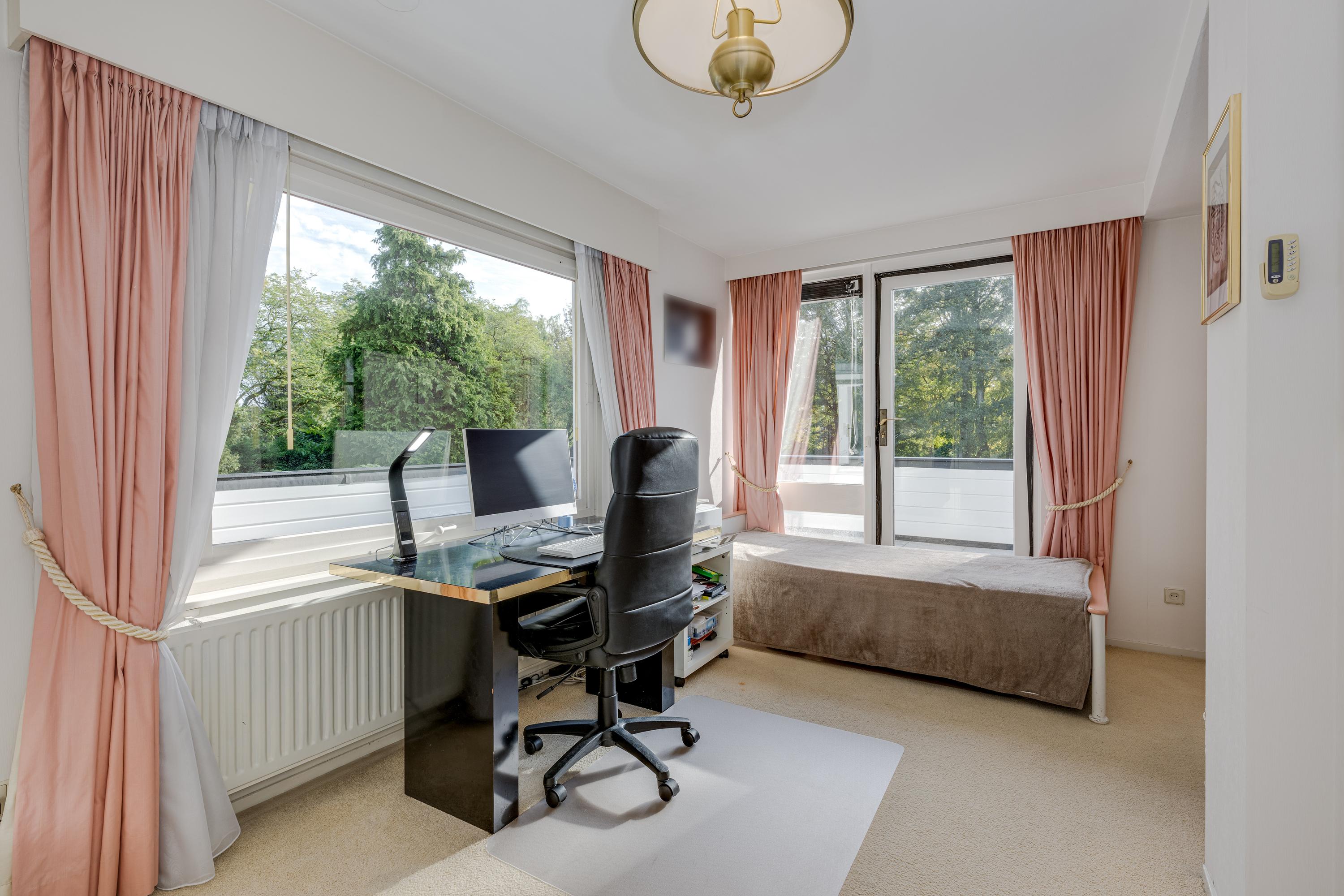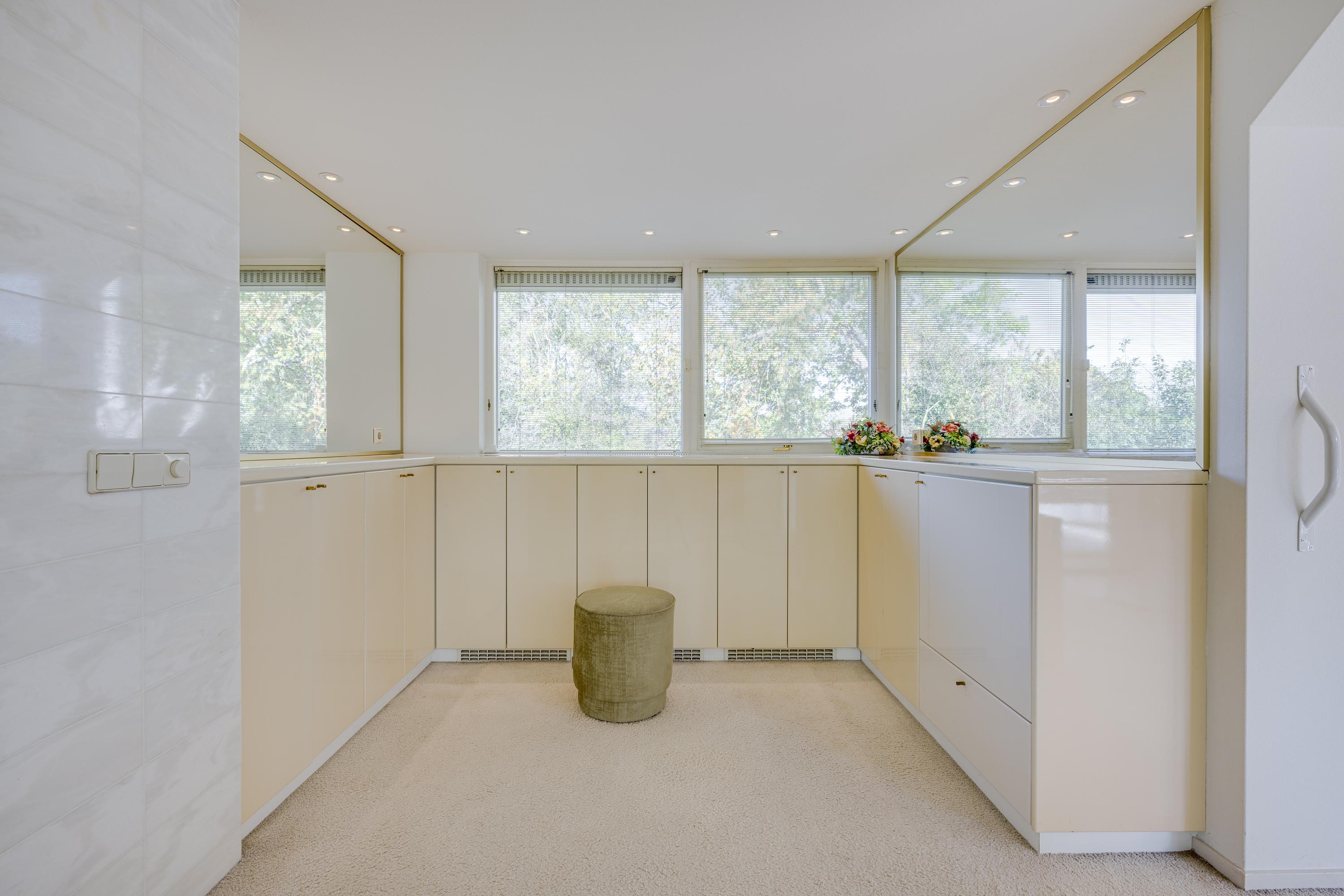 Layout: As you enter the villa, you are welcomed by a bright and spacious entrance hall with a double-height ceiling, highlighted by a grand staircase, where a luxurious high-pile carpet leads you into the living area. There is ample closet space available in the hallway. Walking straight ahead, you enter the living area consisting of a dining room, a living room, and a family room/TV room. The living room features a cosy fireplace. Together, these spaces cover more than 100 m2! Thanks to the large windows and good ceiling height, the rooms feel light and spacious. The house is surrounded by greenery, visible from the large windows in every room.