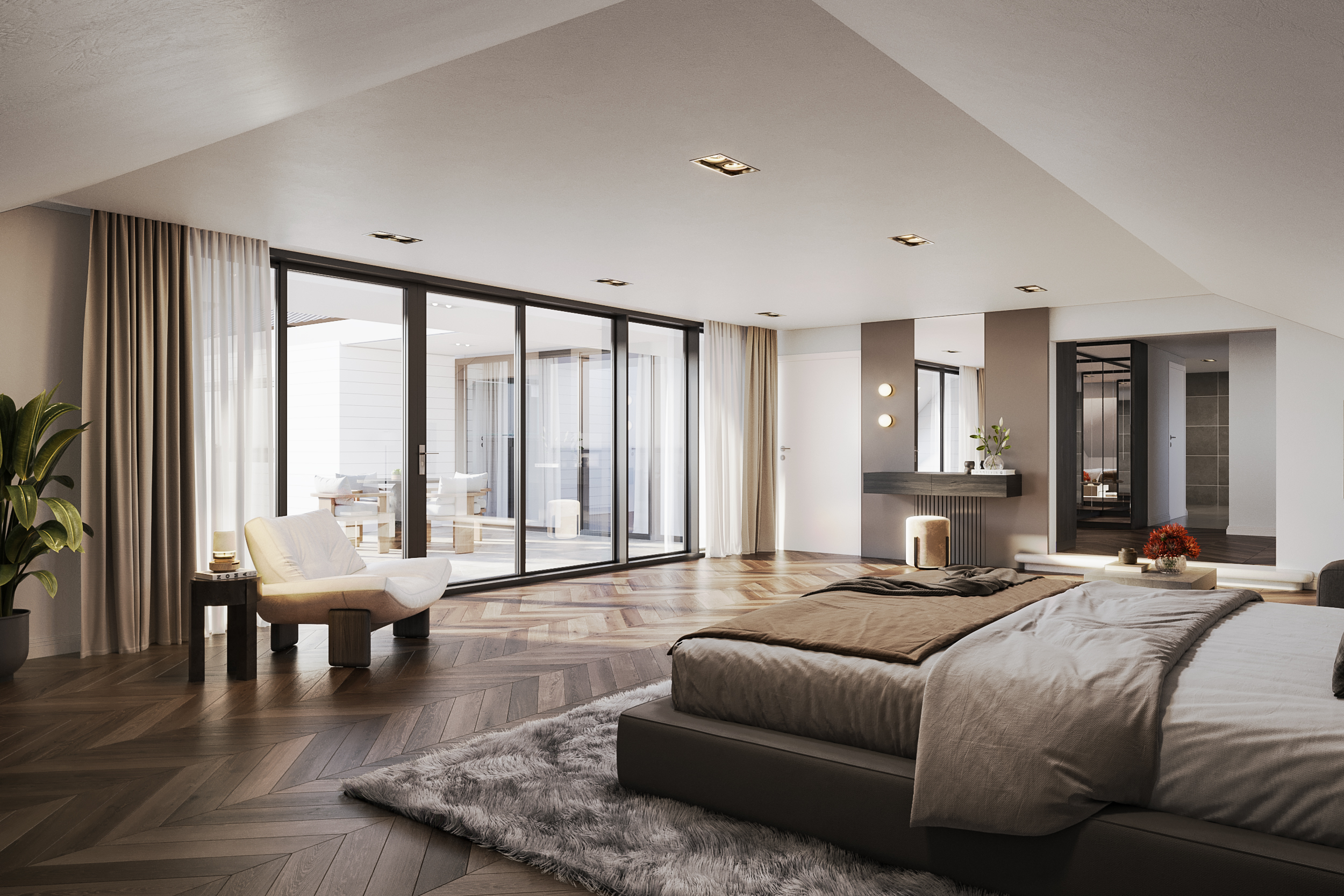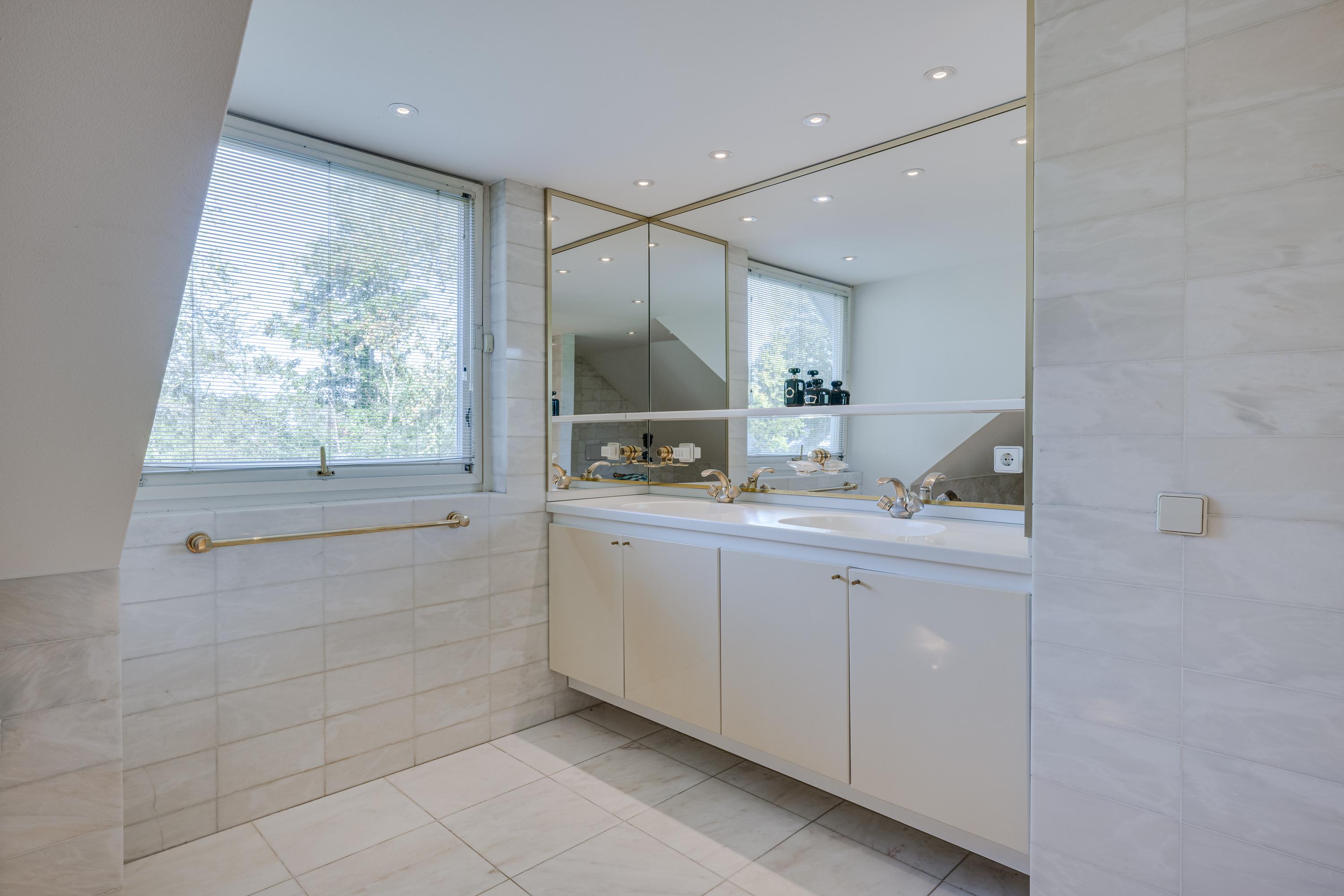 First floor: The landing gives access to 2 bedrooms with a shared bathroom, each with access to the roof terrace. On the other side of the landing is the very spacious master bedroom with fitted wardrobes and a spacious en-suite bathroom. The first part is a walk-in dressing room; in the second part, you will find the bath/jacuzzi, a double washbasin, toilet, and bidet as well as access to the additional dressing room/solarium. The master bedroom also has access to the large roof terrace.