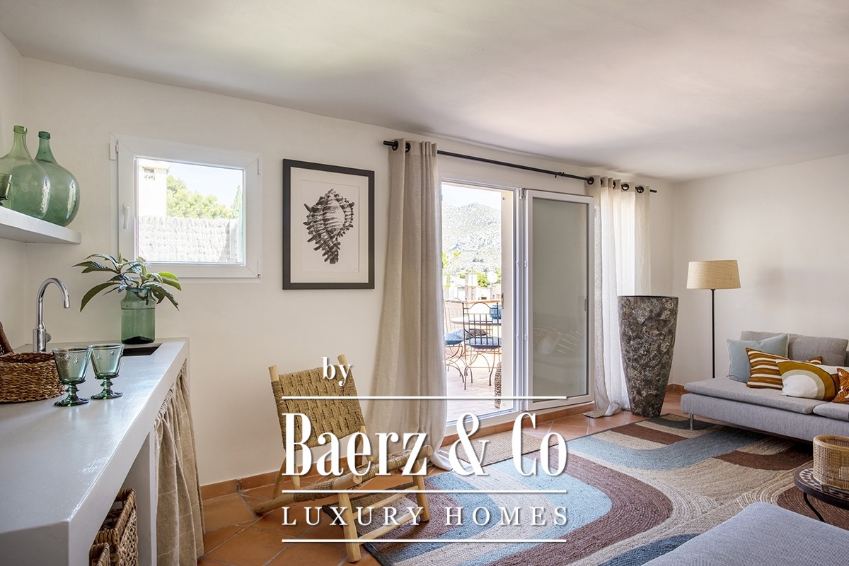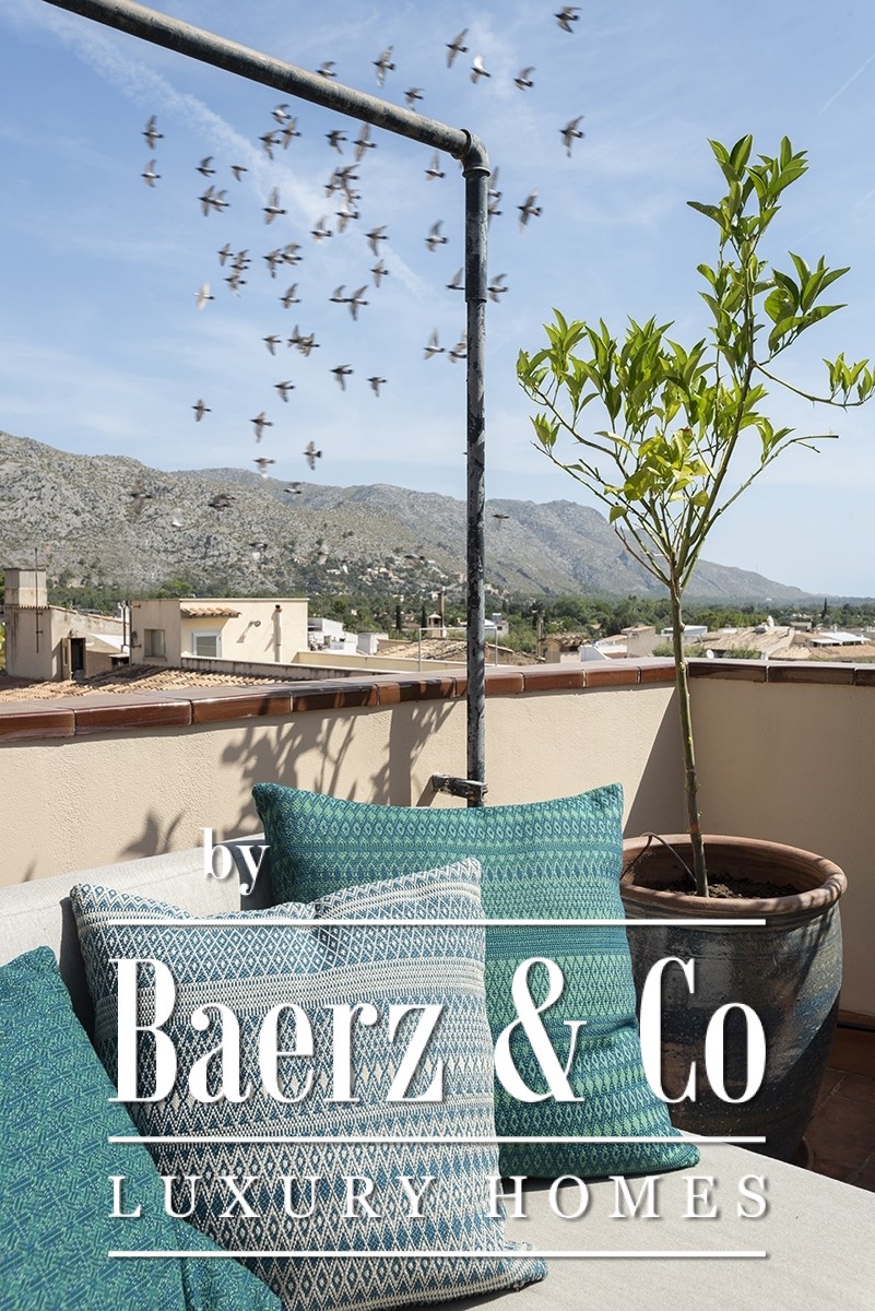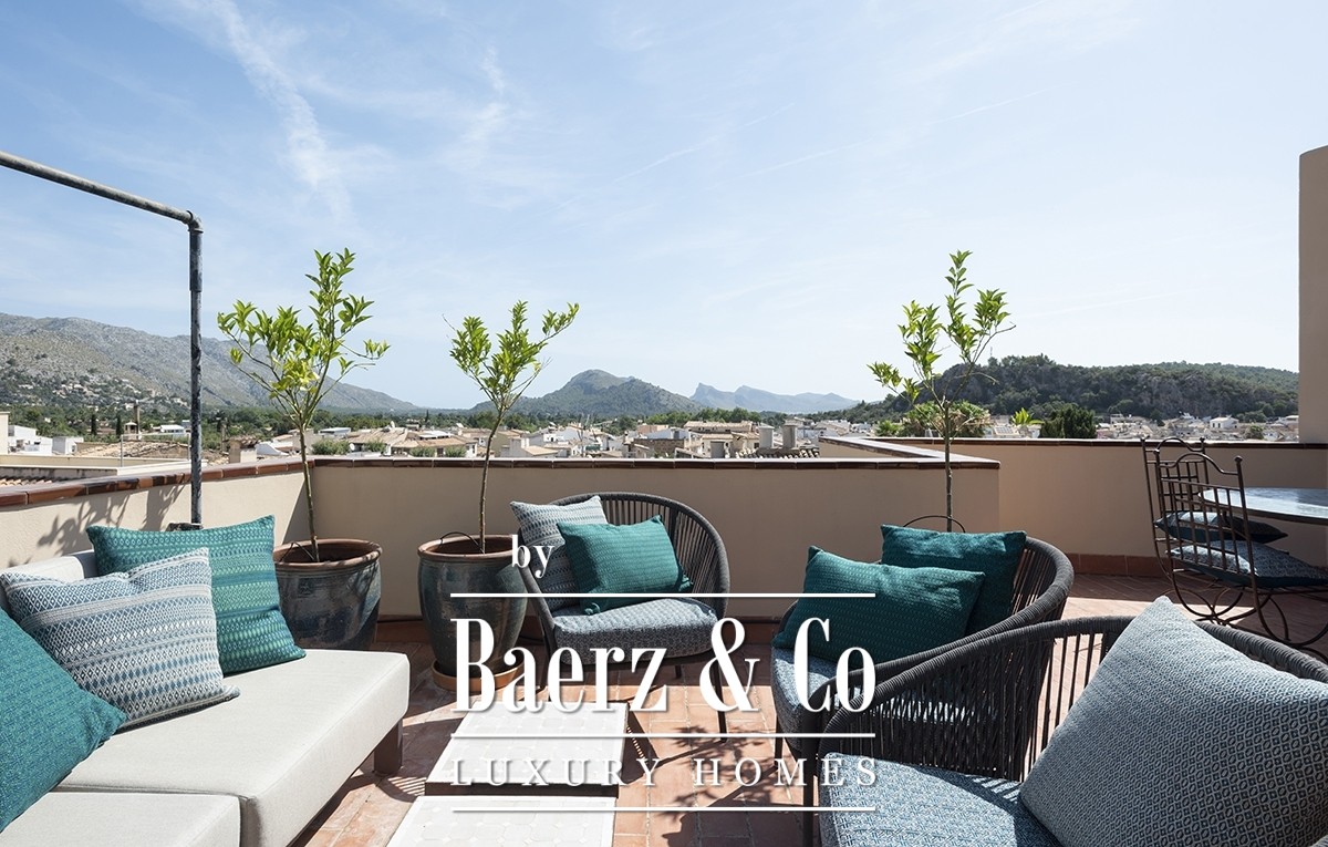 spacious living-dining room, and a bathroom. All three double bedrooms and two complete bathrooms are located on the first floor, all the bedrooms have built-in wardrobes, and one has access to a romantic terrace. The second floor features a brilliant family room with a kitchenette. A large roof terrace with beautiful views over the rooftops of Pollensa and towards the Tramuntana mountains provides plenty of space to spend quality time with friends and family. Pollensa is experiencing a boom in renovations, breathing new life into the town and adding to its magic. Authentic pebbled streets and alleyways, stone facades with new splendour, and homes lit up with families enjoying beautiful residences complete the picture. Ready to move in, the sale of this beautiful home includes designer furniture, vintage pieces, and art objects by renowned artists. This is a superb option if you are looking for a townhouse in an outstanding location.