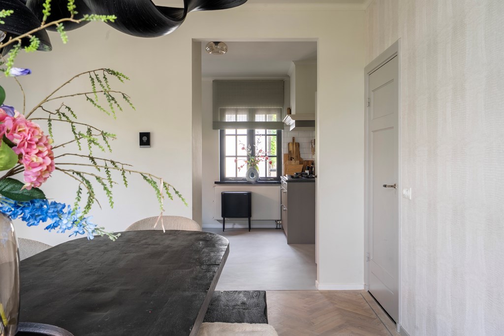 On the other side of the hall is the luxurious kitchen. Spacious and modern, it is fitted with high-quality built-in appliances and offers extensive work and storage space—a dream for any cooking enthusiast, with plenty of room for serious cooking and baking. The kitchen flows seamlessly into the dining room, an inviting space that comfortably accommodates larger gatherings—ideal for relaxed family dinners or more formal occasions with friends. From the kitchen you also have access to the practical utility room, perfect for extra storage and as a laundry area.