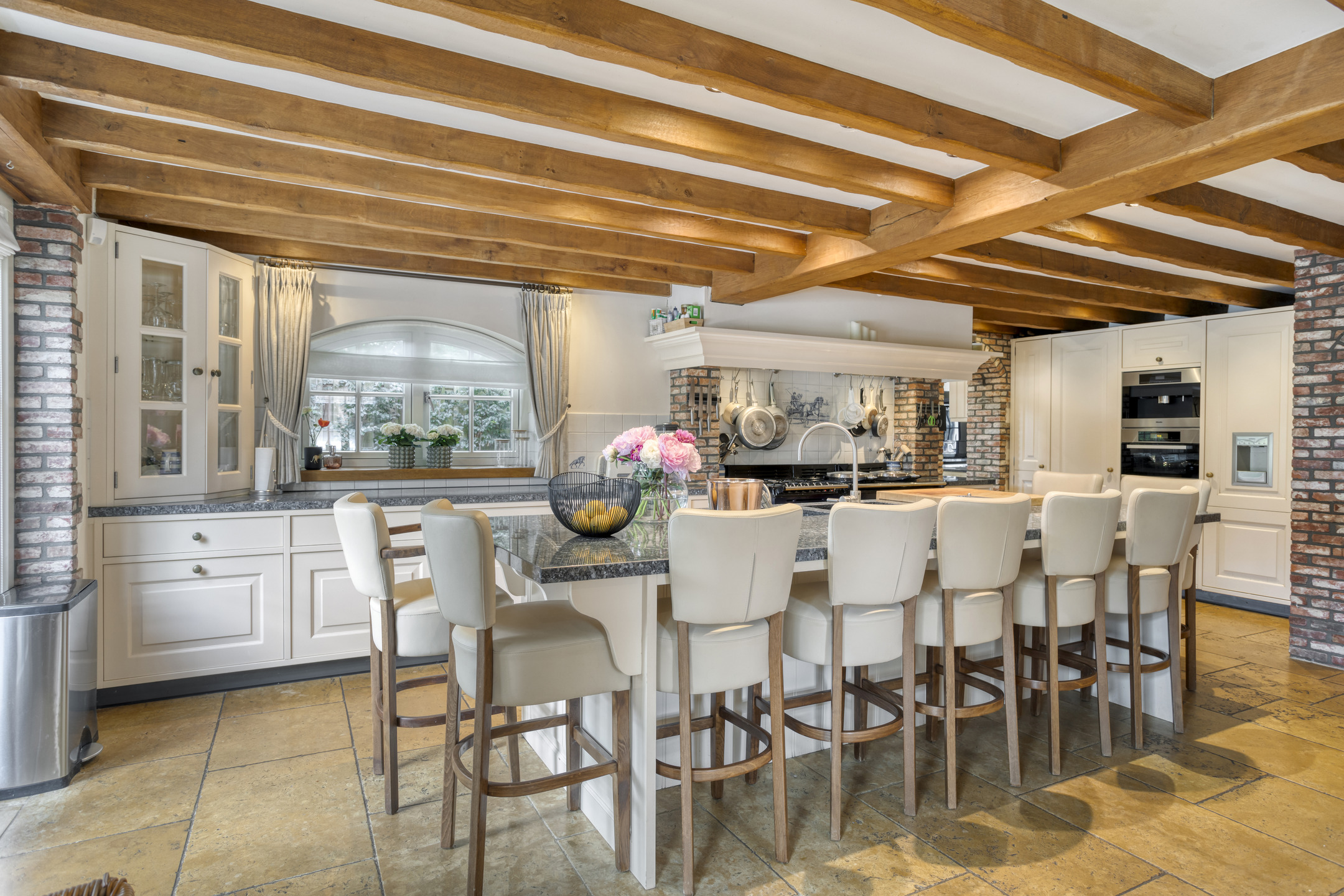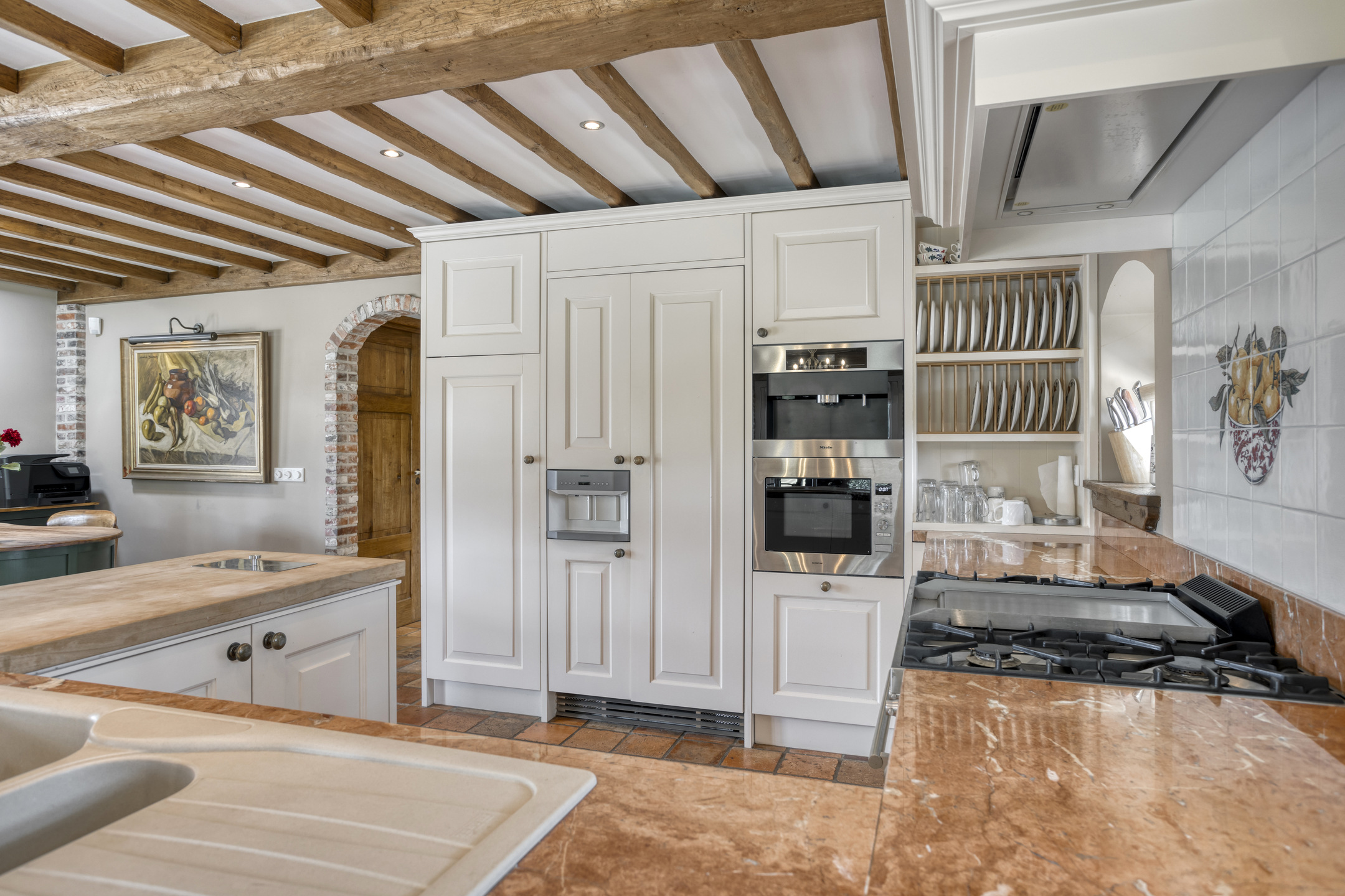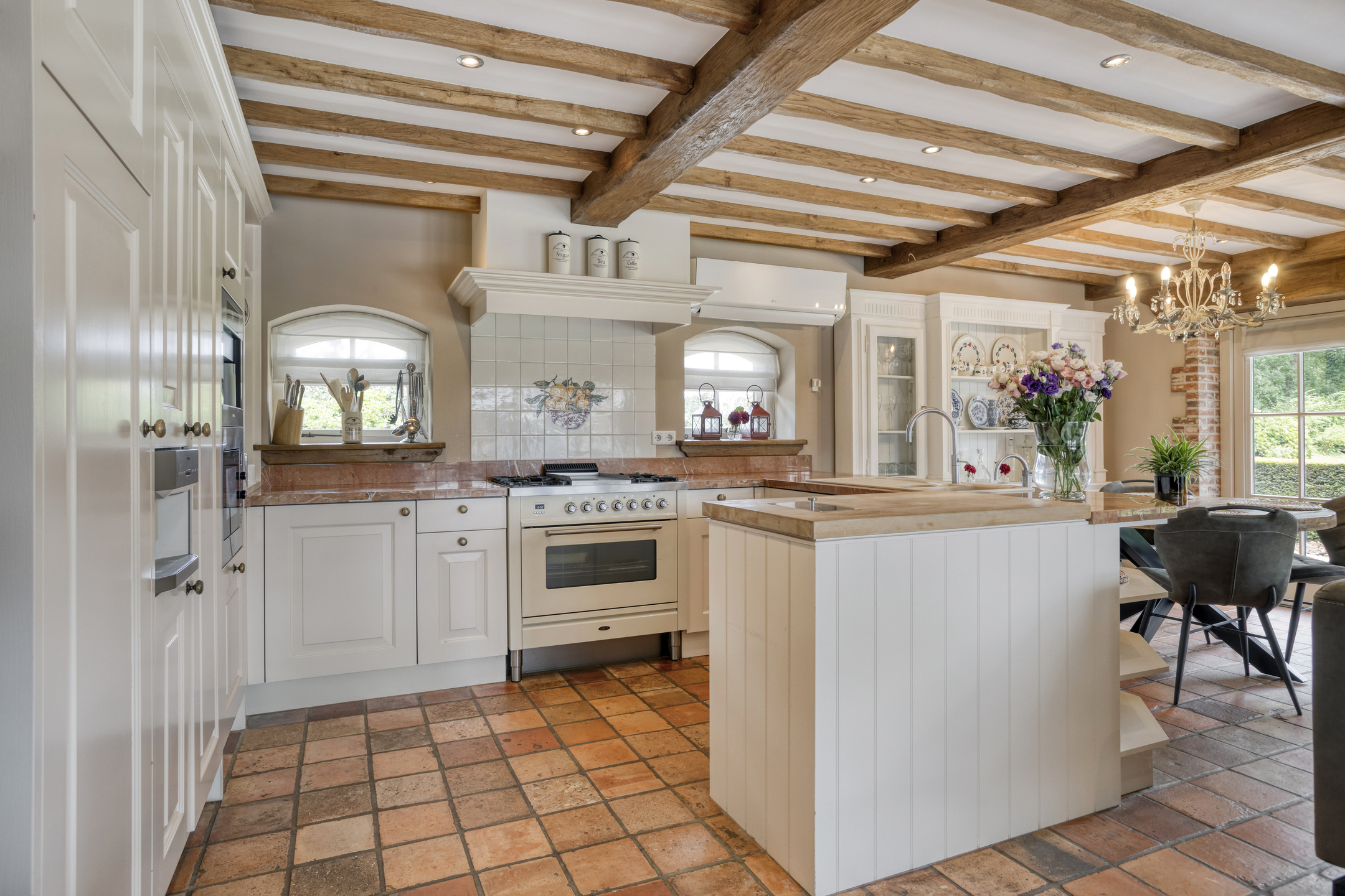 Spacious entrance hall with marble floor, toilet, meter cupboard and beautiful hardwood staircase to the first floor. The hall provides access to the dining room and to a corridor leading to the kitchen, bedrooms and bathroom. Toilet with marble floor and wall tiles, free-hanging toilet and washbasin. Spacious, attractive dining room with marble floor, beamed ceiling and plenty of space for a large dining table. The dining room provides access to the living room. Spacious, stylish living room with wooden floor, large fireplace (wood), a very high ceiling with a unique beam construction and a beautiful mezzanine that provides access to one of the bedrooms. The large and attractive kitchen has marble flooring, a beamed ceiling with recessed spotlights and two double French doors to the covered terrace. On the garden side, the kitchen has a spacious and cosy sitting area with a fireplace (gas). The kitchen consists of a wall unit with a worktop with cooking area, a large cupboard wall and a sink island with bar area. The kitchen is equipped with a marble worktop with various cupboards and drawers, a large AGA stove with various types of ovens, a gas stove, two hotplates and an extractor hood. The “cupboard wall” consists of a large refrigerator, freezer with ice cube function, coffee machine, combi-oven/microwave, steam oven and various cupboards. The sink island, equipped with a marble top with double sink and a bar with no fewer than nine seats, forms the central point in the kitchen. The island also has a dishwasher and various cupboards.
