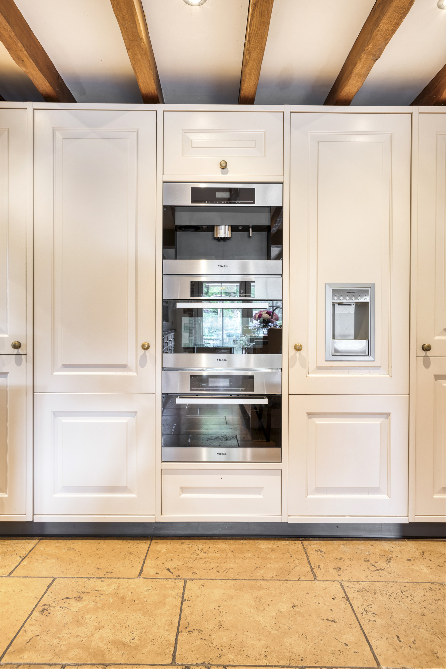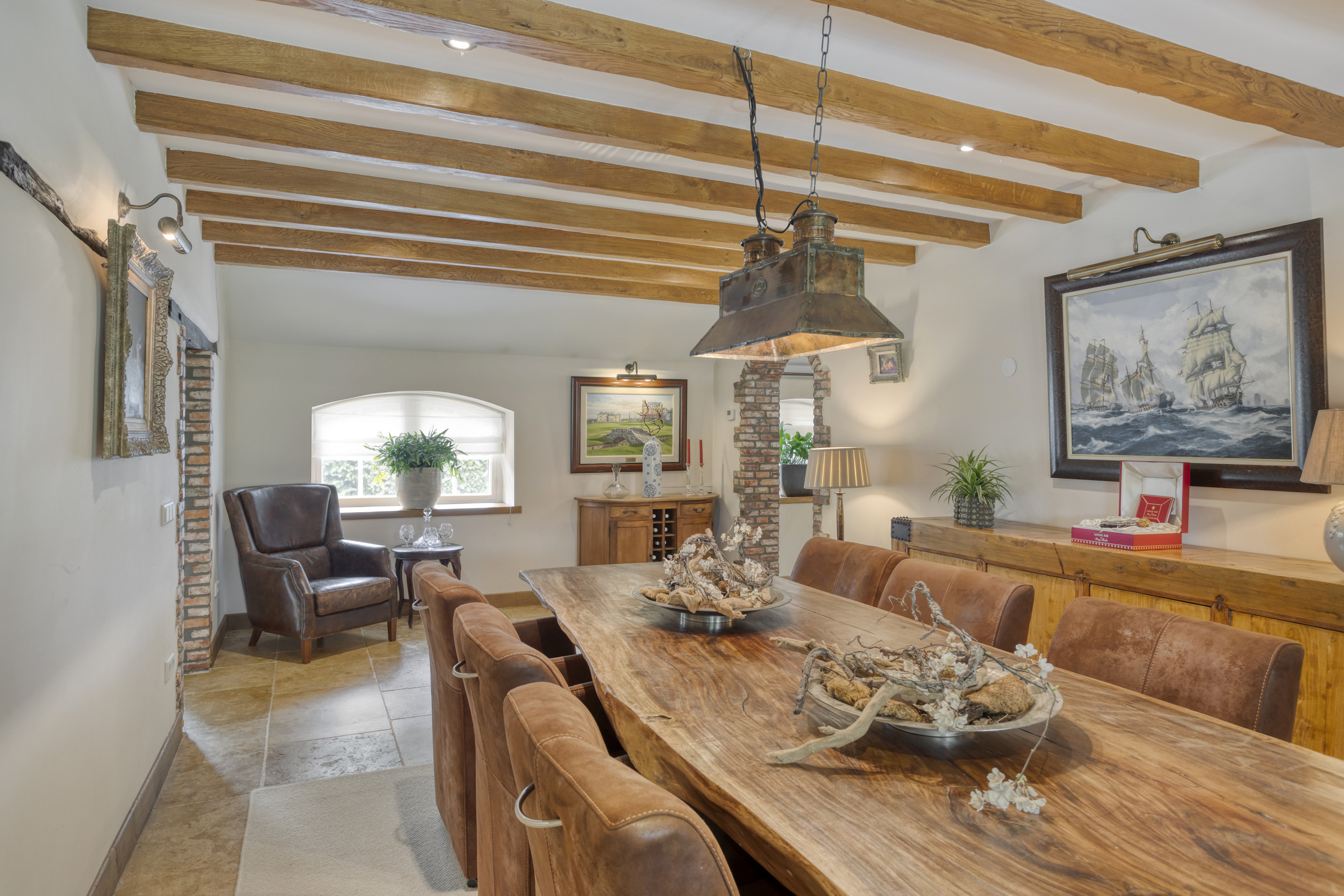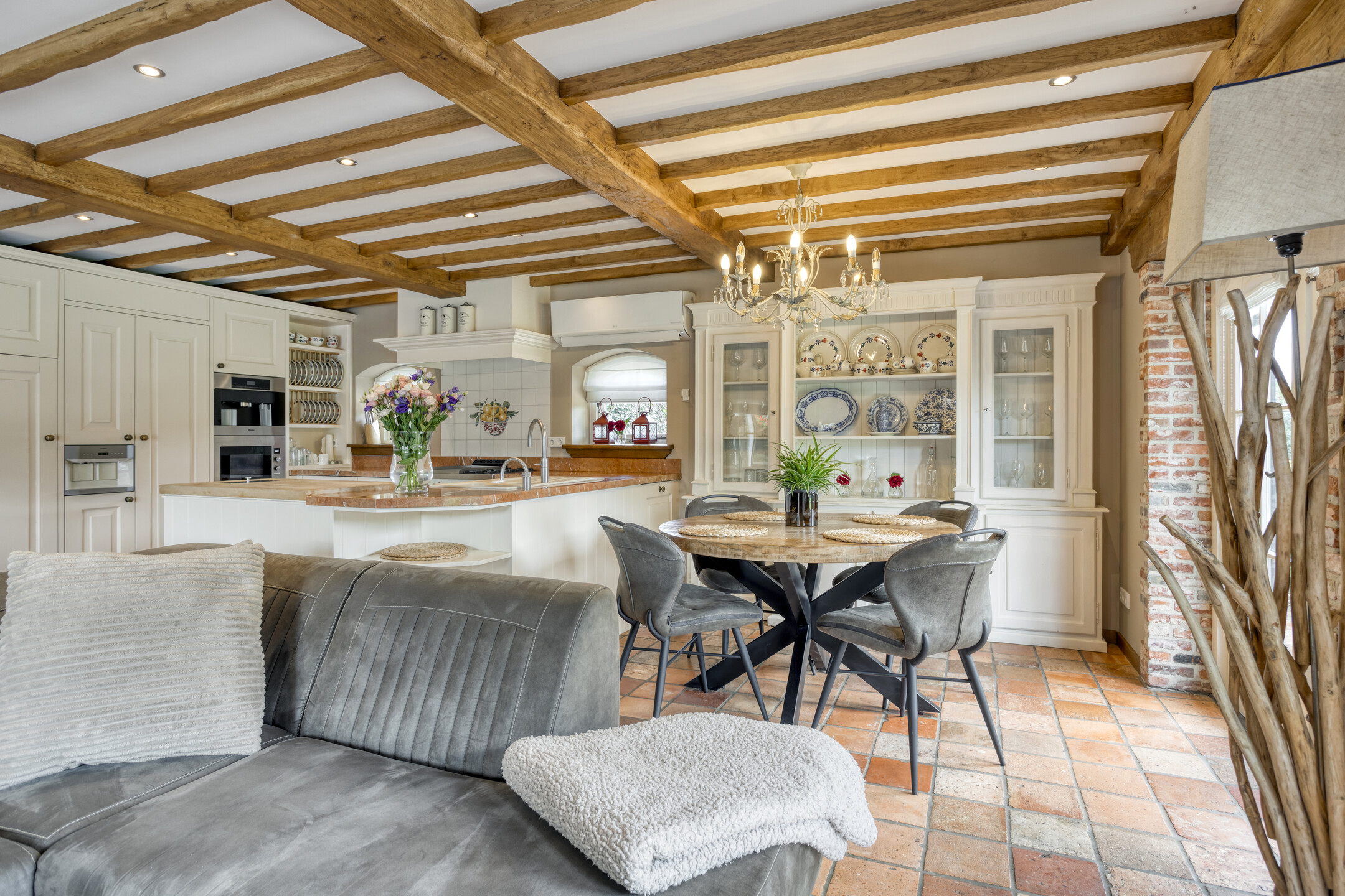 Spacious entrance hall with marble floor, toilet, meter cupboard and beautiful hardwood staircase to the first floor. The hall provides access to the dining room and to a corridor leading to the kitchen, bedrooms and bathroom. Toilet with marble floor and wall tiles, free-hanging toilet and washbasin. Spacious, attractive dining room with marble floor, beamed ceiling and plenty of space for a large dining table. The dining room provides access to the living room. Spacious, stylish living room with wooden floor, large fireplace (wood), a very high ceiling with a unique beam construction and a beautiful mezzanine that provides access to one of the bedrooms. The large and attractive kitchen has marble flooring, a beamed ceiling with recessed spotlights and two double French doors to the covered terrace. On the garden side, the kitchen has a spacious and cosy sitting area with a fireplace (gas). The kitchen consists of a wall unit with a worktop with cooking area, a large cupboard wall and a sink island with bar area. The kitchen is equipped with a marble worktop with various cupboards and drawers, a large AGA stove with various types of ovens, a gas stove, two hotplates and an extractor hood. The “cupboard wall” consists of a large refrigerator, freezer with ice cube function, coffee machine, combi-oven/microwave, steam oven and various cupboards. The sink island, equipped with a marble top with double sink and a bar with no fewer than nine seats, forms the central point in the kitchen. The island also has a dishwasher and various cupboards.