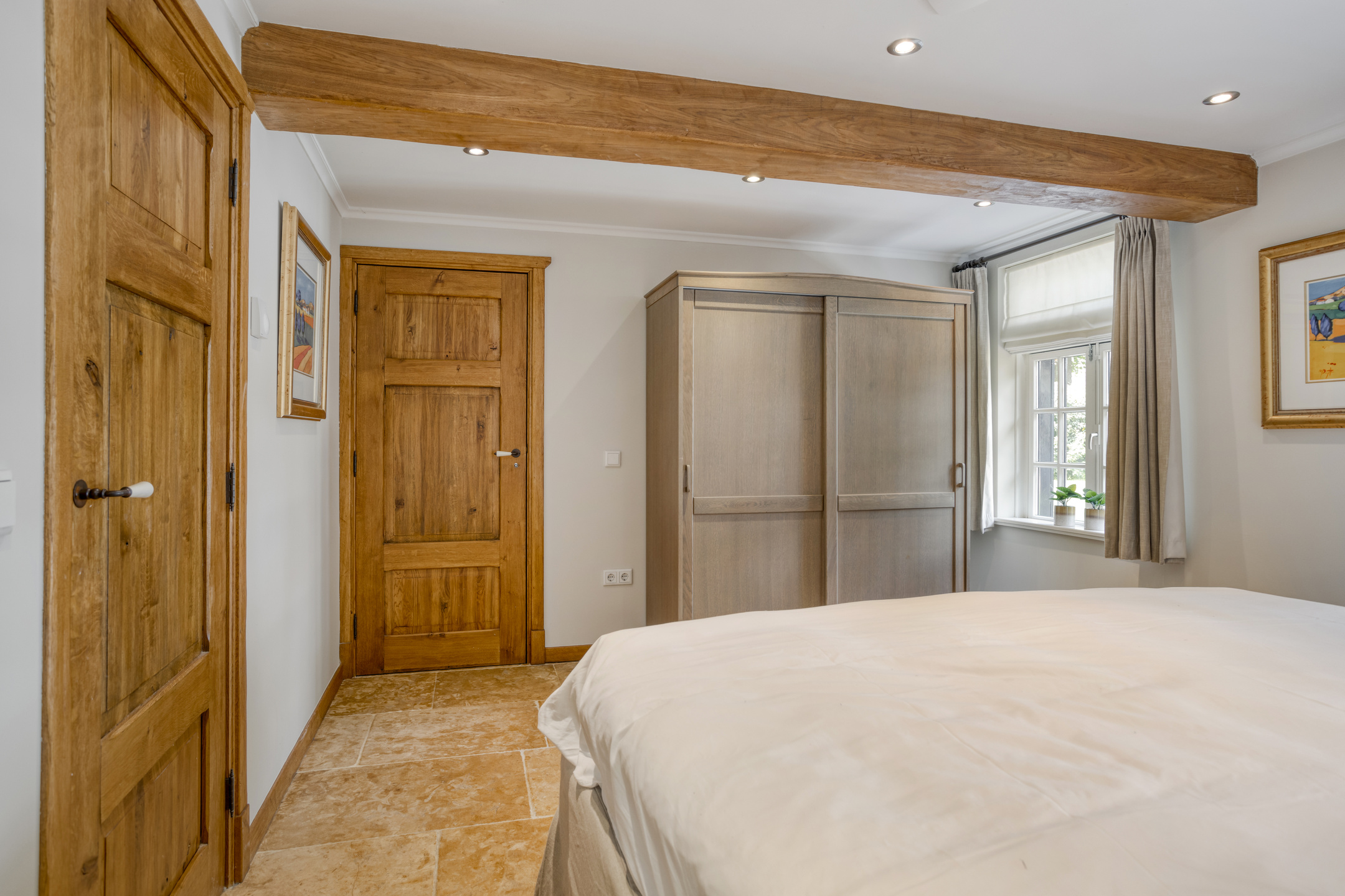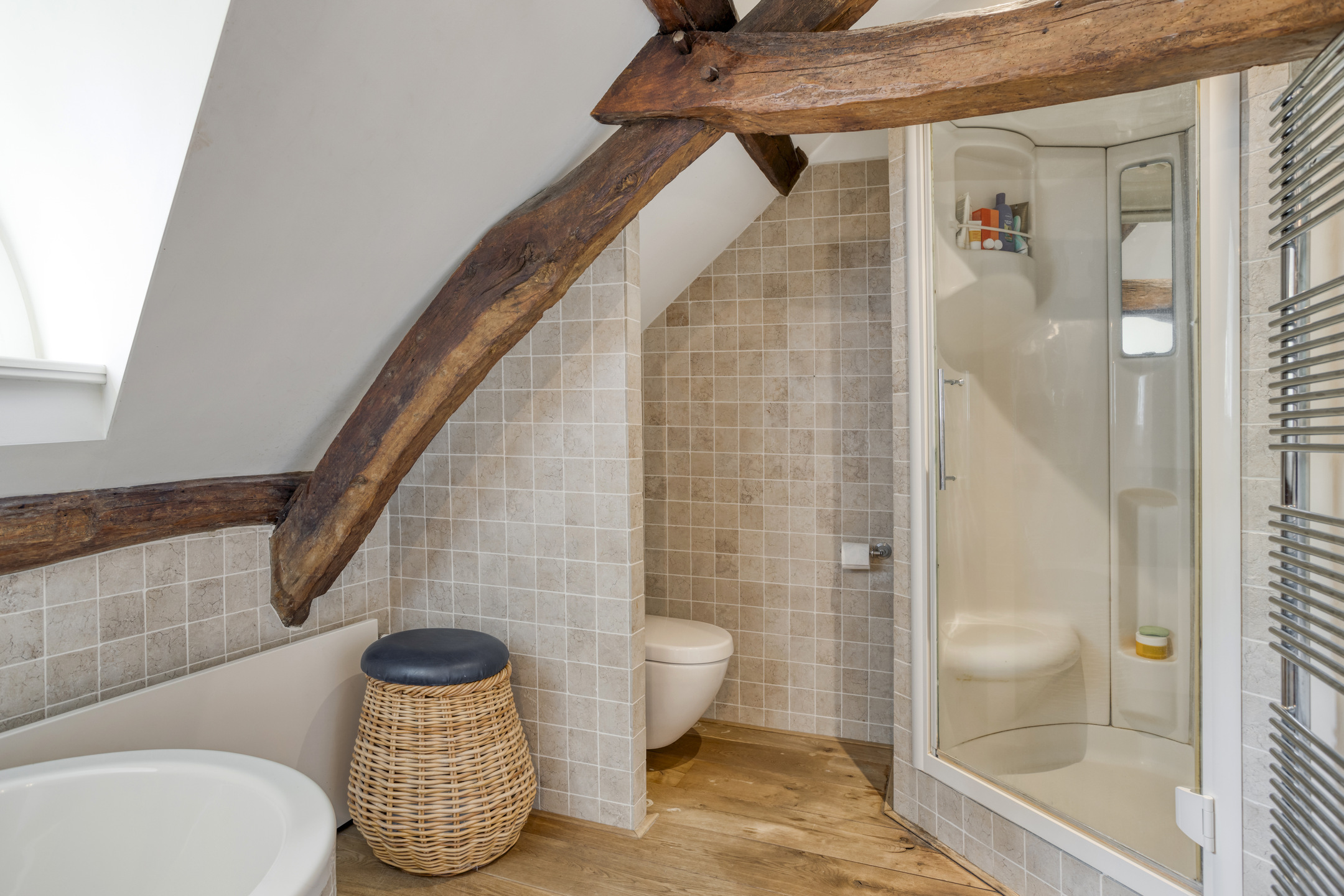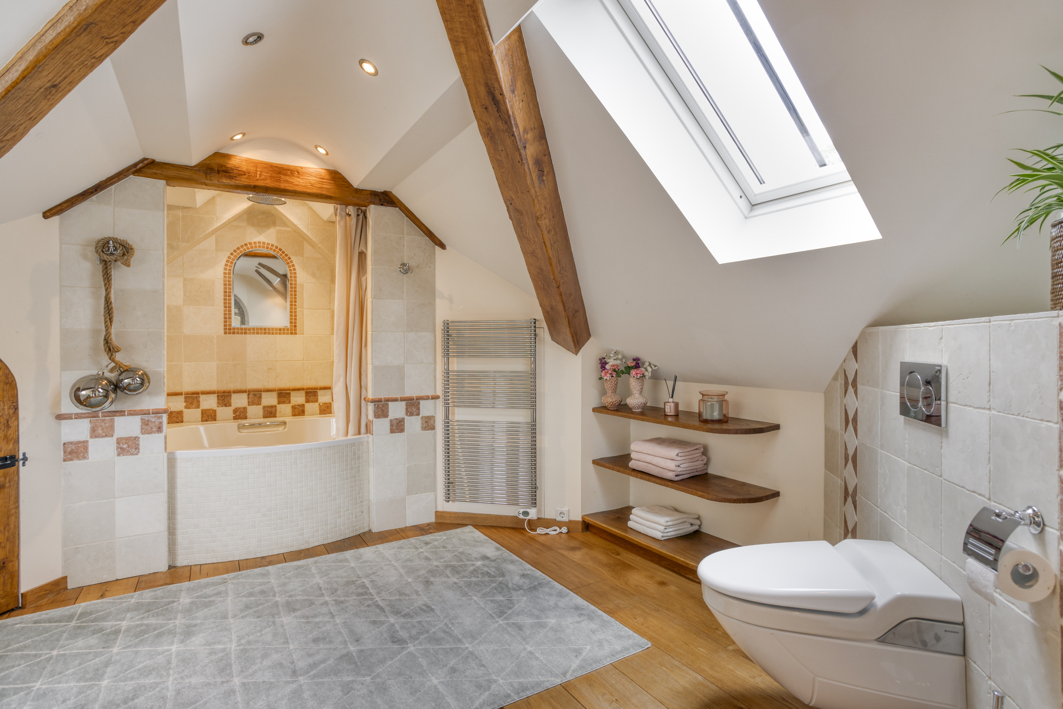 Spacious landing with wooden floor and skylight. Bathroom 2 and the hall to bedroom 2 are accessible from the landing. This hall has two large built-in cupboards. The spacious bedroom 2 has wooden flooring, a ceiling with characteristic beams and recessed spotlights, a skylight and a dormer window. French doors from this bedroom open onto a large balcony offering beautiful views of the park-like garden. The spacious bathroom 2 has wooden flooring, wall tiles, a ceiling with characteristic beams and recessed spotlights, a skylight and a dormer window. The bathroom also has a large bathroom cabinet with marble top and double sink, decorative radiator, wall-mounted toilet and bathtub with shower function. The room housing the central heating combi boiler is accessible from the bathroom.