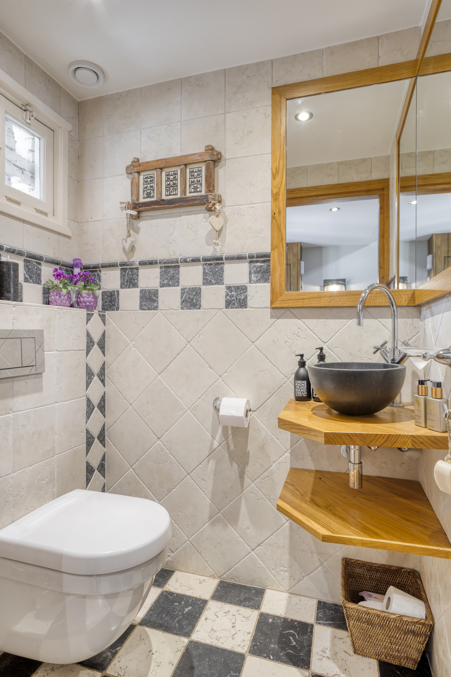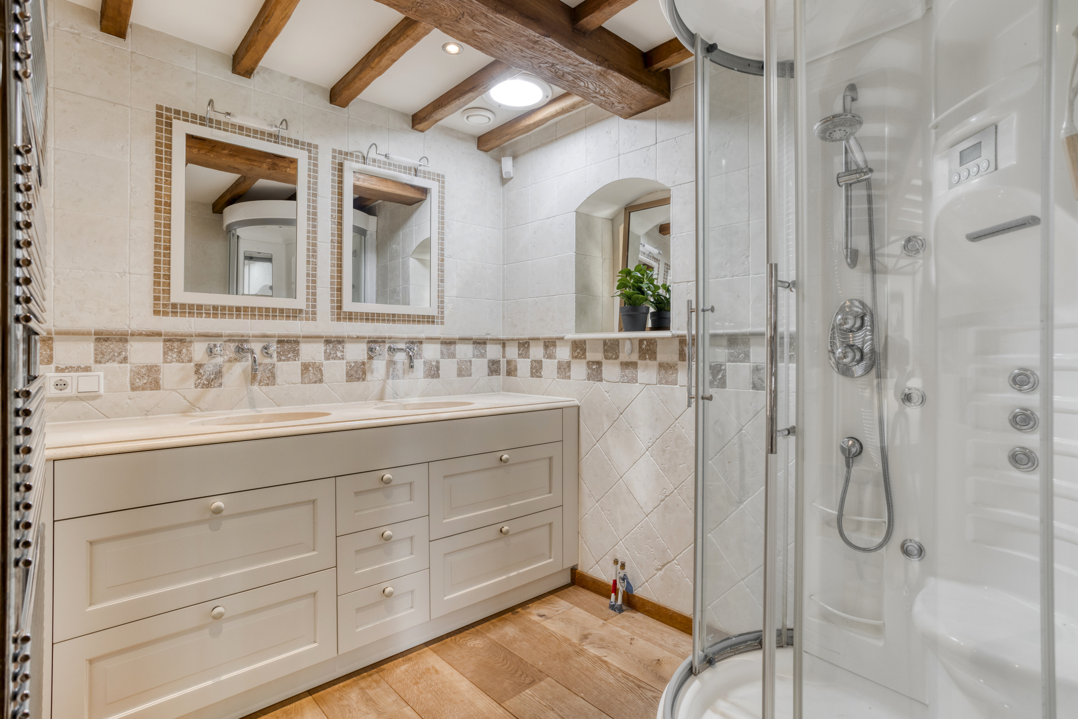 Spacious bathroom 1 with natural stone floor and wall tiles, beamed ceiling with recessed spotlights, shower cubicle and double washbasin in cabinet.