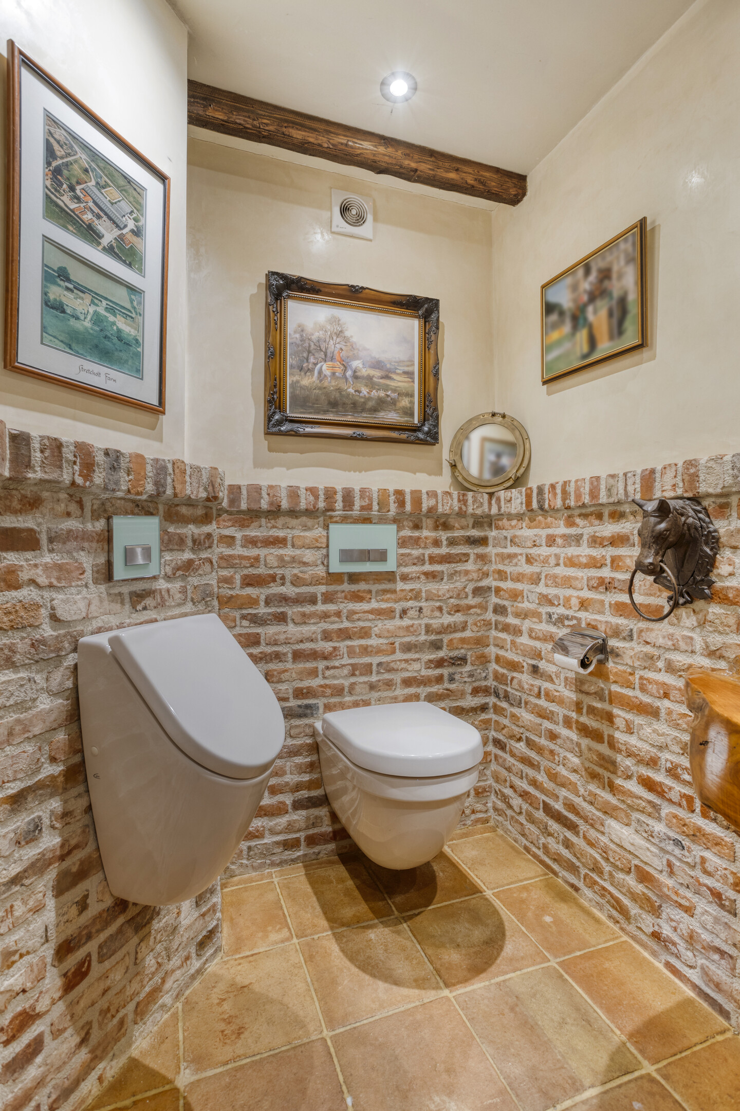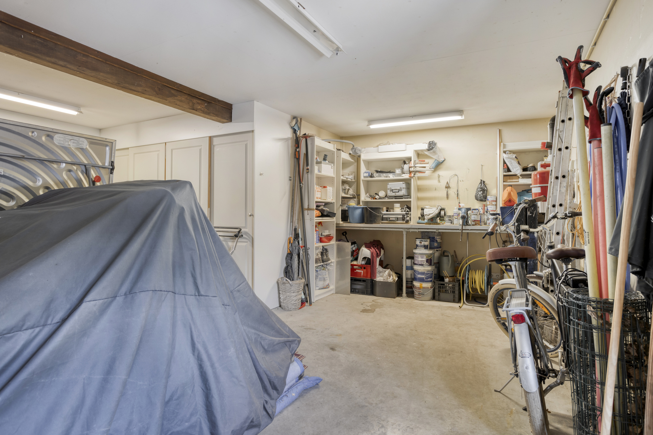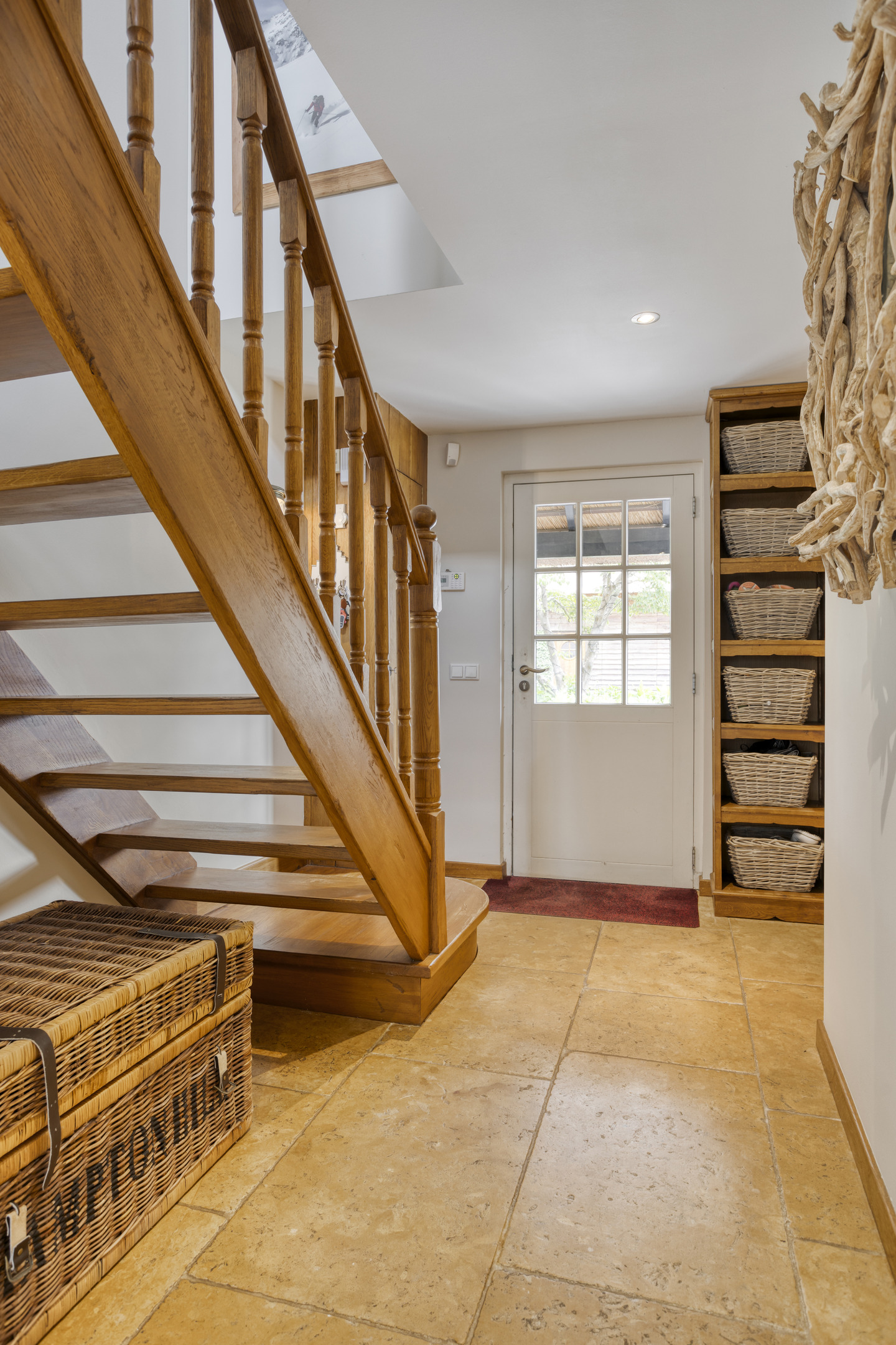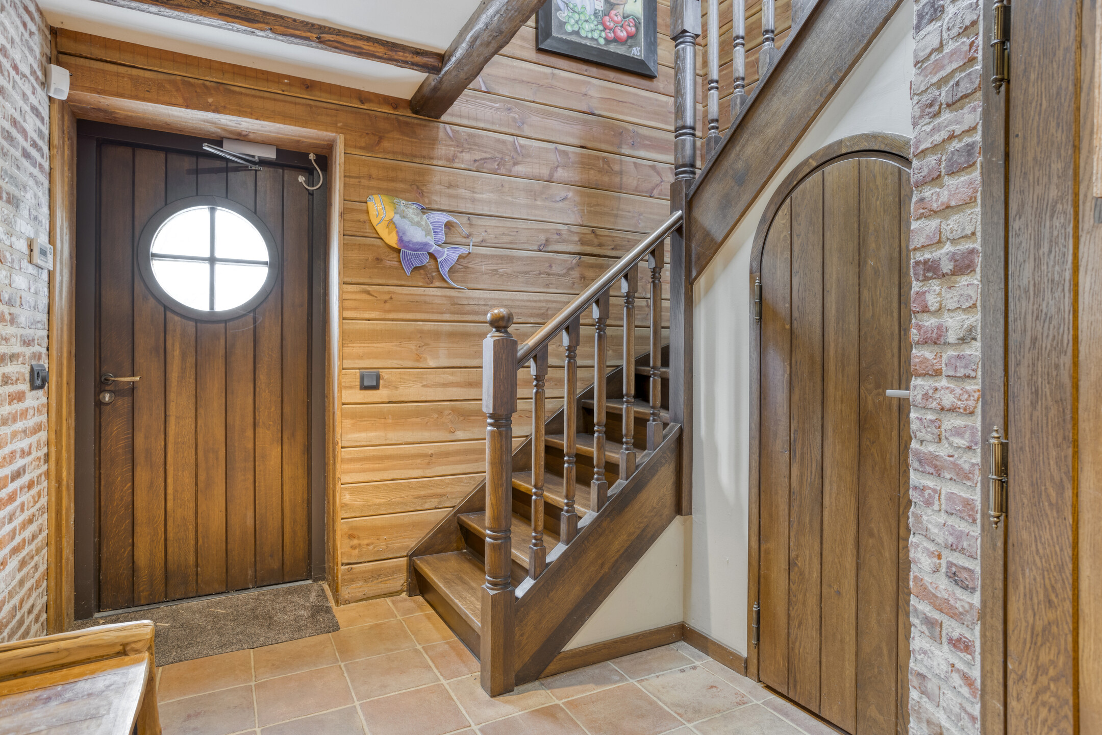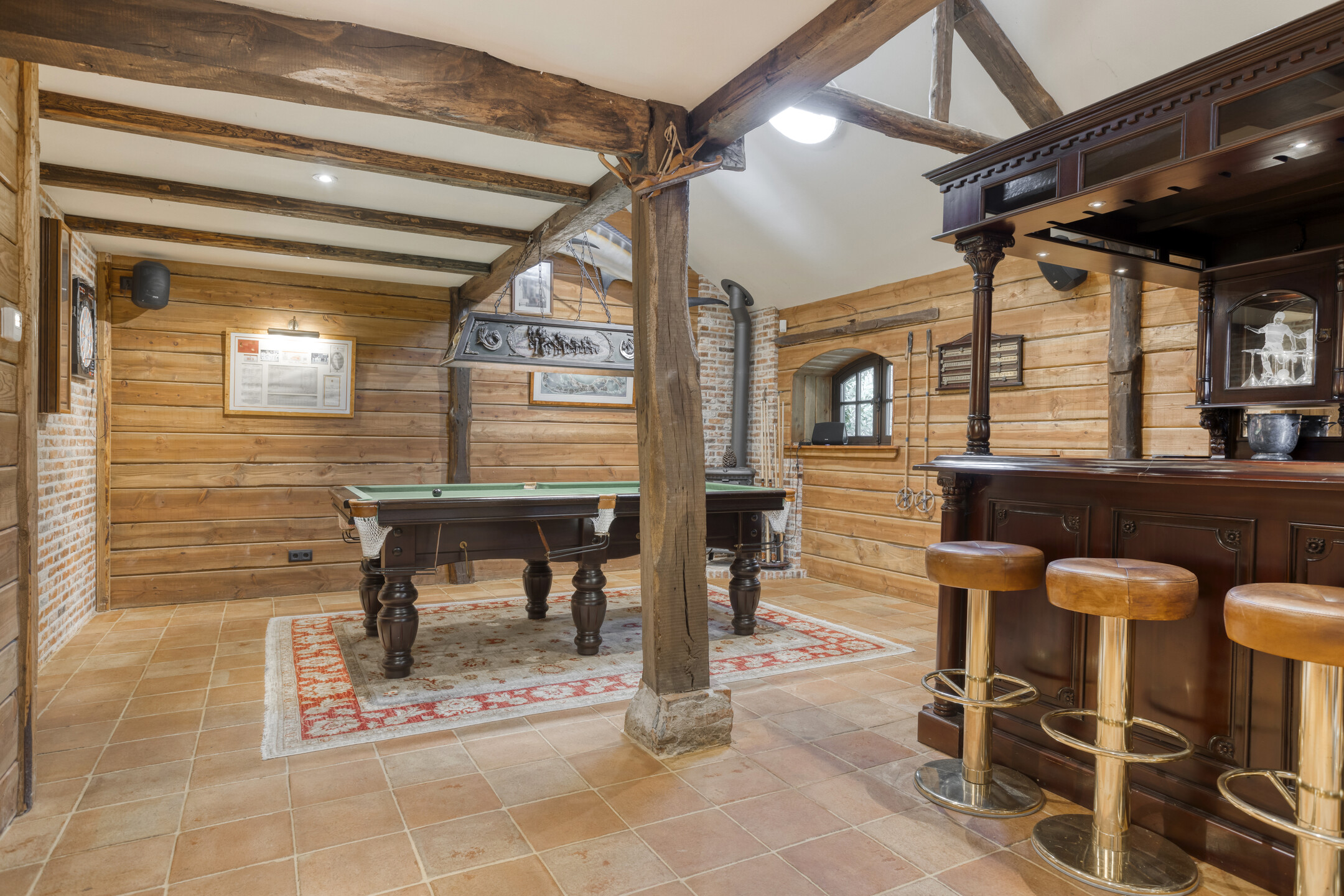 The former garage has been completely renovated and fitted with a thatched roof. Part of this “clapboard” annex is used as a storage room. It is accessible via a door near the carport. The ground floor also has a large relaxation room. The hall has natural stone floor tiles, a large cupboard containing the meter cupboard, the toilet and a beautiful hardwood staircase to the first floor. The relaxation room is also accessible from the hall. Toilet with natural stone floor tiles, free-hanging toilet, urinal and a designer cabinet with washbasin. Large, attractive relaxation room with natural stone floor tiles, beamed ceiling with recessed spotlights and a glass window looking through to the fitness room/gym above. This relaxation room has a large stylish bar with a drinks cabinet, a cosy sitting area and a built-in sound system. This space is currently partly used as a “billiard room”. The access door to the storage room is located near the carport. The storage room offers plenty of space and is equipped with a built-in cupboard wall. The storage room also houses the underfloor heating system and the connections for the central heating and irrigation systems.