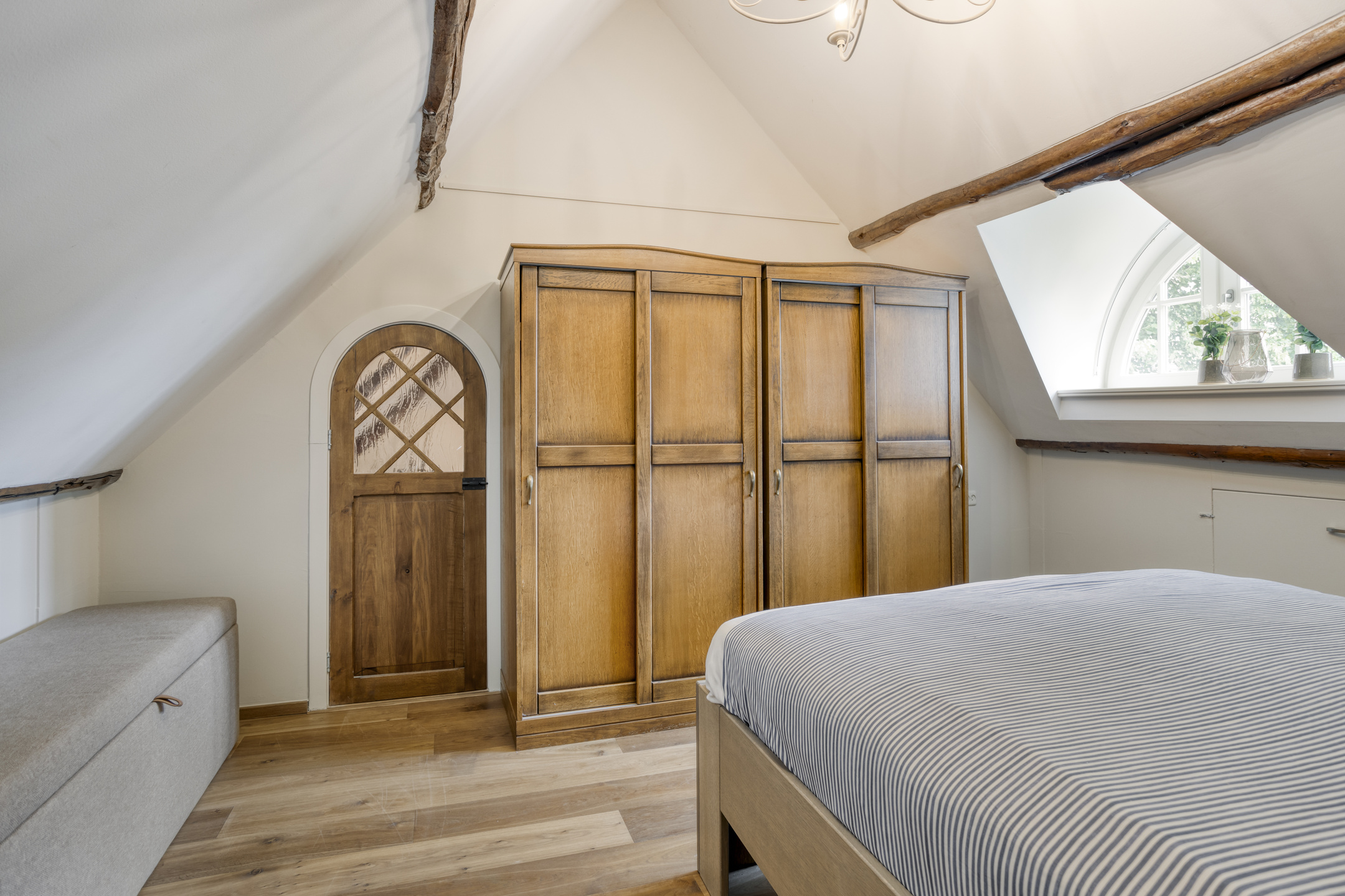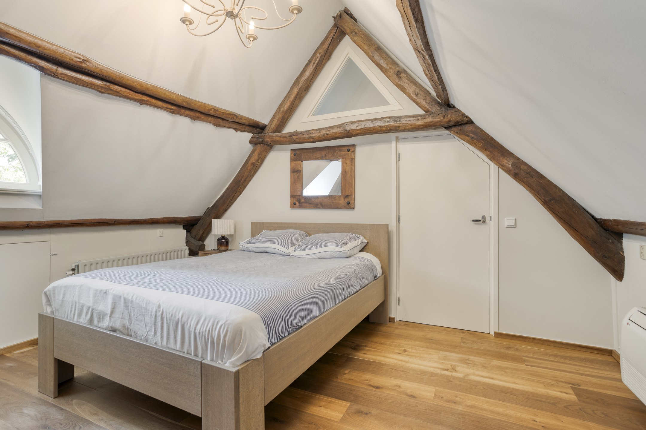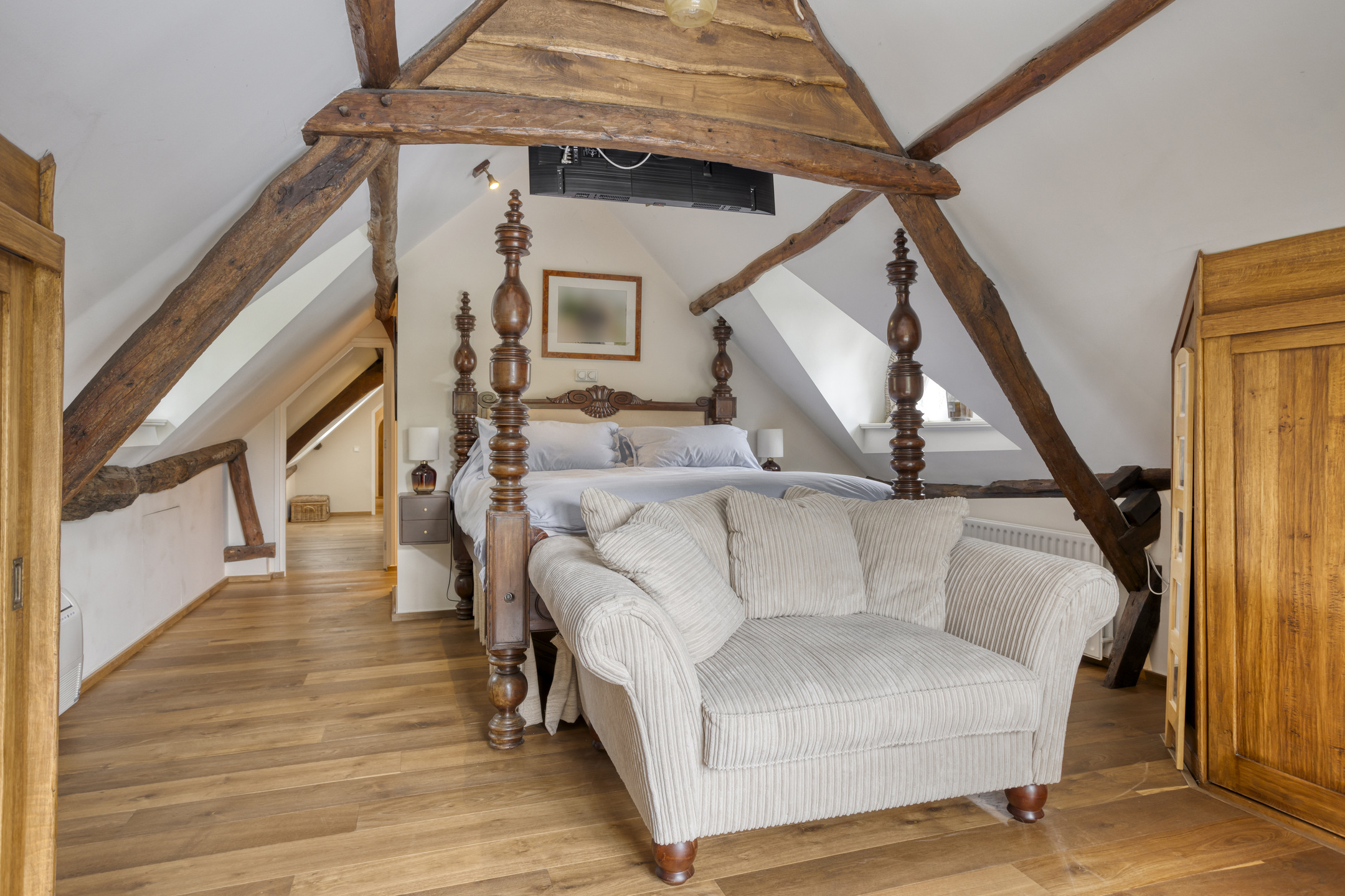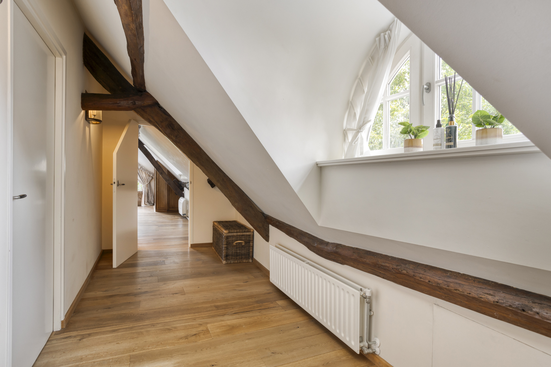 Spacious landing with wooden flooring and dormer window. Both bedrooms and the bathroom are accessible from the landing. The spacious bedroom 3 has wooden flooring, a ceiling with a characteristic beam construction, a dormer window and access to the loft. The large loft offers a beautiful view of the stylish living room.