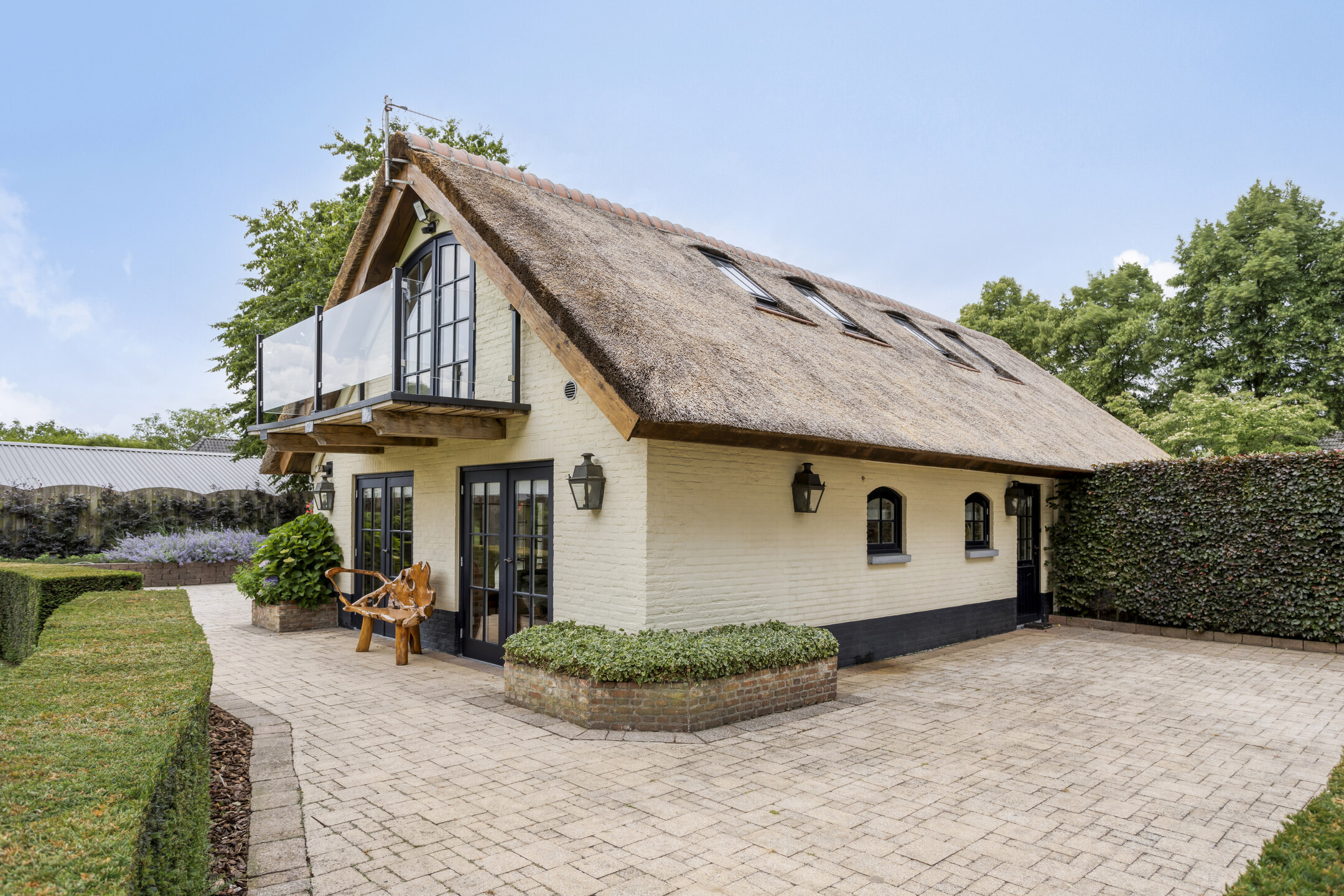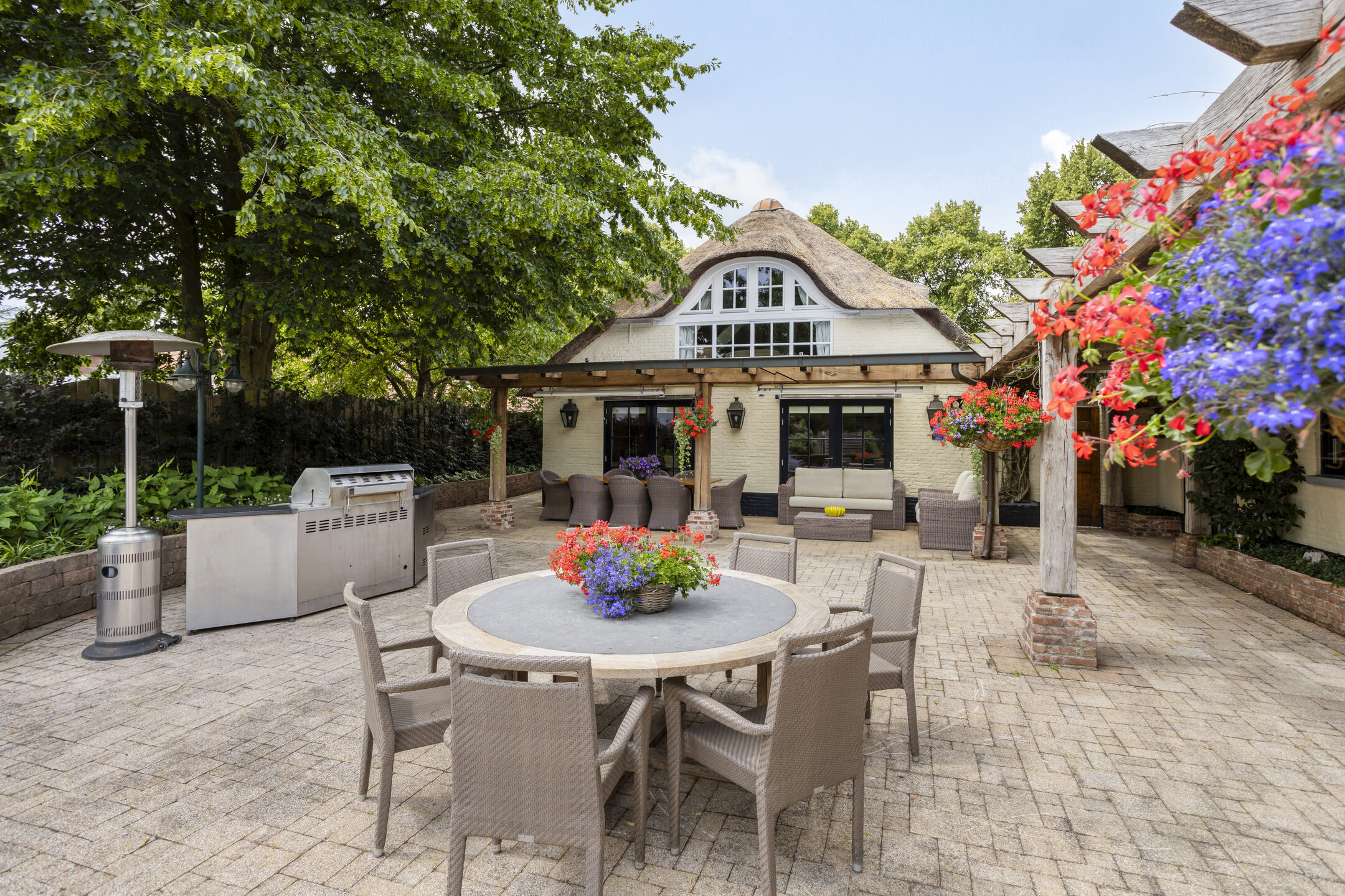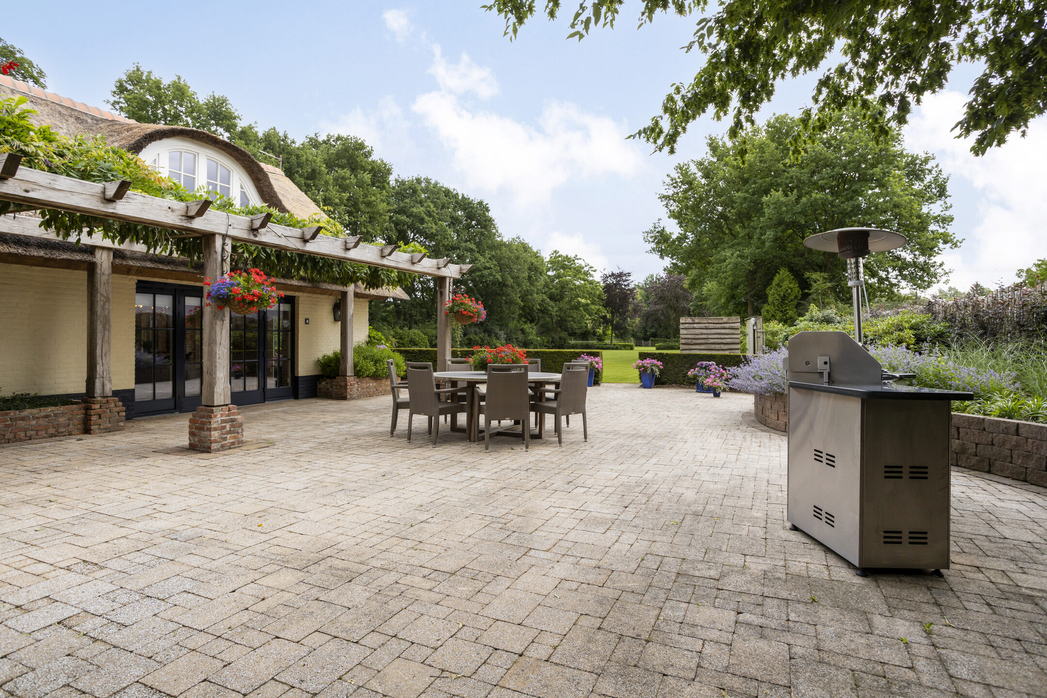 The beautifully landscaped, very spacious garden faces east and has several large sun terraces. The terraces are situated in such a way that both the farmhouse and the guest house can count on sufficient privacy and offer a beautiful view of the park-like back garden. The terrace adjacent to the farmhouse has a large glass canopy and a beautiful pergola.