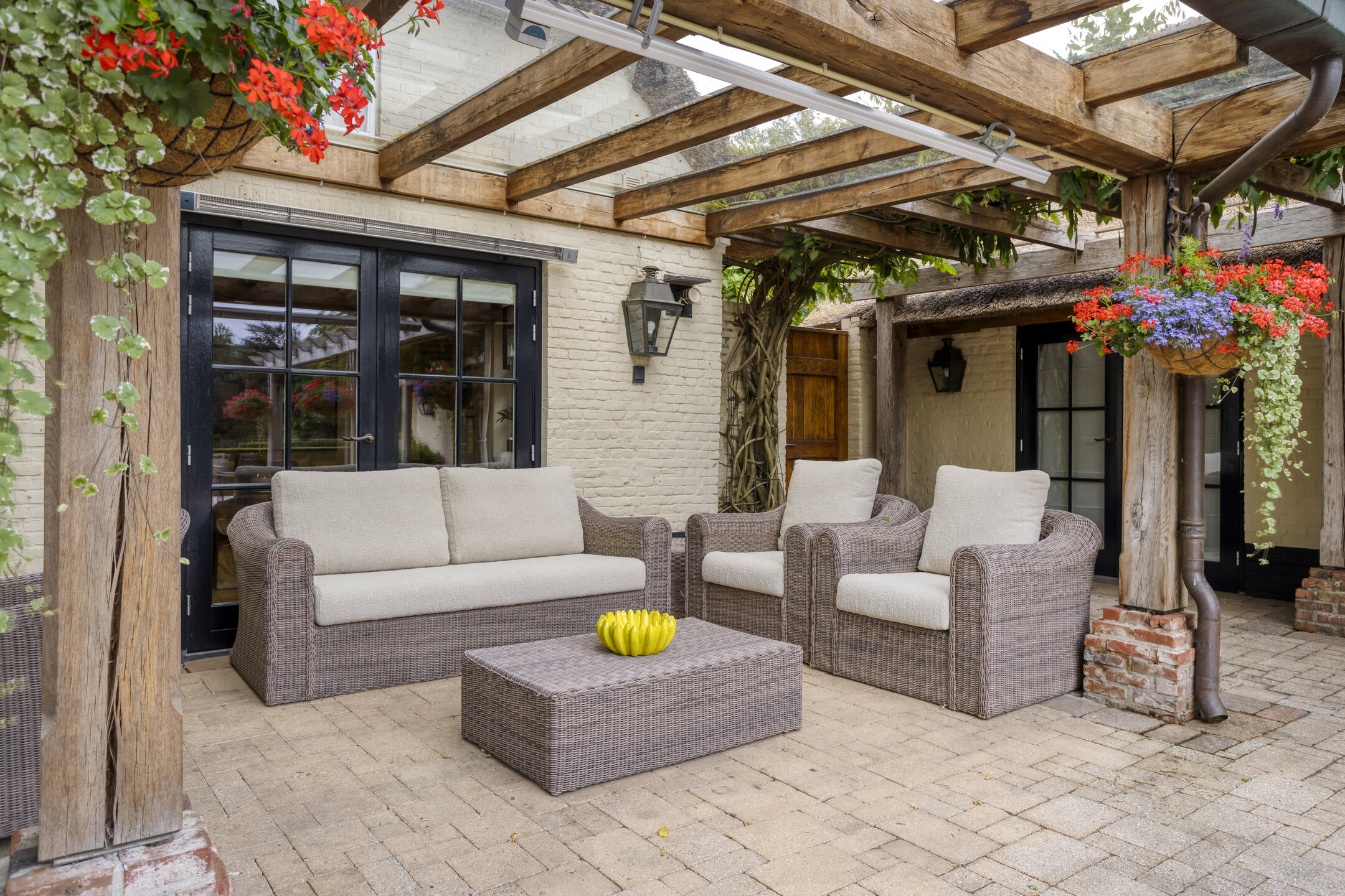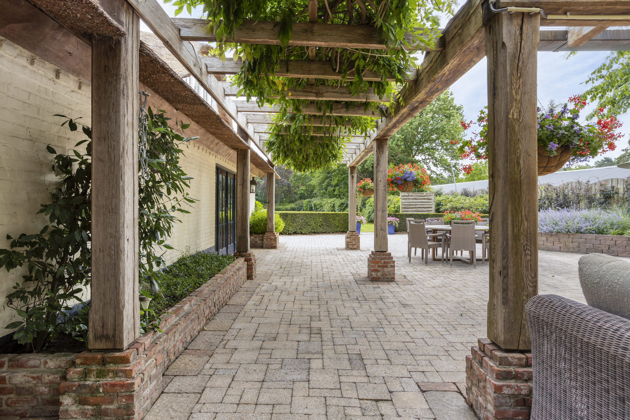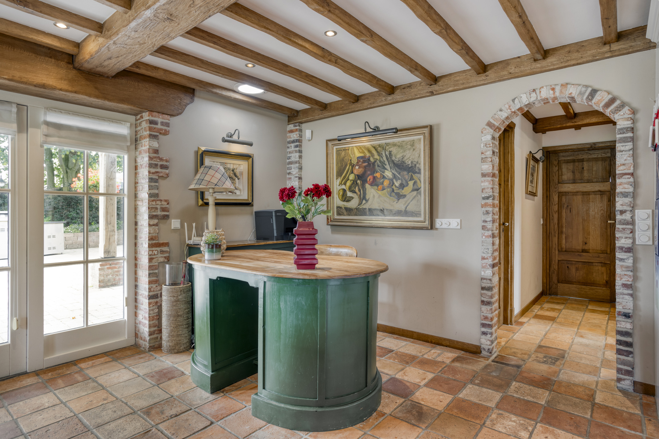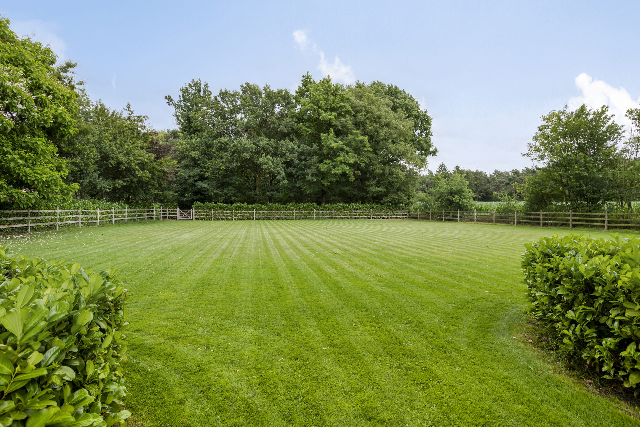 The beautifully landscaped, very spacious garden faces east and has several large sun terraces. The terraces are situated in such a way that both the farmhouse and the guest house can count on sufficient privacy and offer a beautiful view of the park-like back garden. The terrace adjacent to the farmhouse has a large glass canopy and a beautiful pergola.