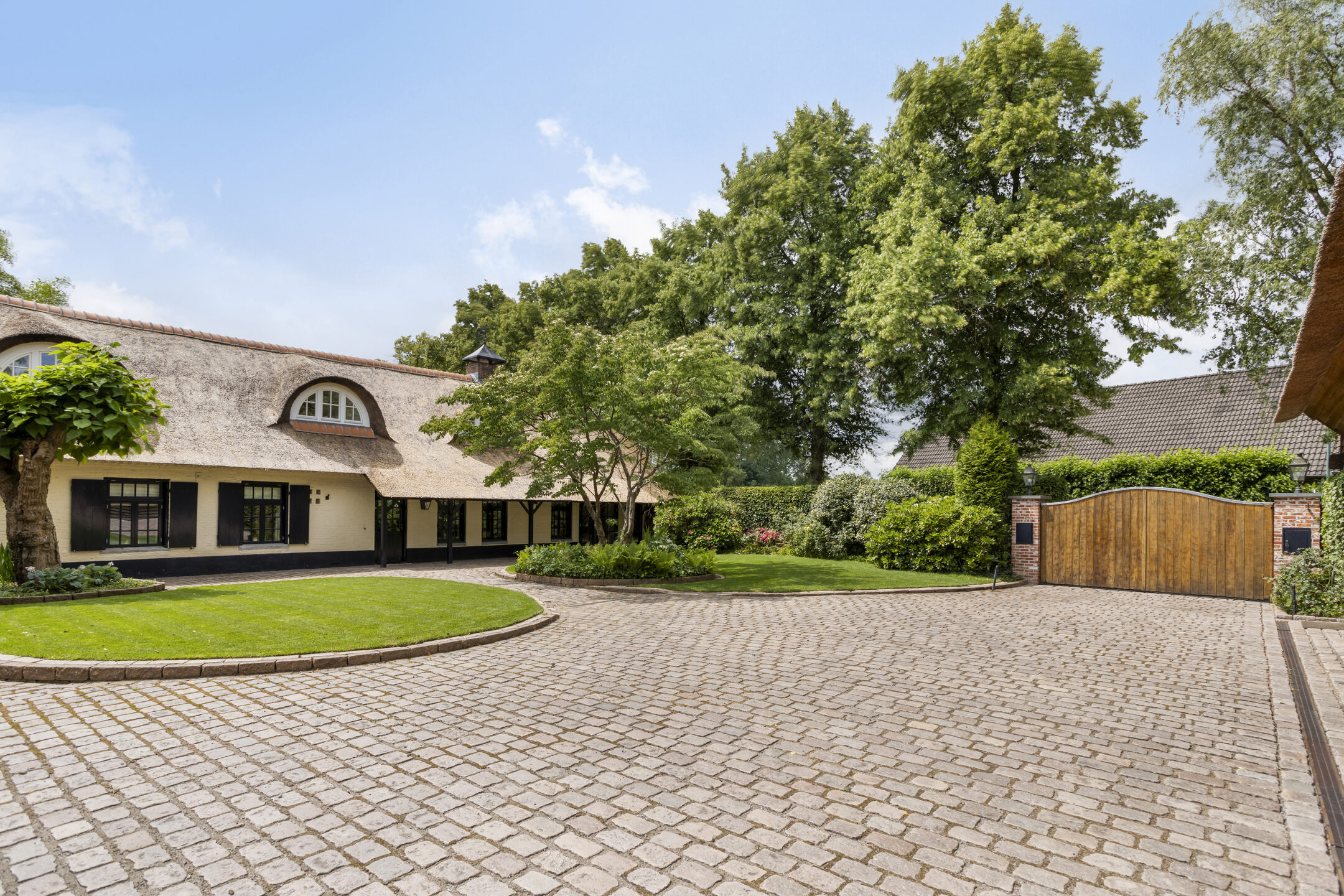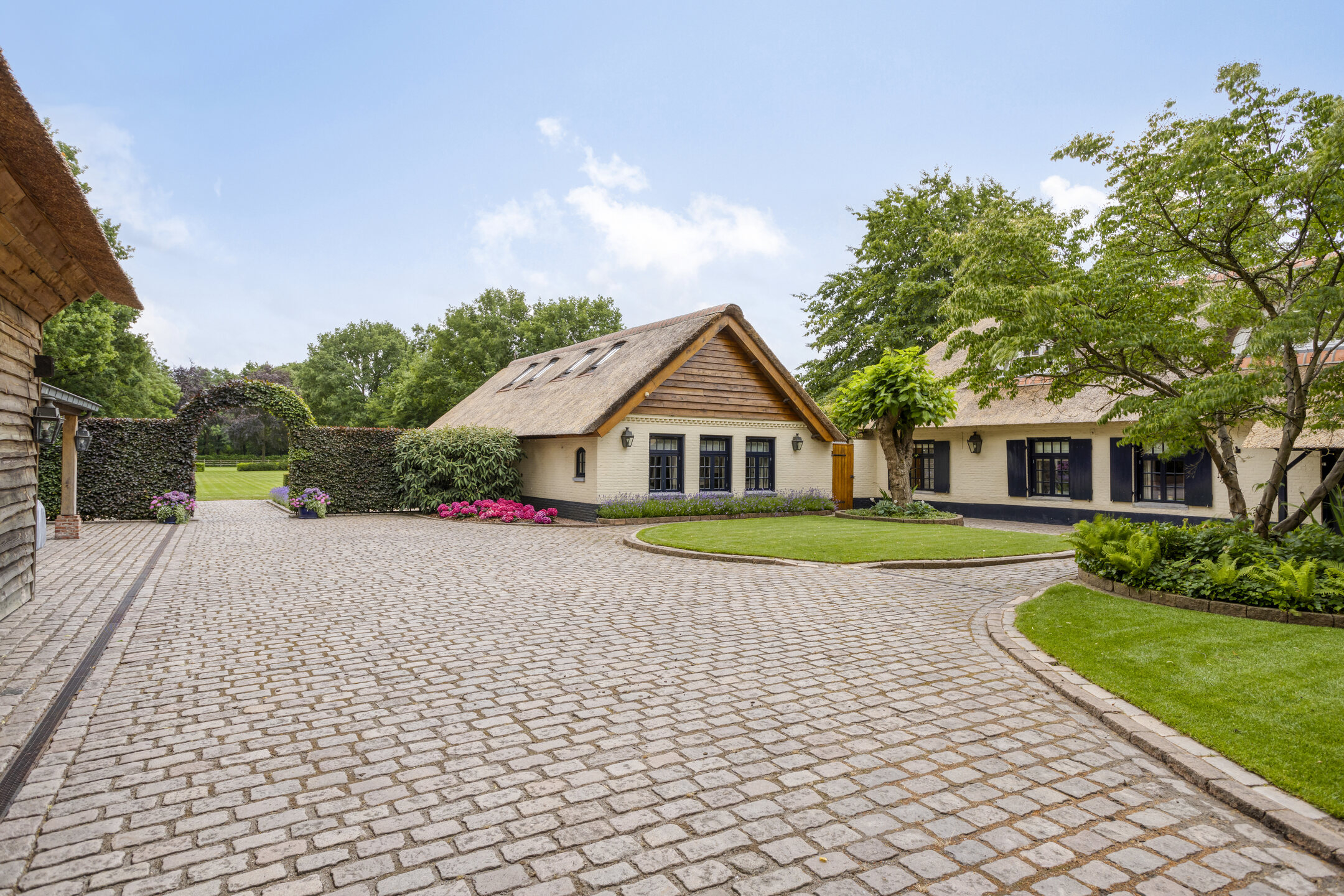 The farmhouse, guest house and outbuilding are located on a courtyard on a very spacious plot of approximately 6,755 m². The courtyard is accessible via a large electric gate with French doors and via a gate on the side of the farmhouse. The spacious courtyard has decorative paving, a large lawn and various mature plants. All buildings are equipped with outdoor lighting.
