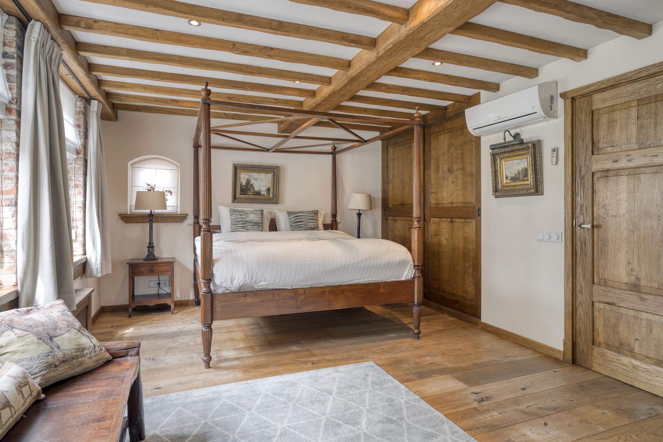 The very spacious bedroom 4 has wooden flooring, a ceiling with a very special beam construction, two dormer windows and a large walk-in closet. A large characteristic window offers a beautiful view of the park-like garden. Bathroom 2 has marble floor and wall tiles, a dormer window, decorative radiator, wall-mounted toilet, bathtub, shower and double washbasin in a vanity unit.