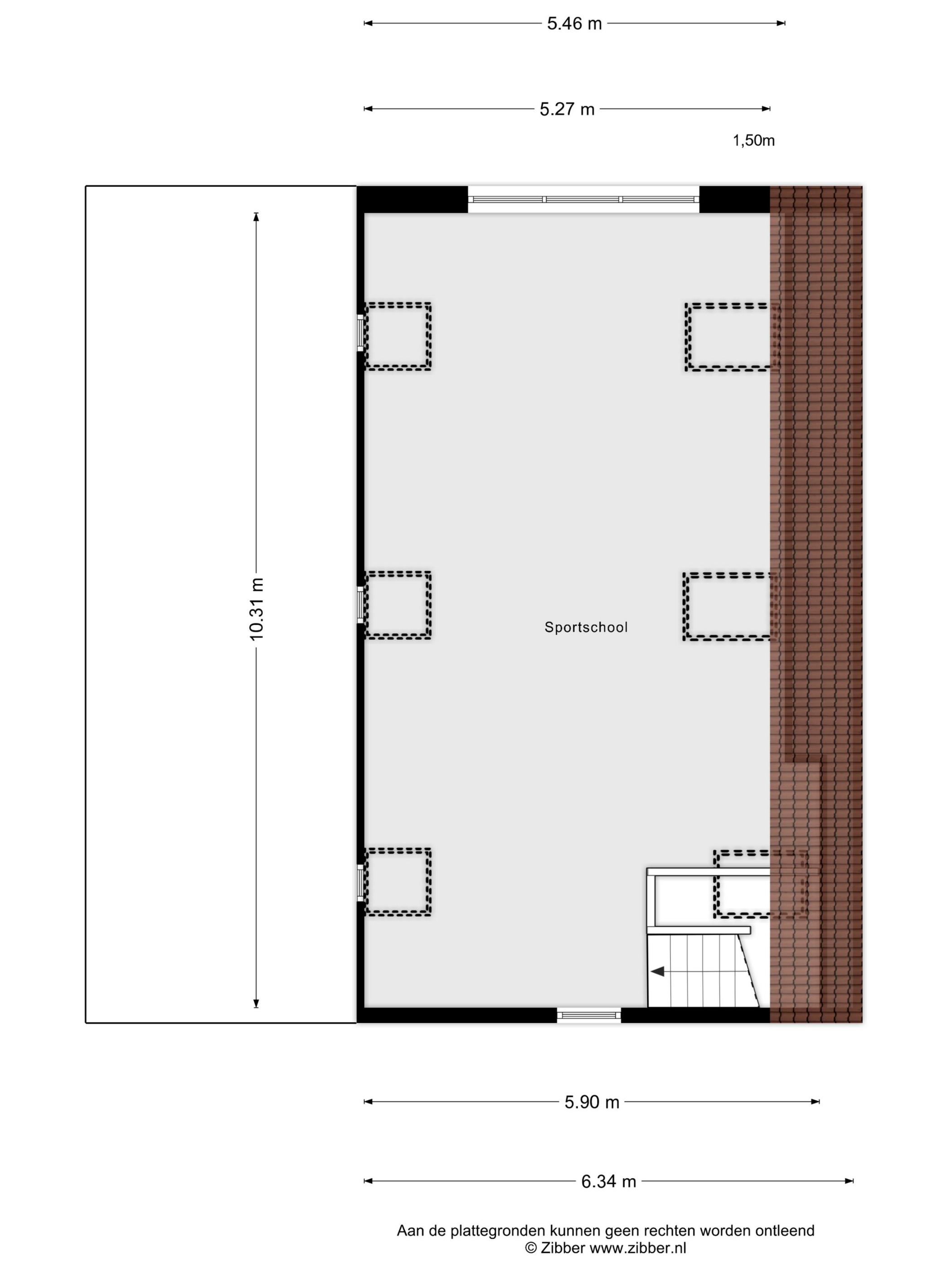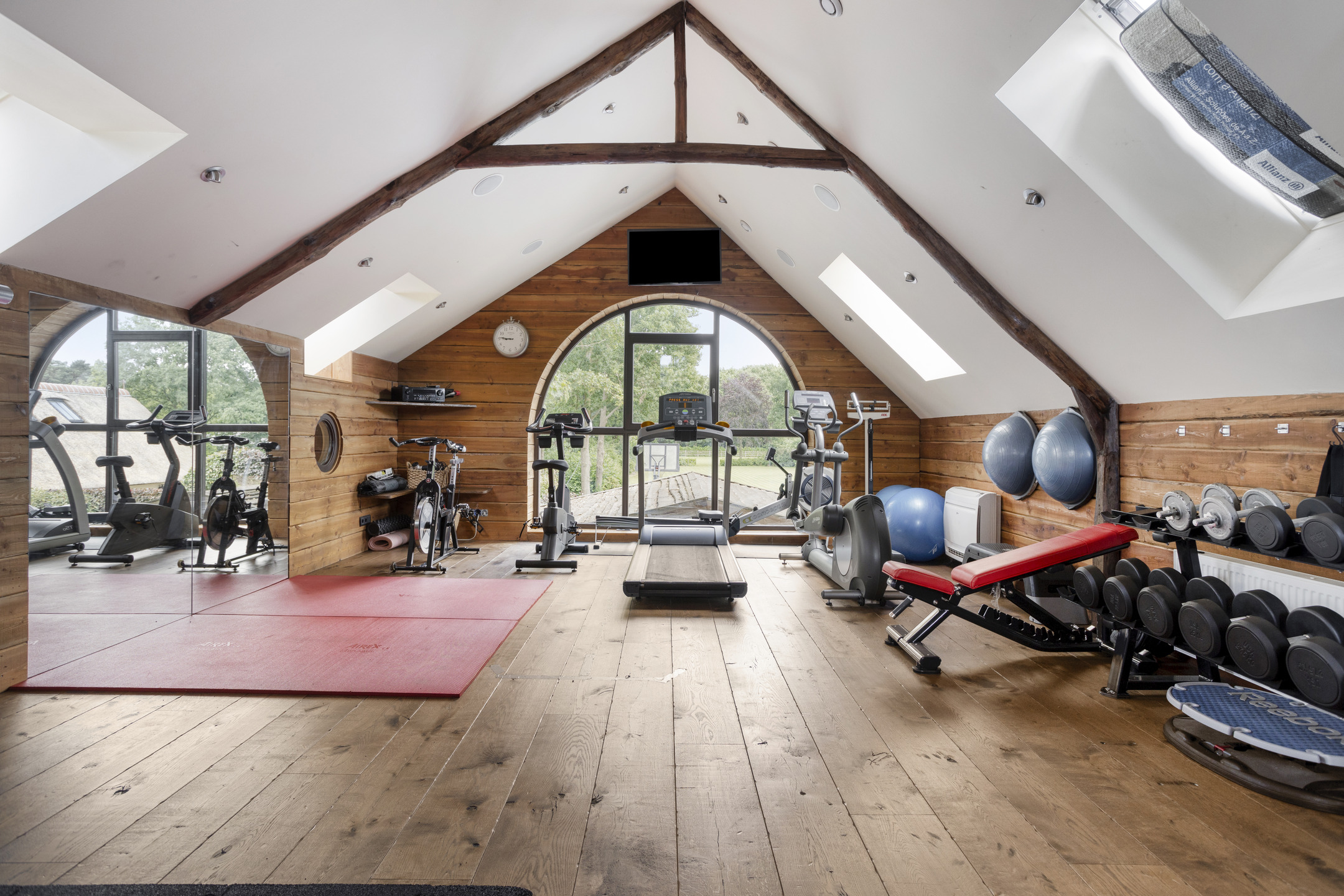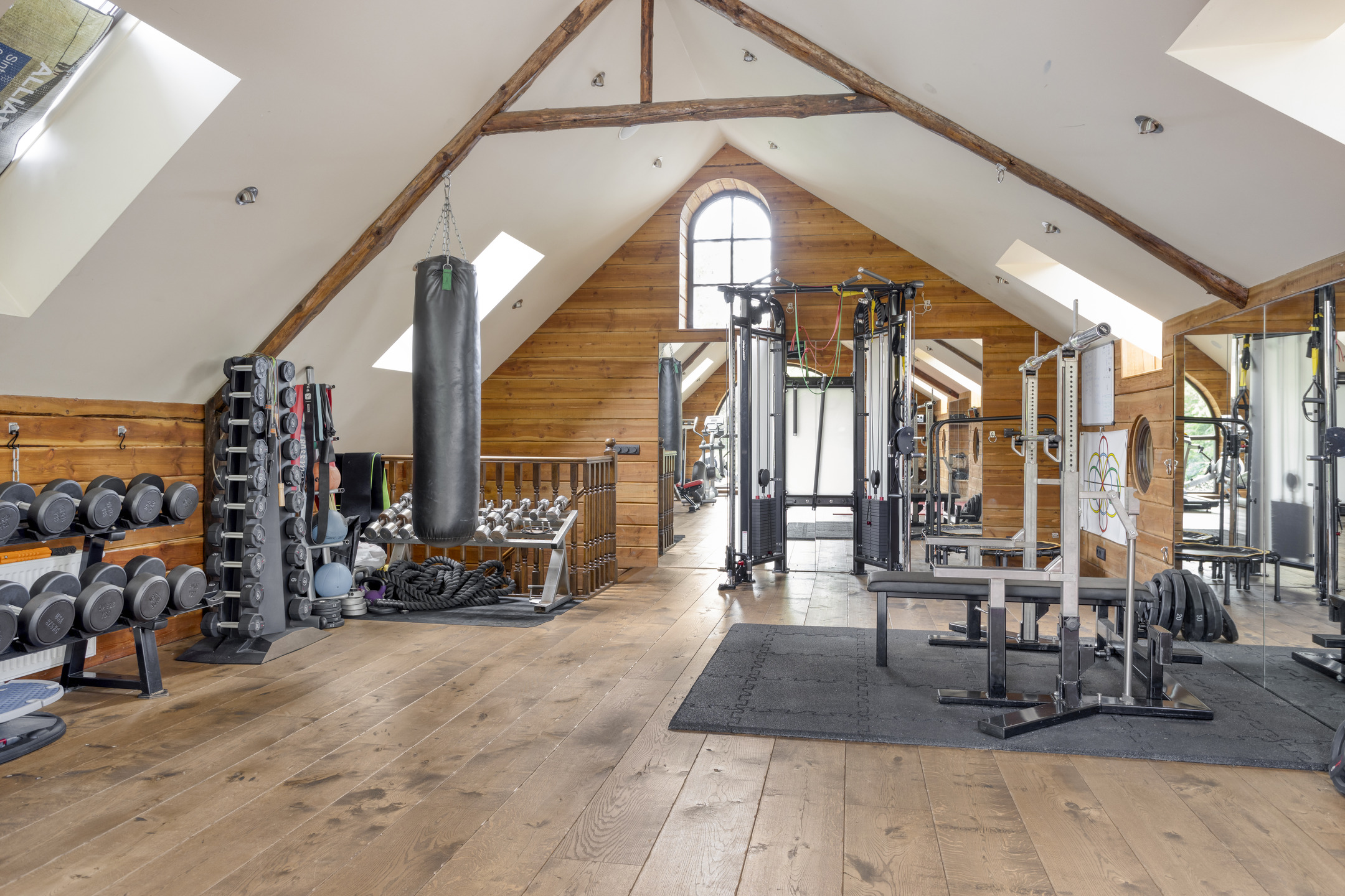 Large, attractive space covering the entire first floor with wooden flooring, beamed ceiling with recessed spotlights, various skylights, large windows, mirrored walls and a glass window looking through to the relaxation room on the ground floor. This very spacious room is currently used as a gym/fitness room.