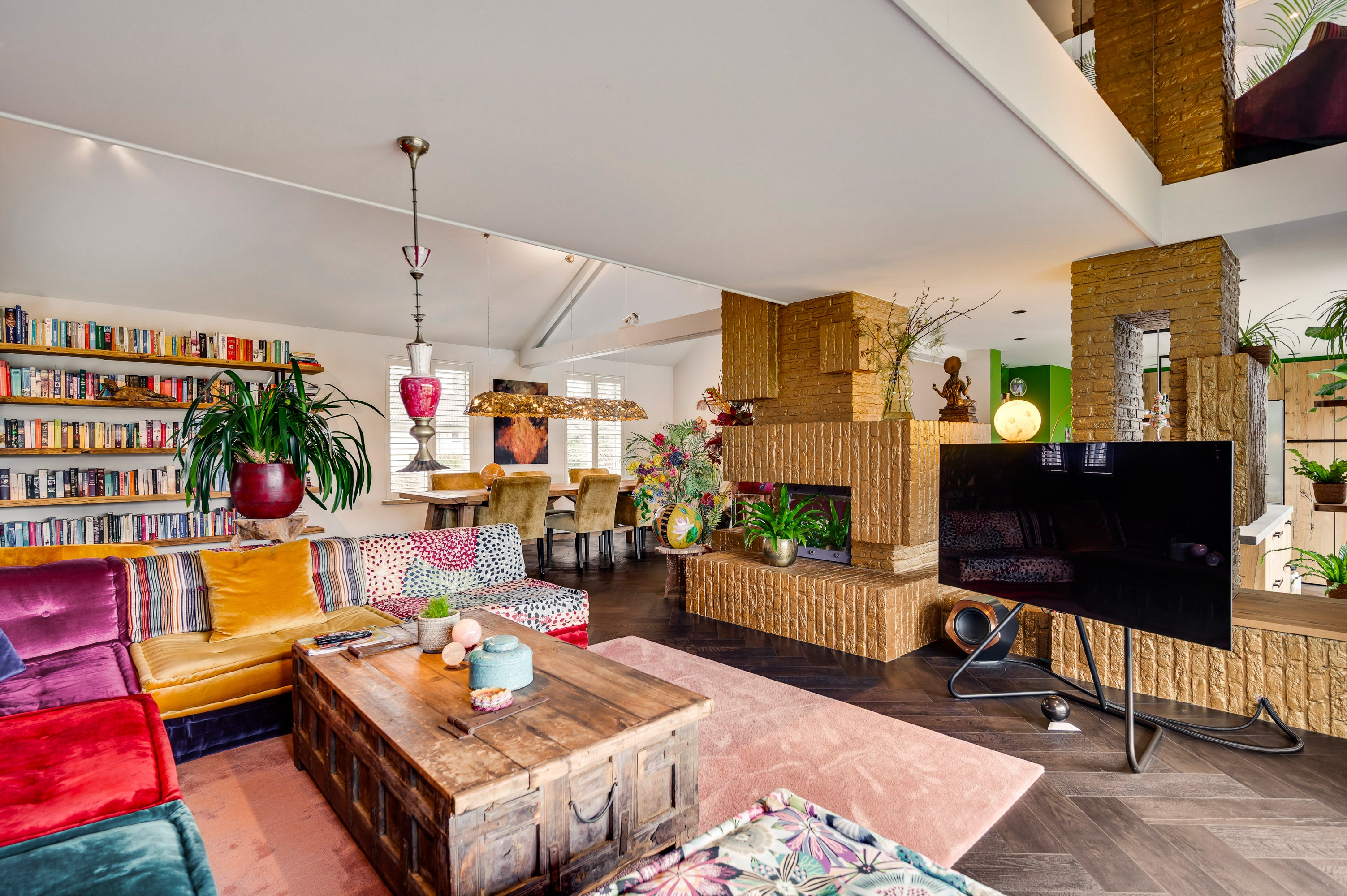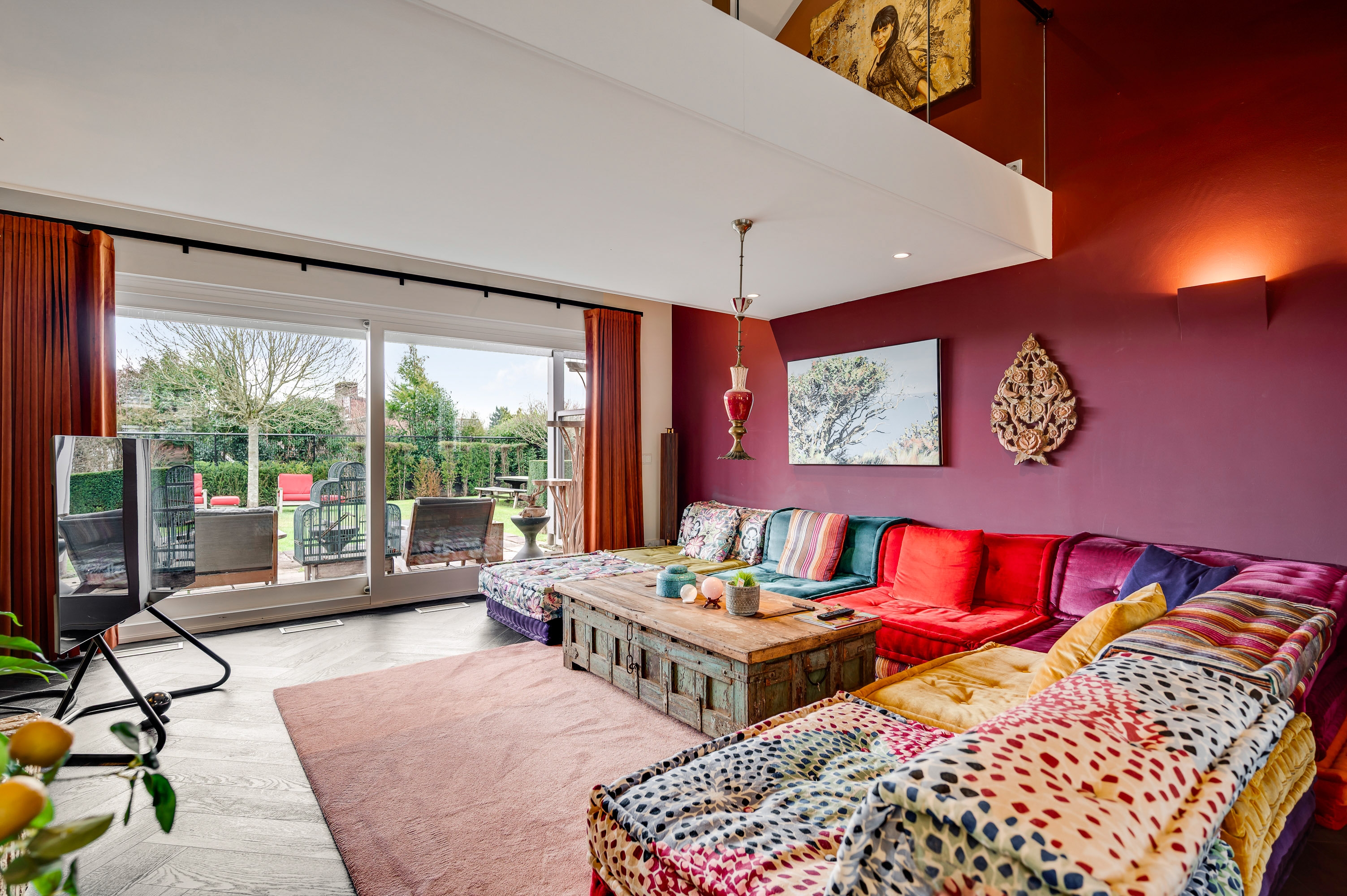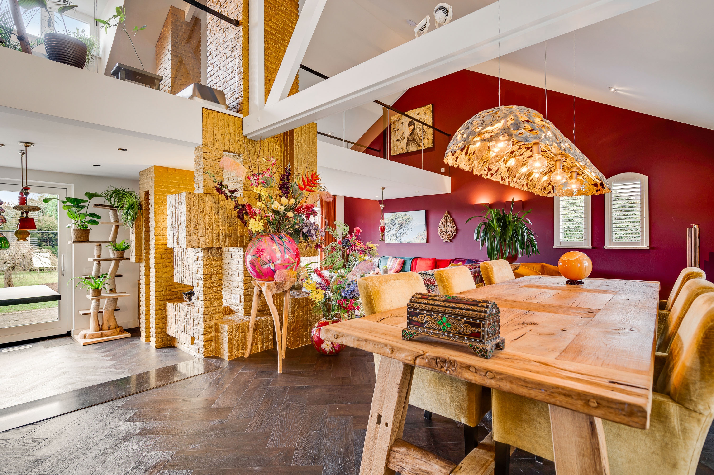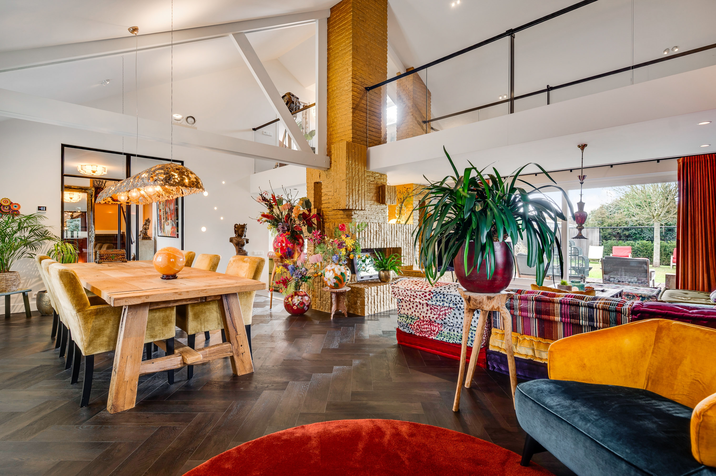 Upon entering, you are welcomed into a bright and stylish entrance hall featuring a wardrobe area and a modern guest toilet. The living room forms the heart of the home and is characterized by its playful layout with a mezzanine, a beautiful walkway, and an inviting fireplace feature. Large windows and a sliding door provide an abundance of natural light and a direct connection to the garden. The architectural room divider adds both character and functionality to the space.