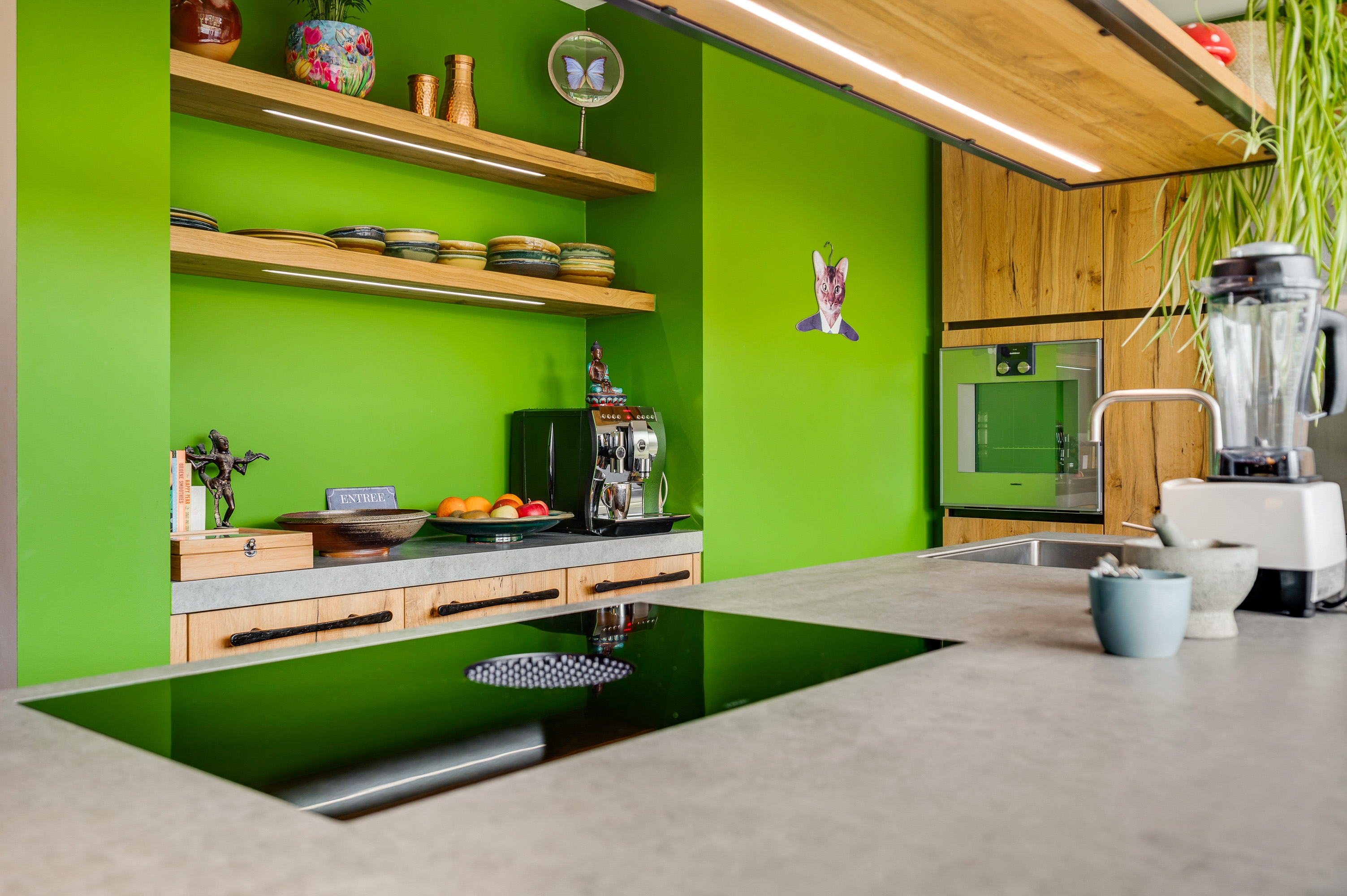 The spacious kitchen-diner is a true eye-catcher and fully equipped with all modern conveniences. The cooking island and sleek wall of built-in appliances not only provide comfort but also create a contemporary look. Thanks to the large sliding doors, the garden is easily accessible, allowing indoor and outdoor living to blend seamlessly.