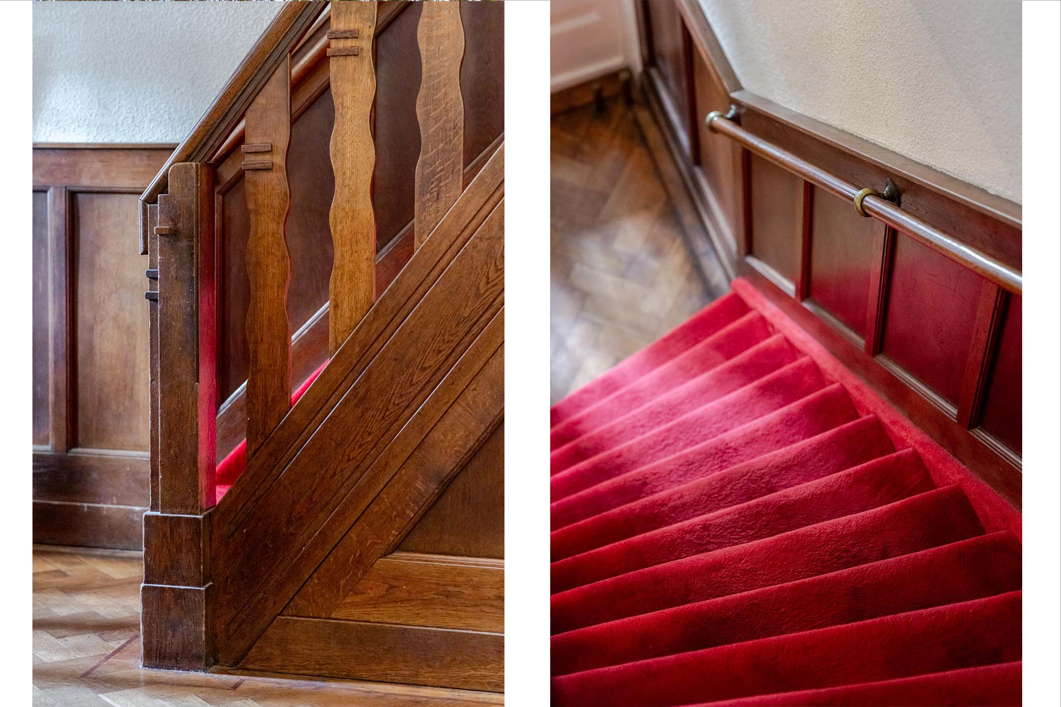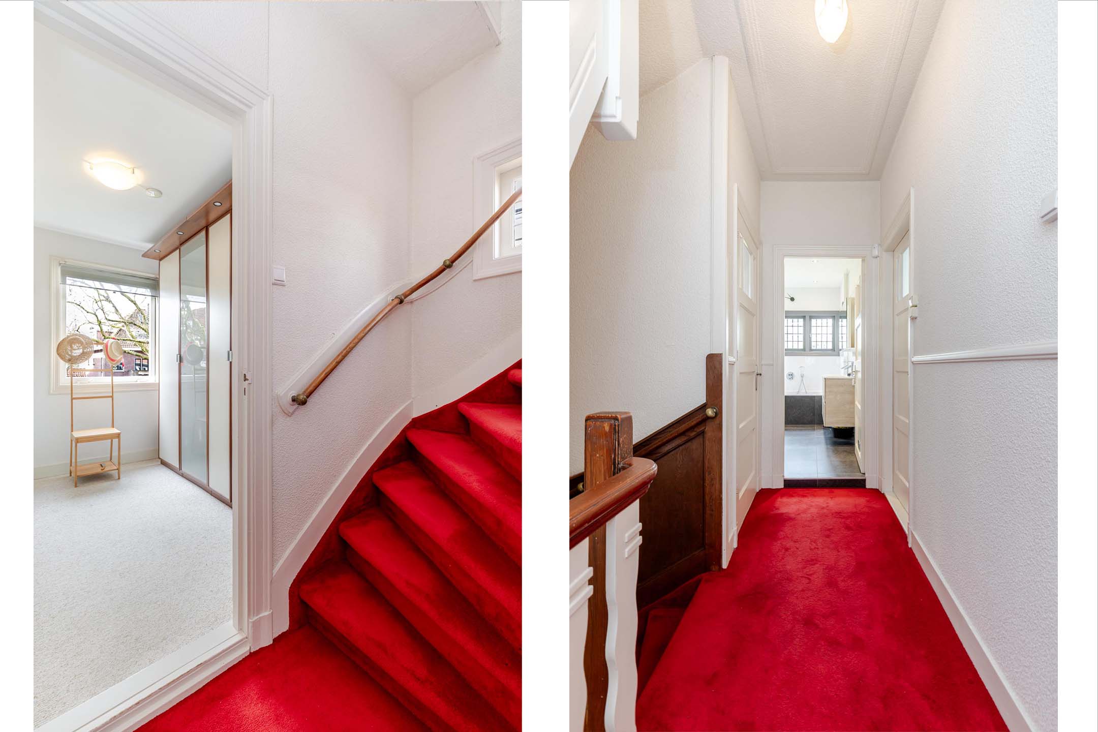 Landing with toilet, spacious master bedroom at the rear featuring French doors to the balcony; this room offers excellent potential for installing a built-in wardrobe, spacious bedroom at the front also featuring French doors to the balcony. This balcony offers beautiful views over the leafy Berglustlaan. At the front, there is another smaller bedroom currently used as a dressing room. At the rear is the bathroom equipped with a bathtub, walk-in shower, and vanity unit with double sink. Second floor:
