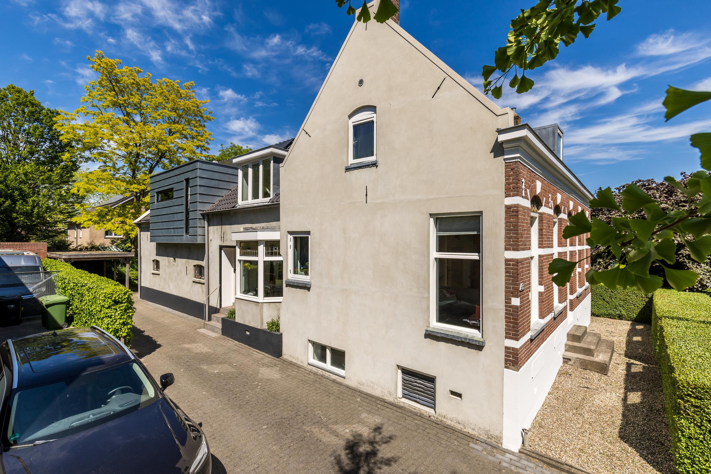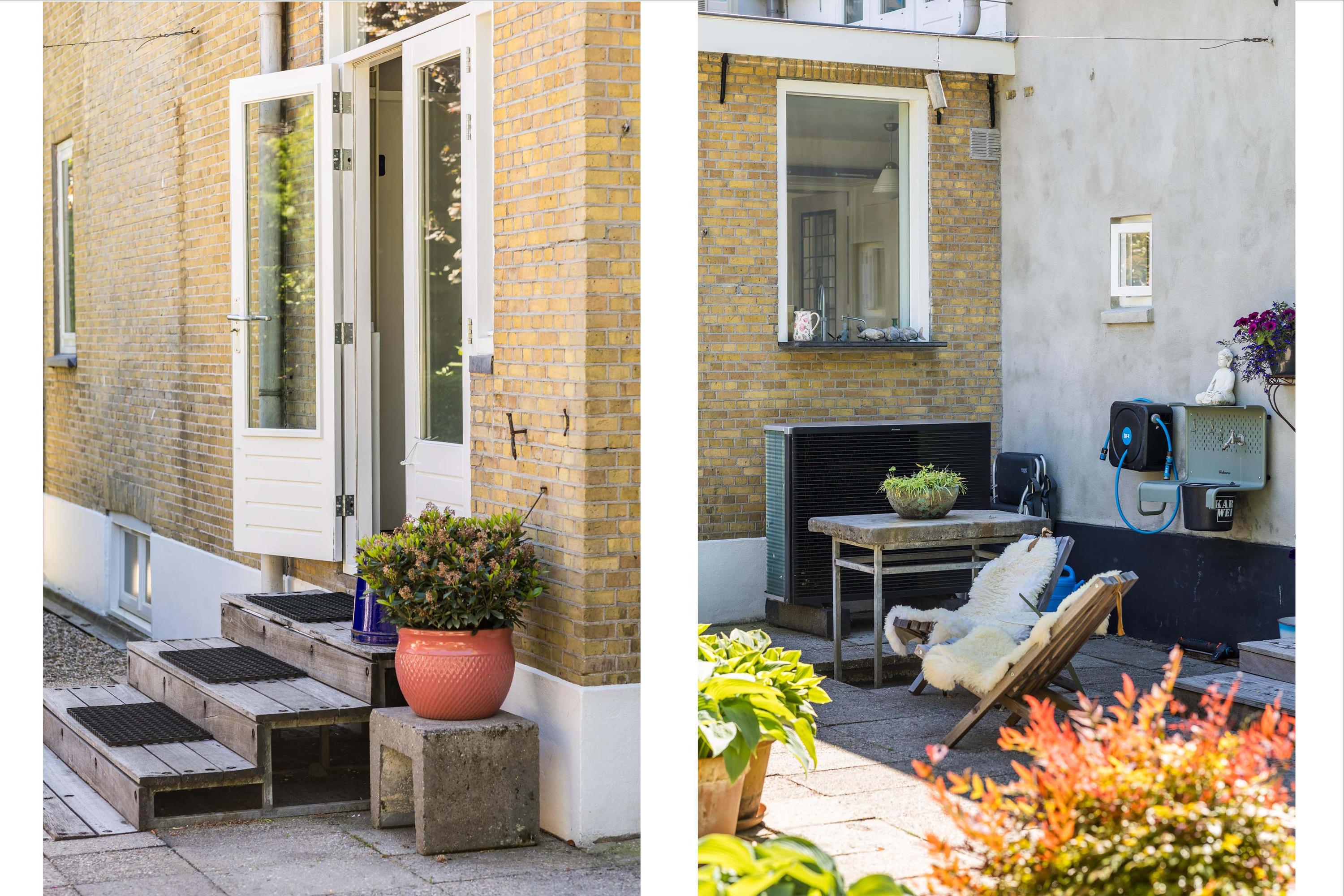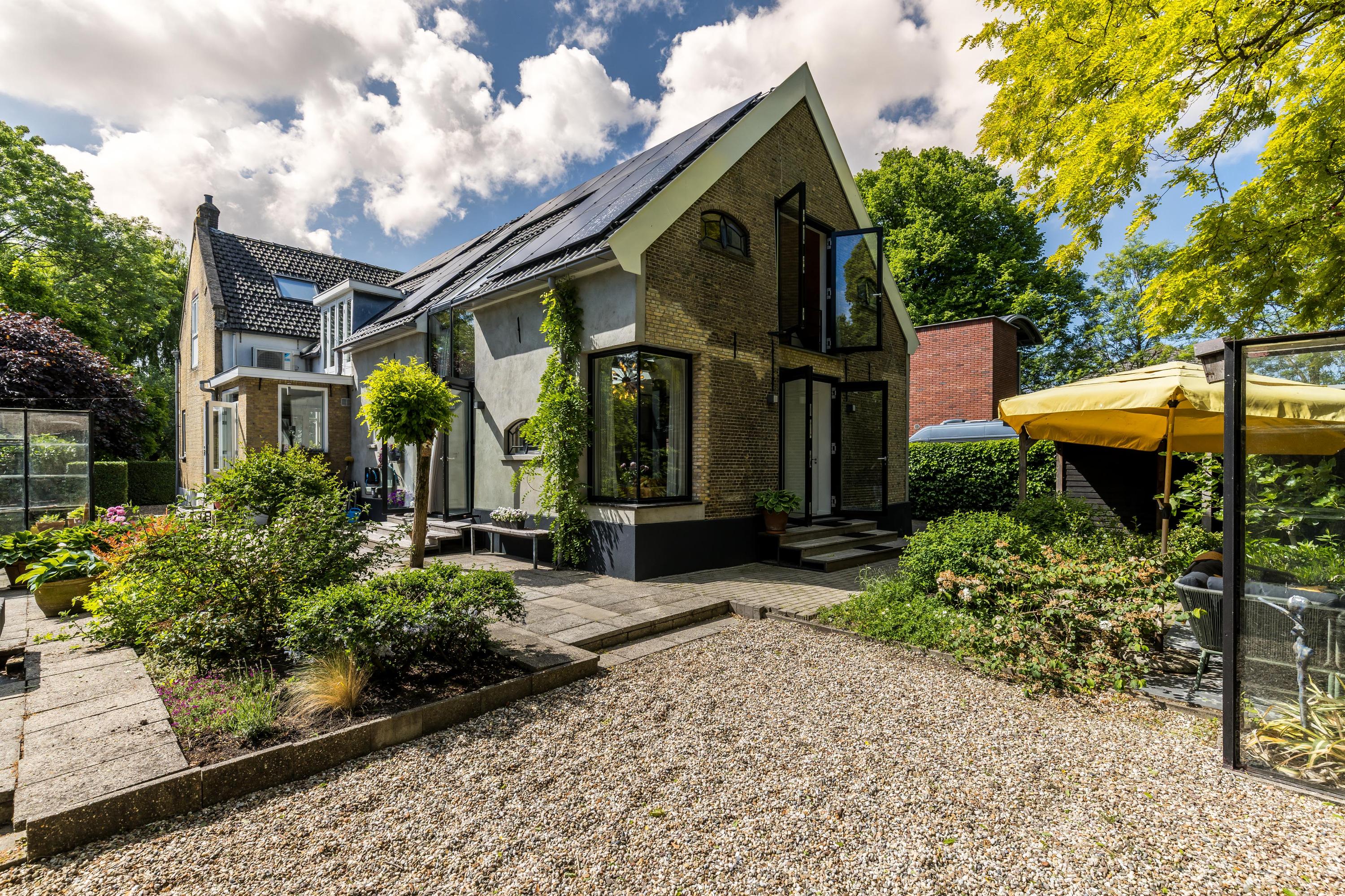 Entrance on the side of the house, spacious hall with toilet, wardrobe and staircase, attractive intermediate room with stained glass windows, cupboard space and a door to the kitchen, spacious wide living room with windows on three sides that provide lots of light, a beautiful wooden floor, high ceilings and a beautiful view, under the sitting room is also a (wine) cellar with daylight. The stained glass separation also leads to the kitchen, equipped with a kitchen unit and patio doors to the side garden and a door to the basement. From this kitchen there is access to the utility room with laundry room and heat pump installation. This utility room in turn provides access to the beautiful very spacious and garden-oriented kitchen in the back house with stairs to the first floor, a private toilet, a loft, high ceiling, large windows and patio doors to the garden.