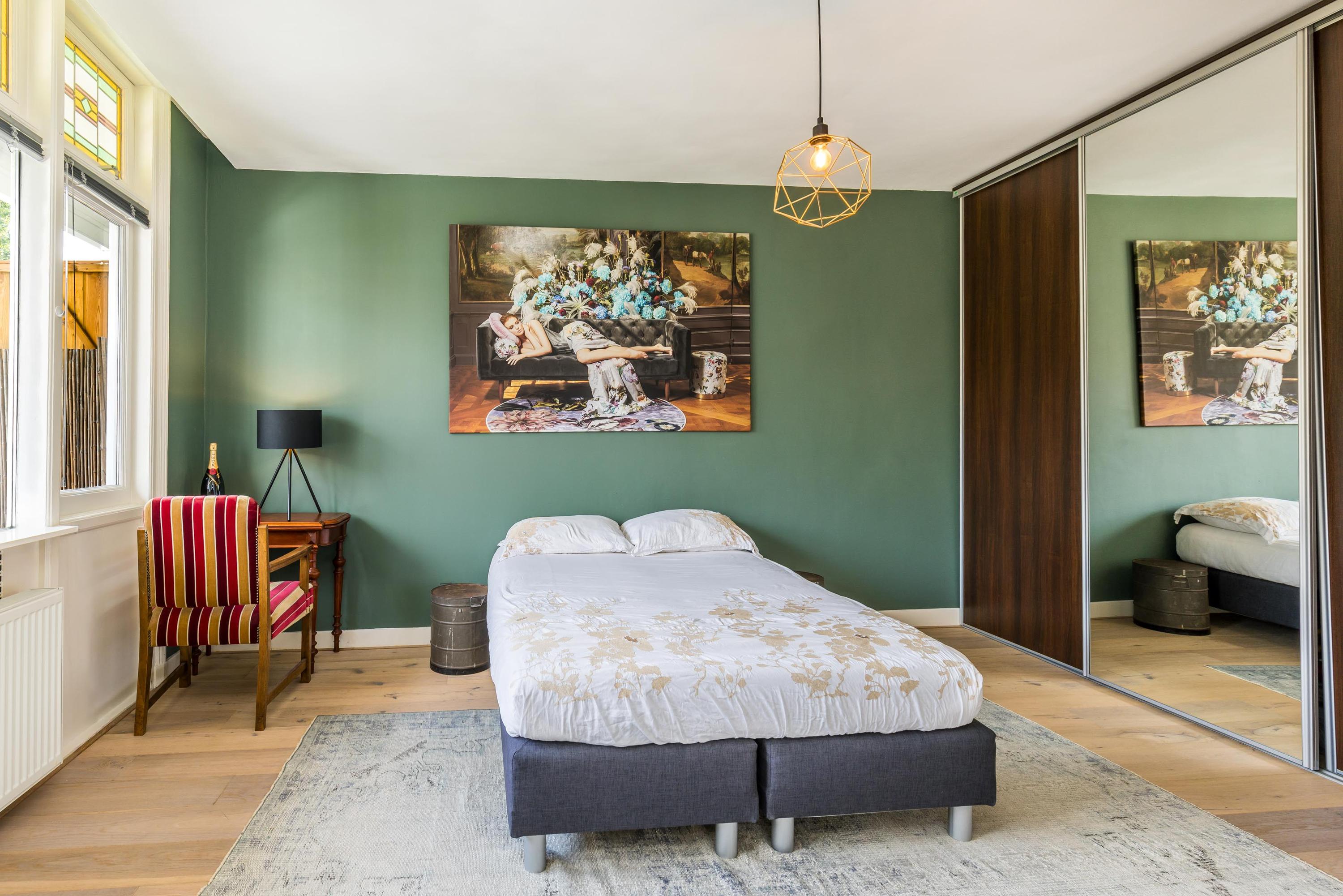 The attic floor is surprisingly spacious and currently offers one bedroom at the rear. The large room at the front has been converted into a generous walk-in closet but can easily be transformed into a very large second bedroom. The rear bedroom enjoys lovely, unobstructed garden views. There is also a second modern bathroom with a walk-in shower and washbasin, plus a practical laundry area with space for a washing machine and dryer.