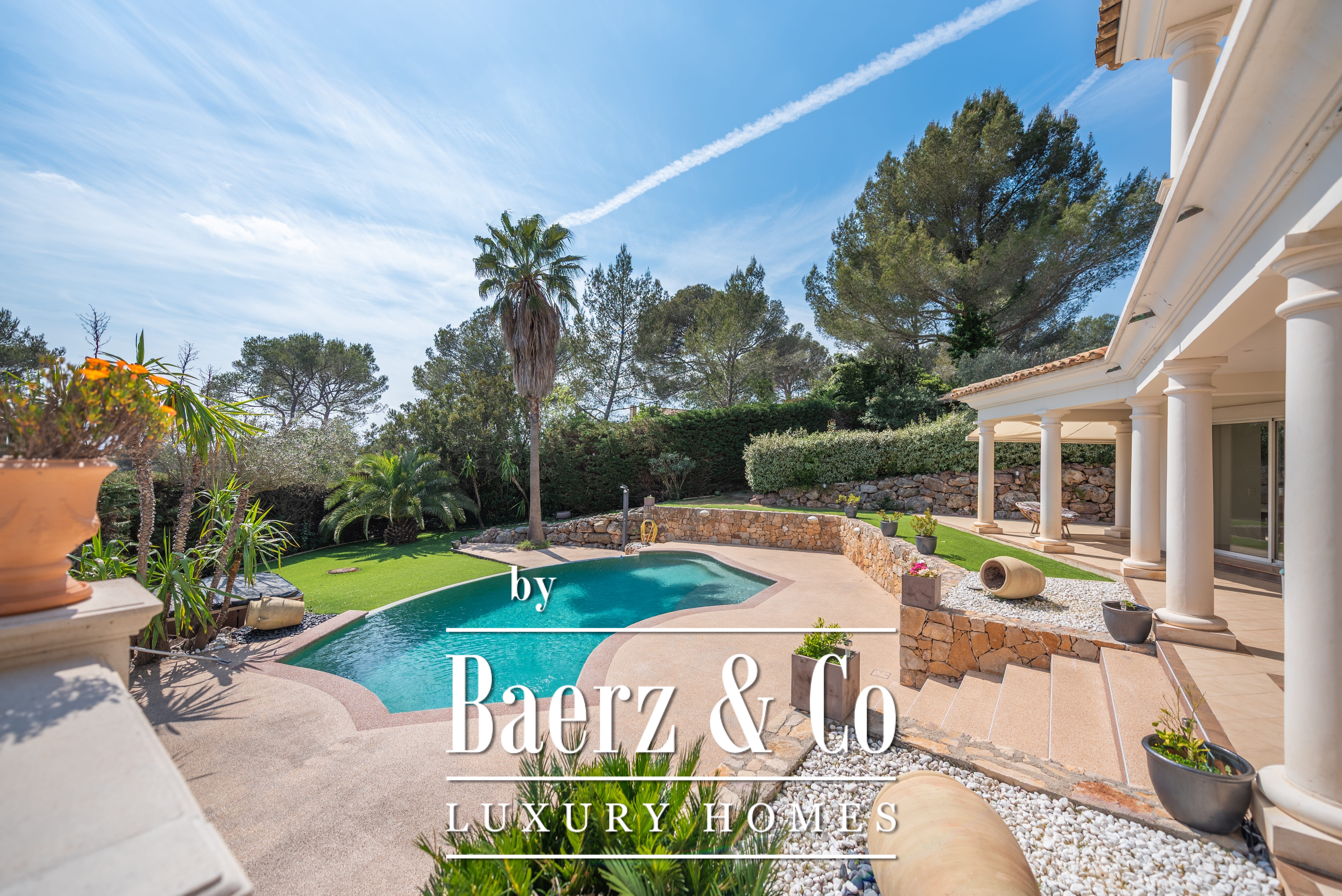 The 1,511 m² landscaped plot surrounds the home with mature gardens, multiple terraces, and an infinity pool. On the lower level, find a games room, double garage, and utility spaces. Features such as aluminum frames, central electric shutters, alarm, video surveillance, and electric gate enhance peace of mind.