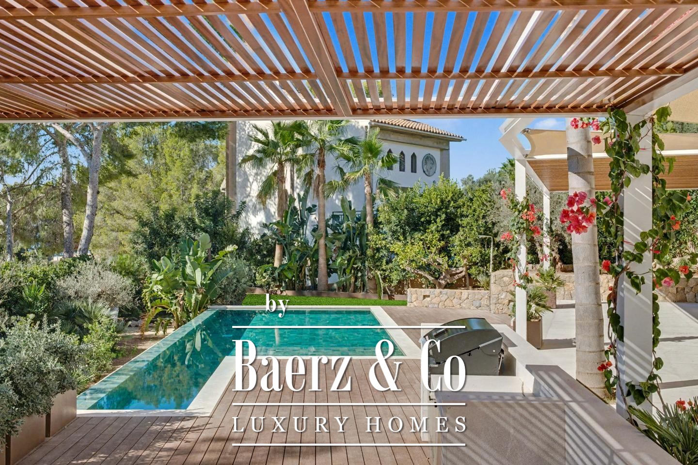 A green-tiled pool, Mediterranean garden with palms, and carefully crafted outdoor barbecue area reinforce the sense of sanctuary and ease. Villas in Sant Elm rarely present this blend of privacy, direct natural access, and modern ease, set within a coastal enclave famed for tranquil coves and access to iconic trails such as those leading toward Sa Dragonera.