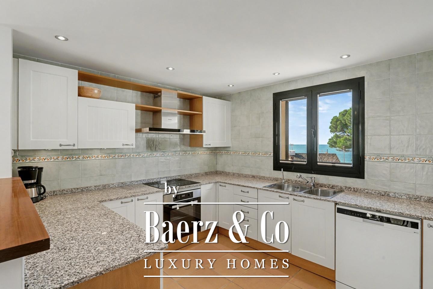 A generous entrance hall invites you into refined, luminous interiors. The living room, complete with fireplace, opens onto a terrace where the sea becomes a constant companion. An open-plan kitchen and dining area transitions to a second terrace for al fresco gatherings, connected by an exterior staircase to communal Mediterranean gardens and a pool.